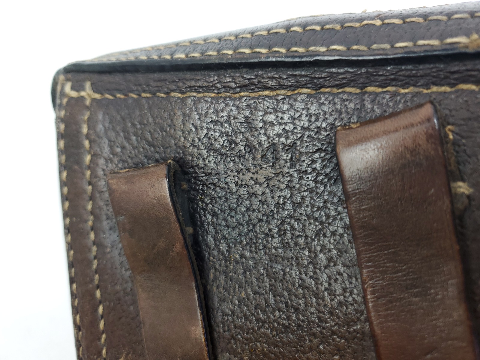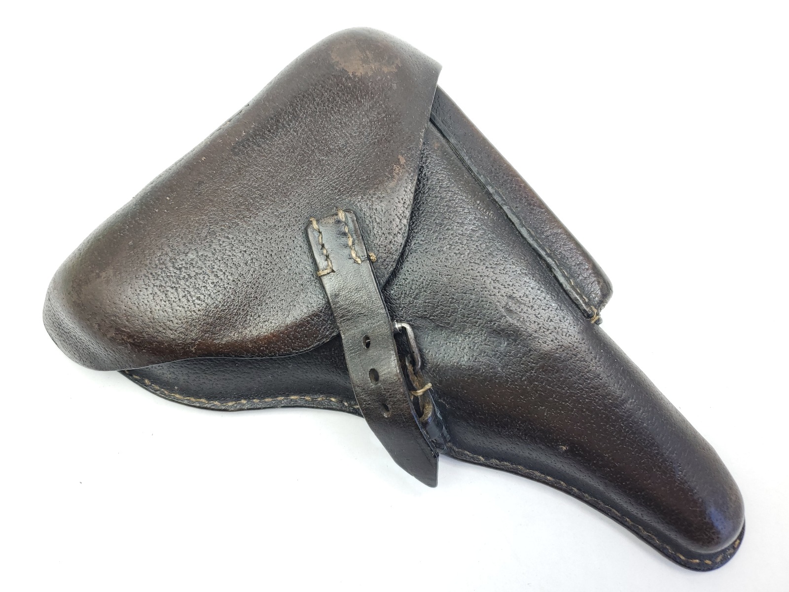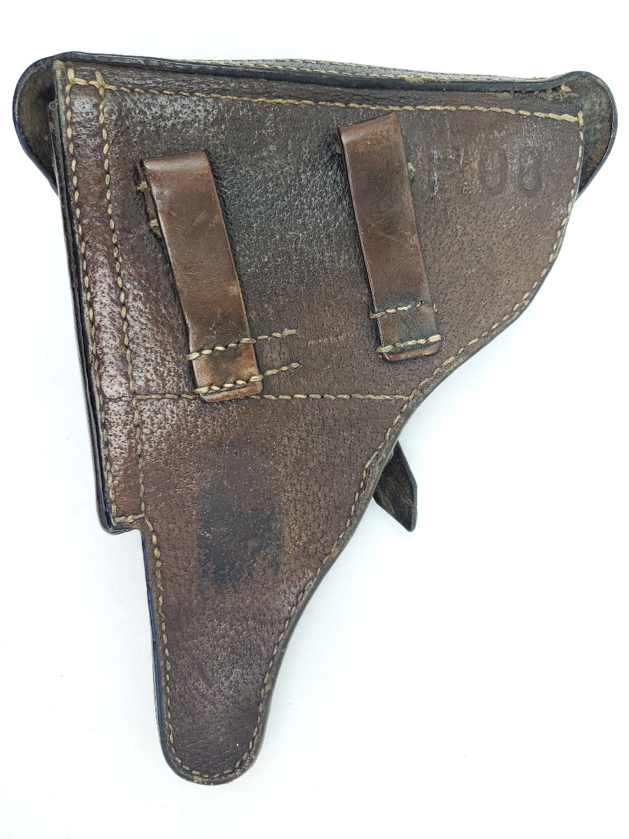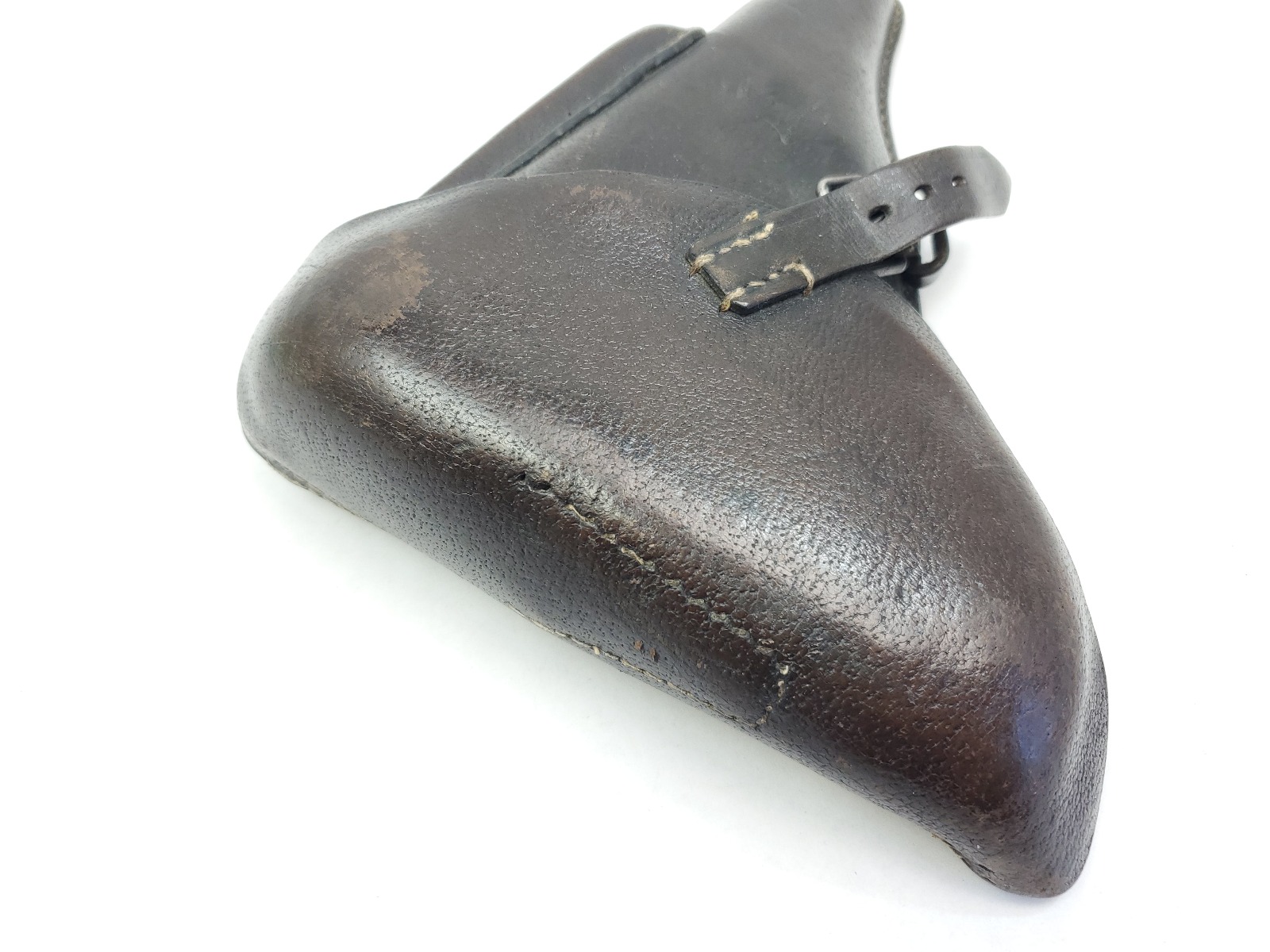 7/22/20 – This is a fairly rare, unique Luger holster from the end of Luger production. This holster is unique in that it has a ’42 ink stamp on the interior of the lid, yet the back of the holster is ’41 dated. We believe this was put together from two different pigskin pieces of leather, and made this way back in 1942. The stitching is congruent throughout the holster which helps back this theory. Also interesting is the lack of maker code on the back leather. We see a ’41 date and waffen proof but no maker code. The leather has nice shape and has faded to a brownish color, especially on the back leather. This would have been dyed black when it left the factory. Normal pliability and great stitching with minimal stitching issues.