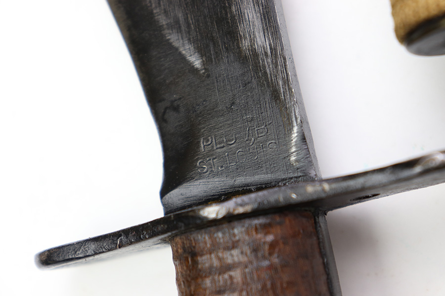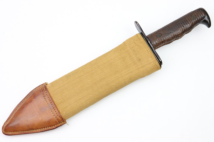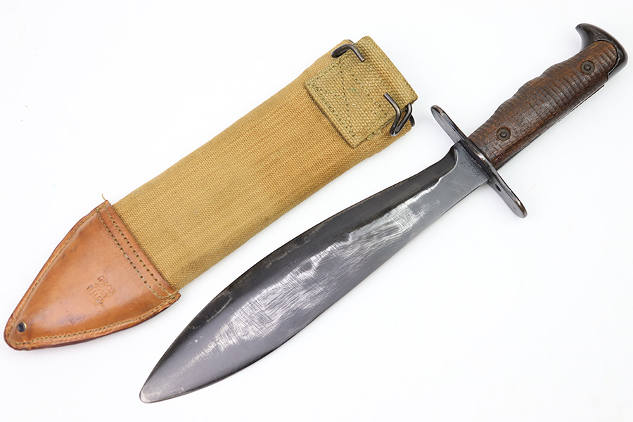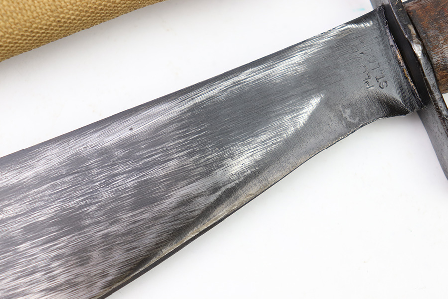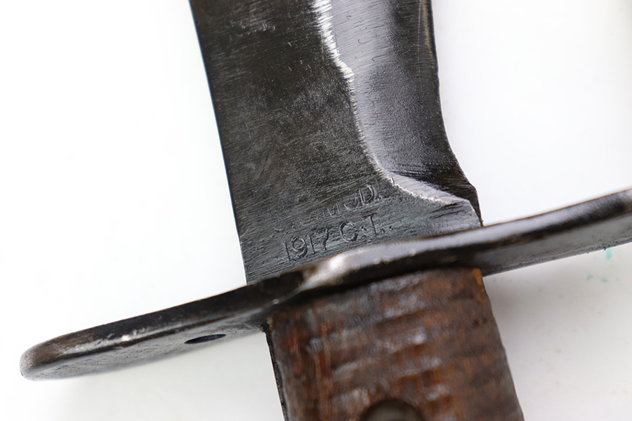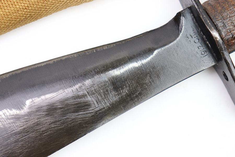 9/14/22 – This is an excellent example of a model 1917 Bolo made by Plumb during WW1. The blade, hand guard, and hilt all have most of the original dark blue/blackened finish. The blade is maker stamped on one side of the ricasso and model 1917 C.T. stamped on the reverse. The stamps are somewhat faint and weakly struck into the metal. The blade edge shows some mild signs of sharpening and there’s light scabbard rub wear throughout. The wood handle is excellent. Comes with a canvas covered scabbard that’s in excellent condition and maker stamped on the back toe.