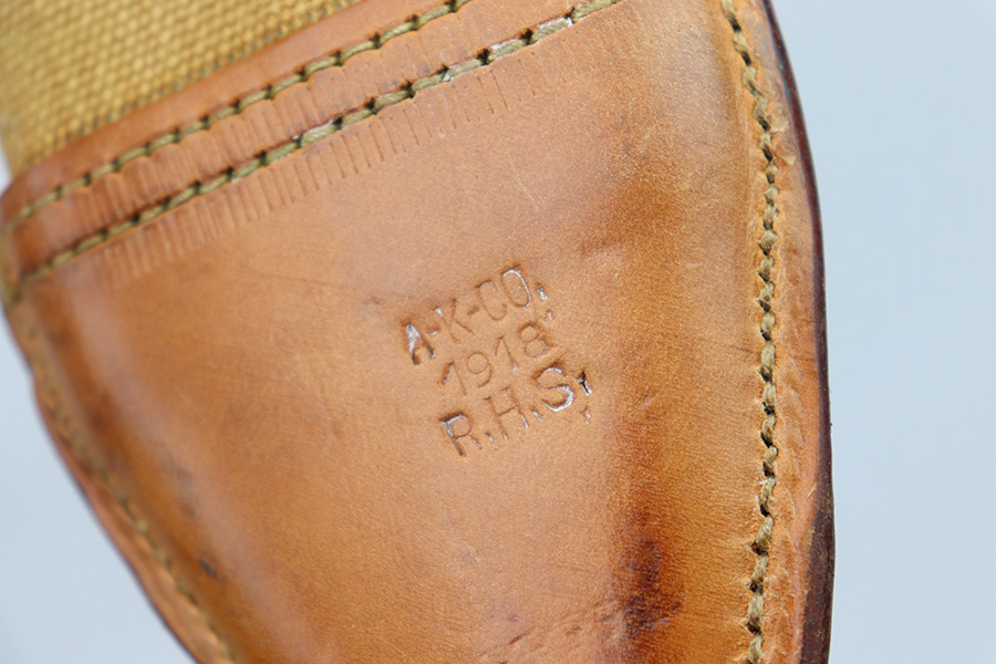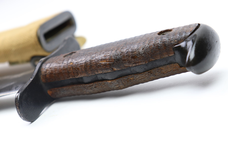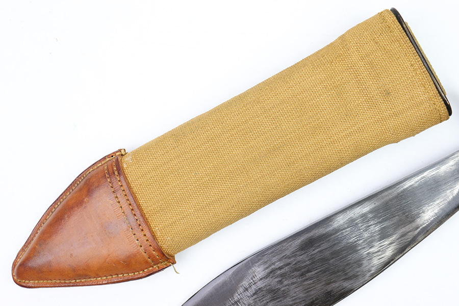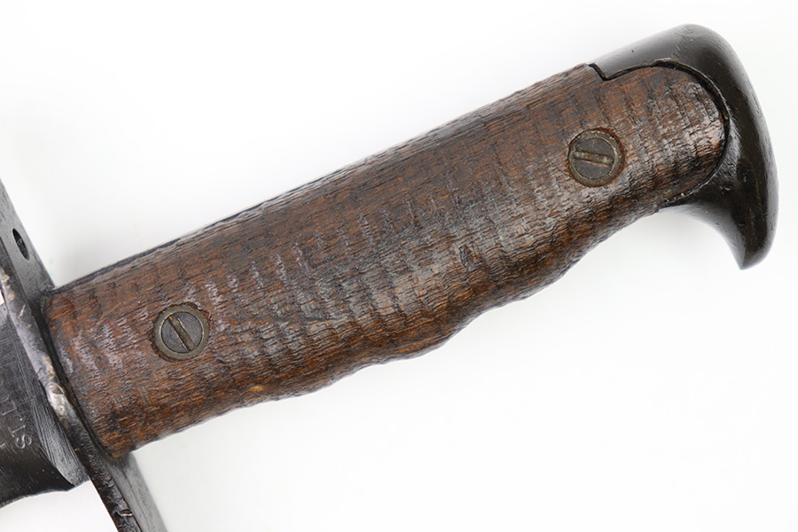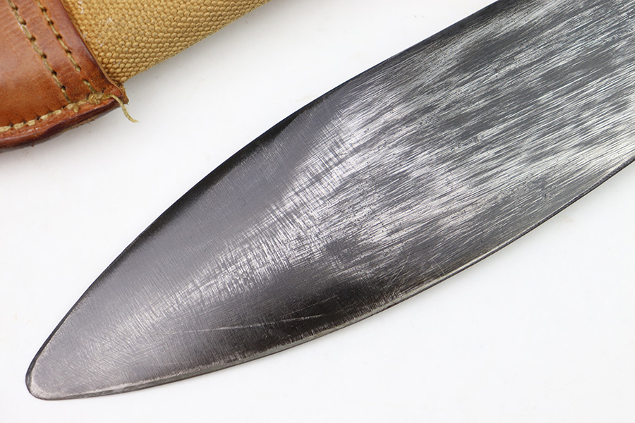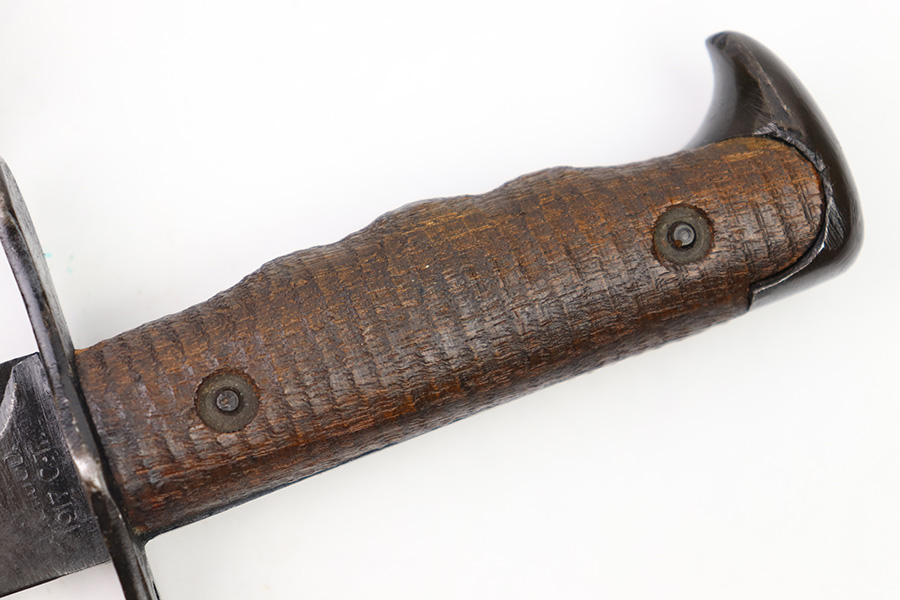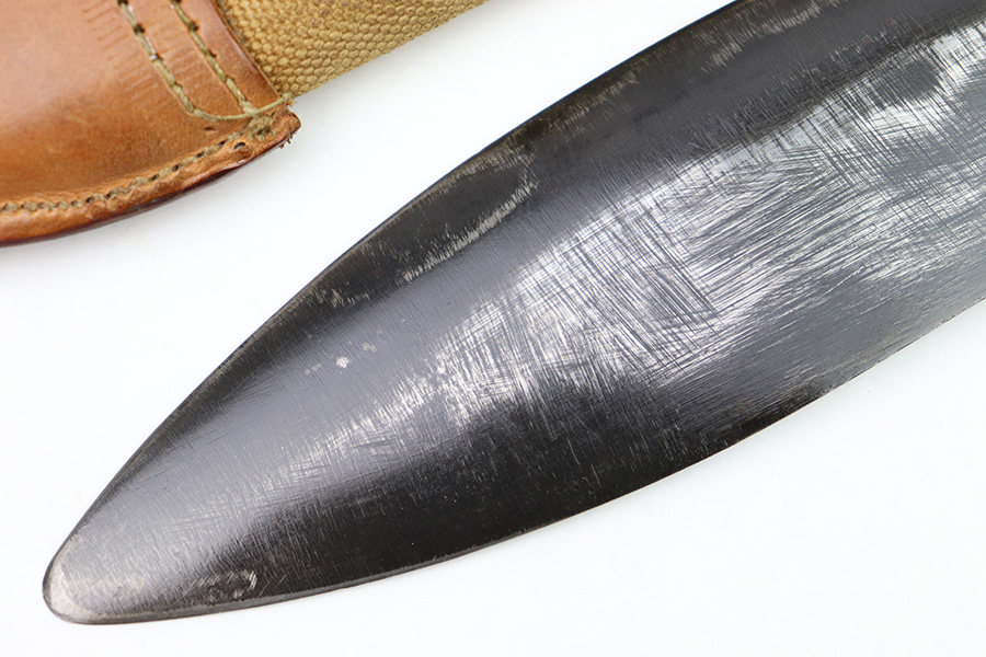 9/14/22 – This is an excellent example of a model 1917 Bolo made by Plumb during WW1. The blade, hand guard, and hilt all have most of the original dark blue/blackened finish. The blade is maker stamped on one side of the ricasso and model 1917 C.T. stamped on the reverse. The stamps are somewhat faint and weakly struck into the metal. The blade edge shows some mild signs of sharpening and there’s light scabbard rub wear throughout. The wood handle is excellent. Comes with a canvas covered scabbard that’s in excellent condition and maker stamped on the back toe.