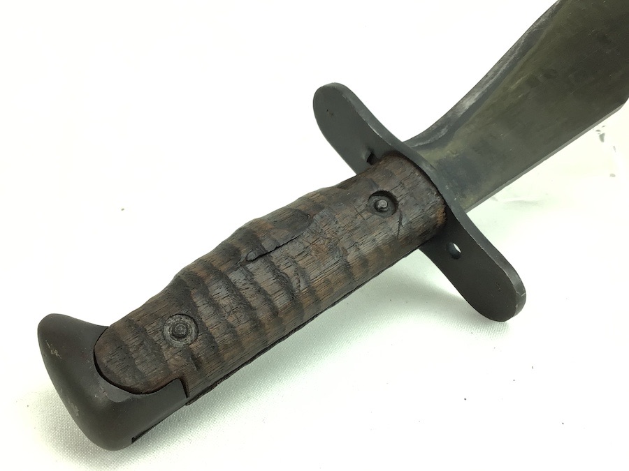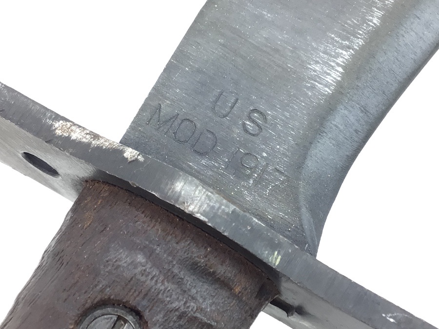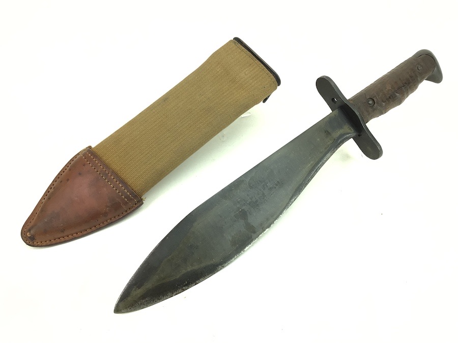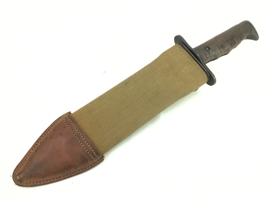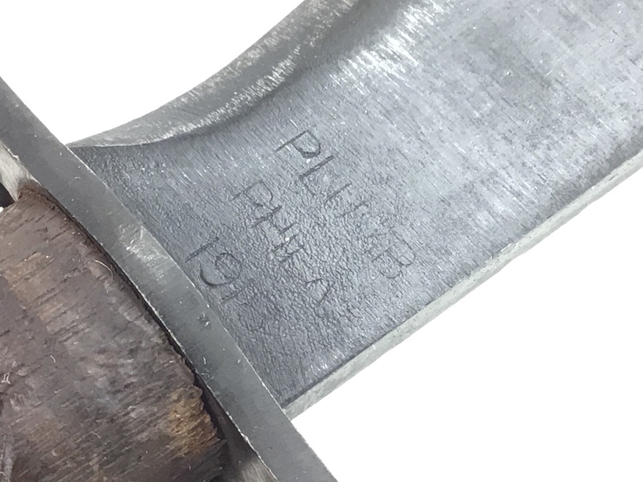 8/24/24 – This is an original US Model 1917 Bolo Knife. The knife comes with an original canvas covered metal scabbard. The knife blade has a dark blued finish that’s generally clean with normal scabbard rub wear and light surface scratches throughout. The edge shows light signs of sharpening and use. One side of the blade base is stamped “US MOD 1917” and the other side is stamped “PLUMB PHILA 1918”. There’s light patina on the hand guard and pommel, but no major issues. Great condition wood handles. The scabbard is excellent with the leather tip / toe still intact with a clearly visible AKCO maker and date stamp.