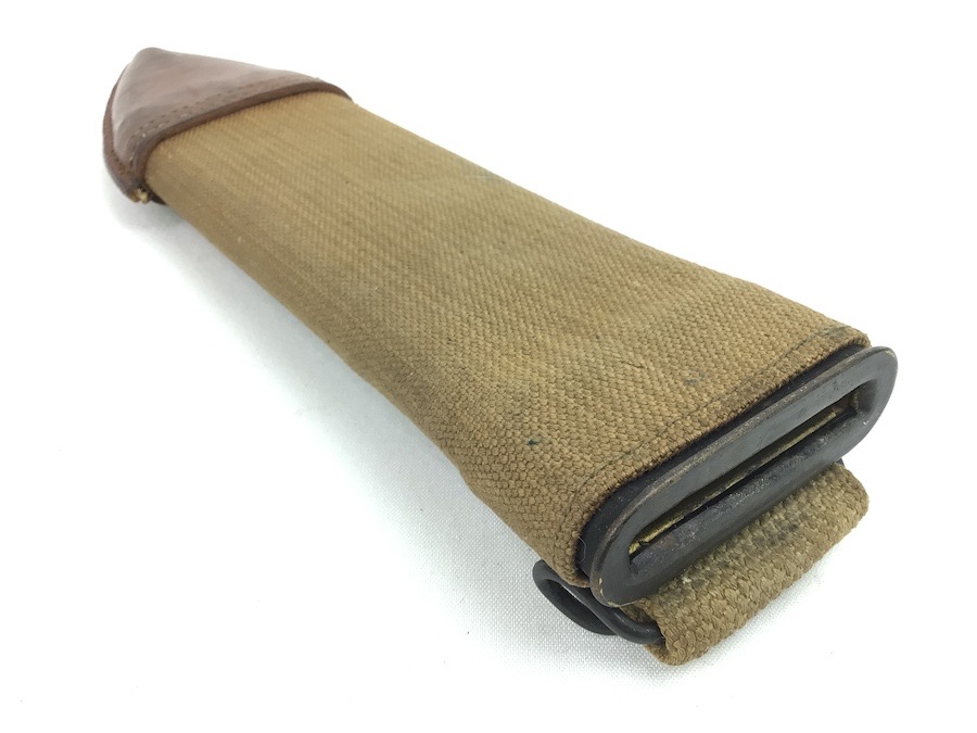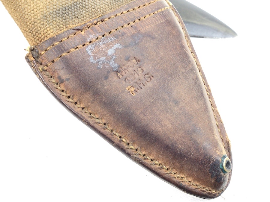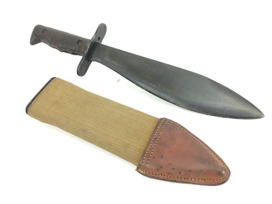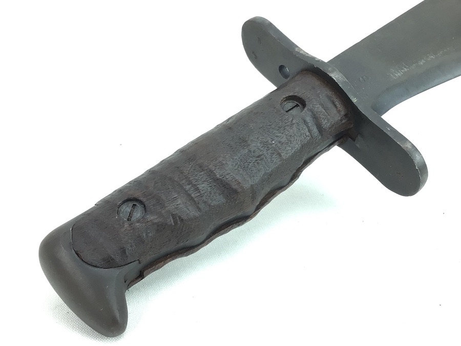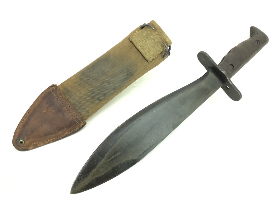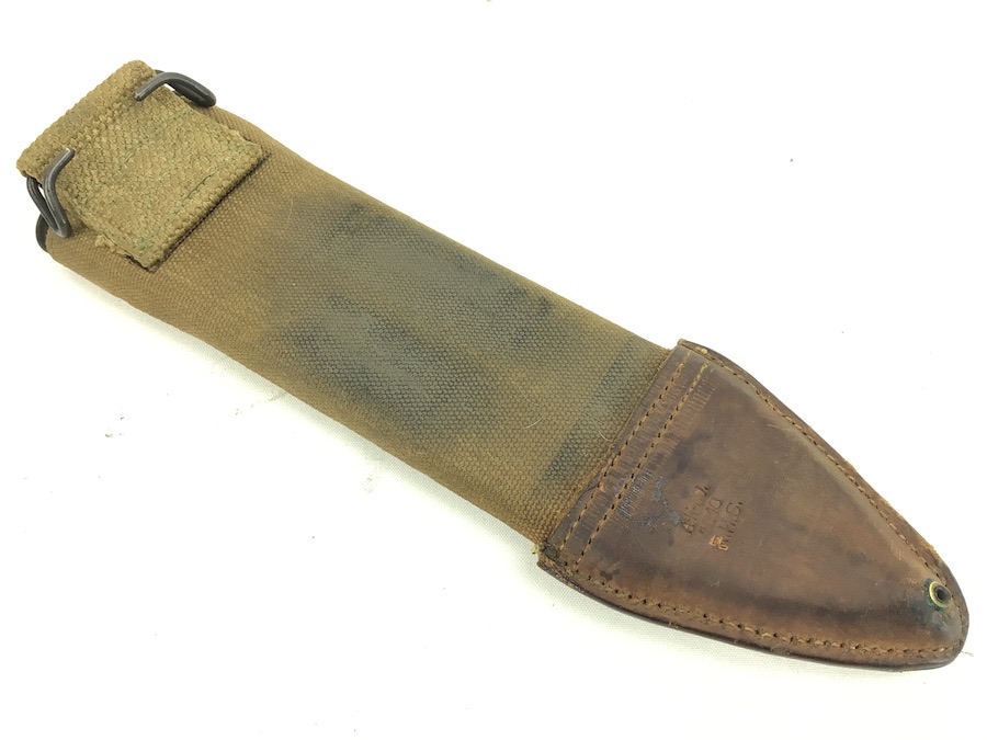 8/24/24 – This is an original US Model 1917 Bolo Knife. The knife comes with an original canvas covered metal scabbard. The knife blade has a dark blued finish that’s generally clean with normal scabbard rub wear and light surface scratches throughout. The edge shows light signs of sharpening and use. One side of the blade base is stamped “US MOD 1917” and the other side is stamped “PLUMB PHILA 1918”. There’s light patina on the hand guard and pommel, but no major issues. Great condition wood handles. The scabbard is excellent with the leather tip / toe still intact with a clearly visible AKCO maker and date stamp.
