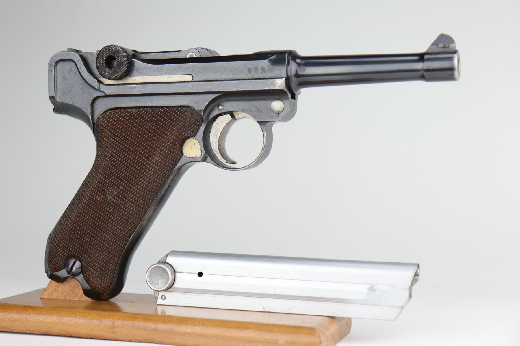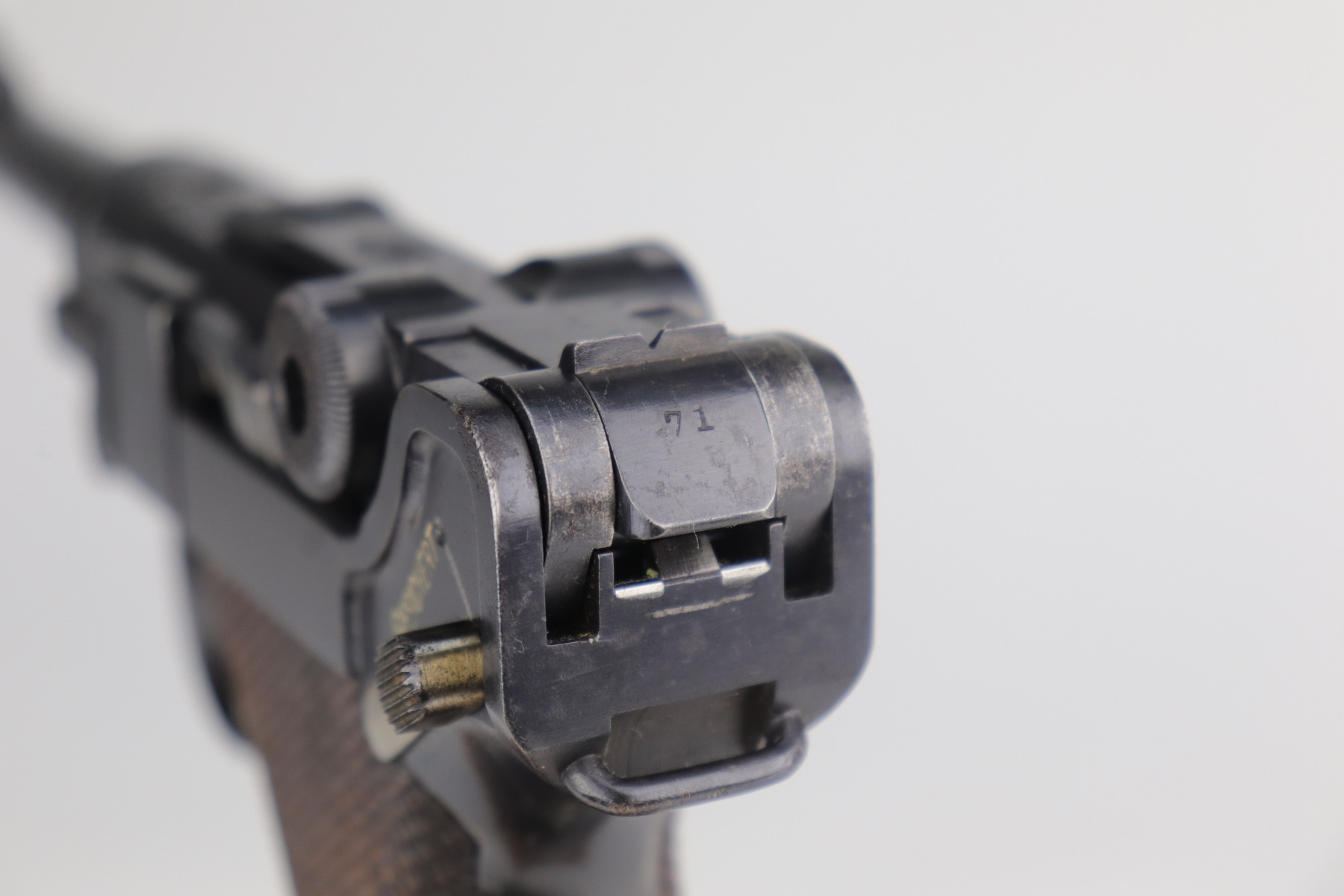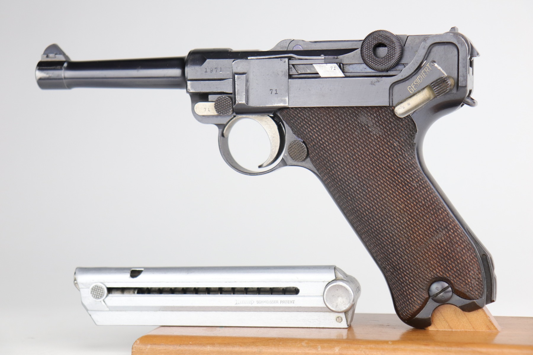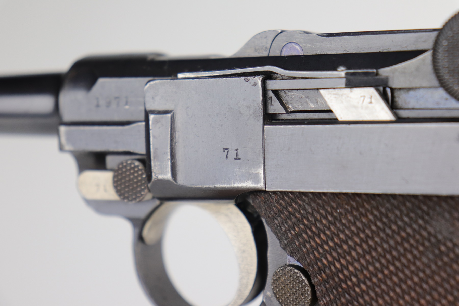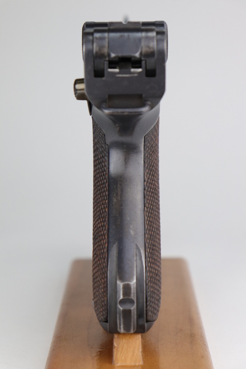 12/31/20 – This is a nice 1915 DWM Luger with an interesting history. It was issued to the German Imperial military during WW1 and was later diverted to the German police force. It is all matching and has the proper Imperial military proofs. After WW1, a police seer safety was added and a matching magazine was made at the police arsenal. It has retained about 90% of its original finish. There is minor wear around the muzzle, the side plate, and high edges of the frame. There is spotty wear on the straps and spotty oxidation throughout. The bore is minty. Comes with one matching magazine. Excellent period-correct grips. One panel matches the gun.