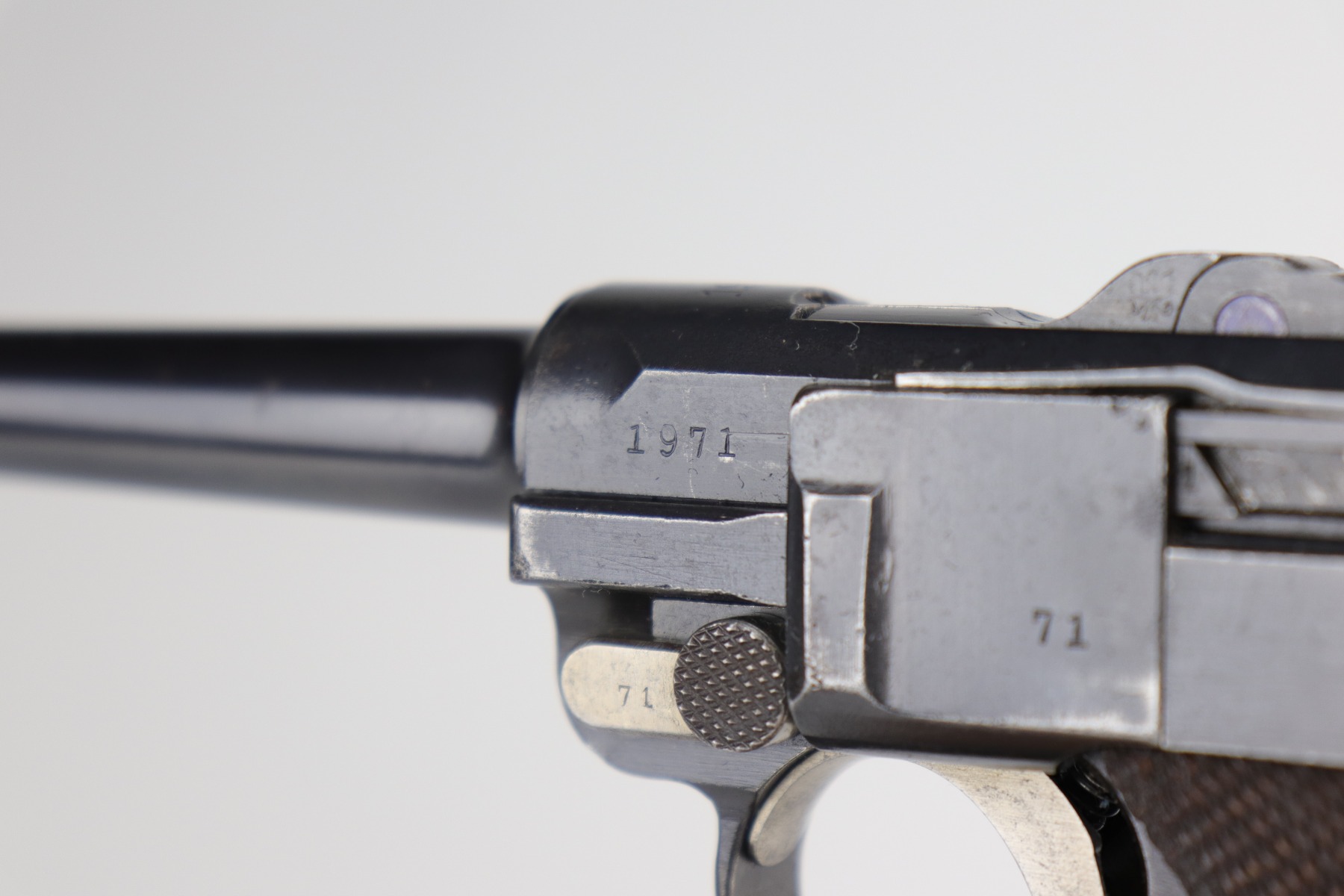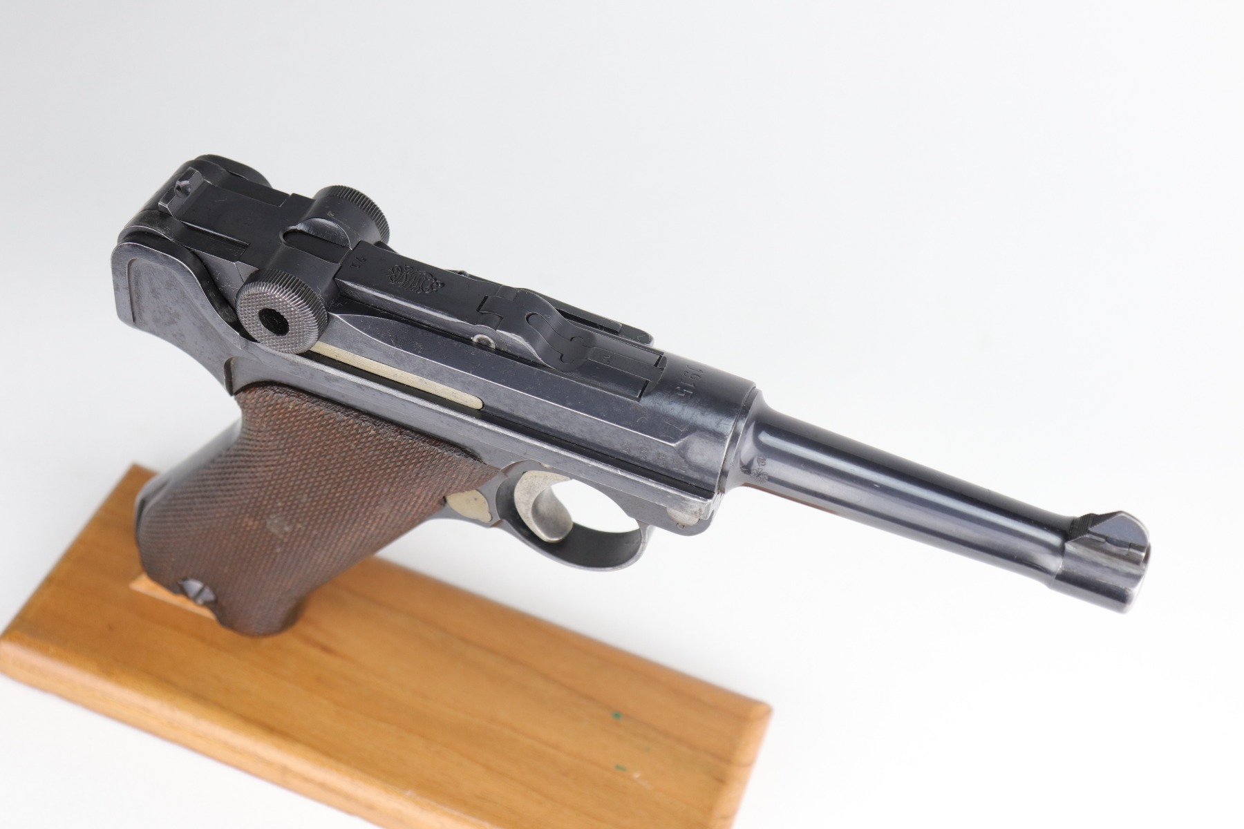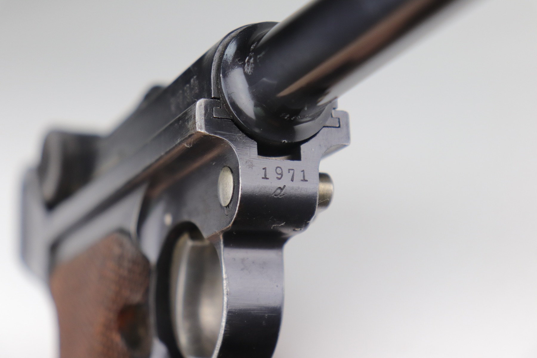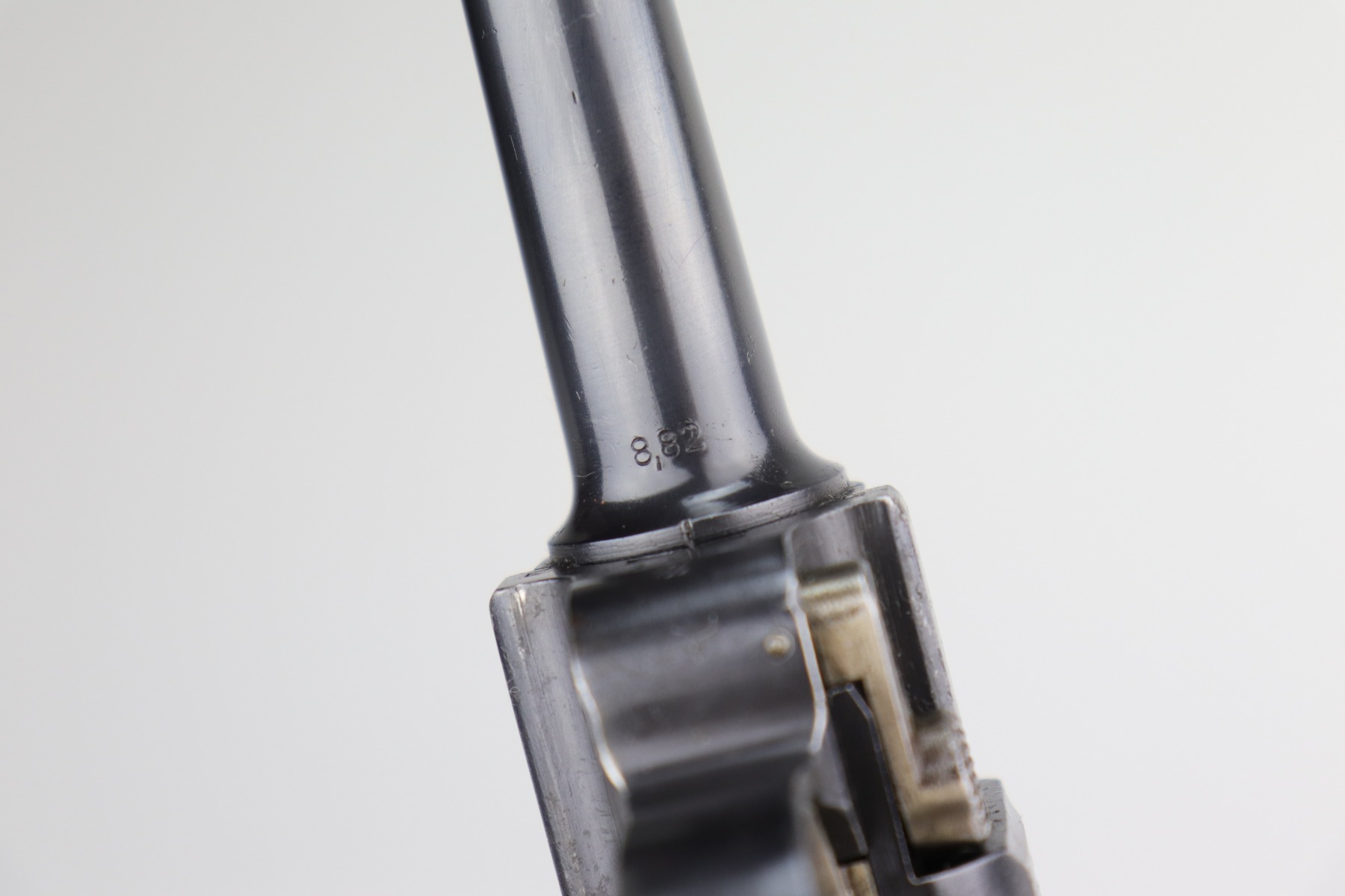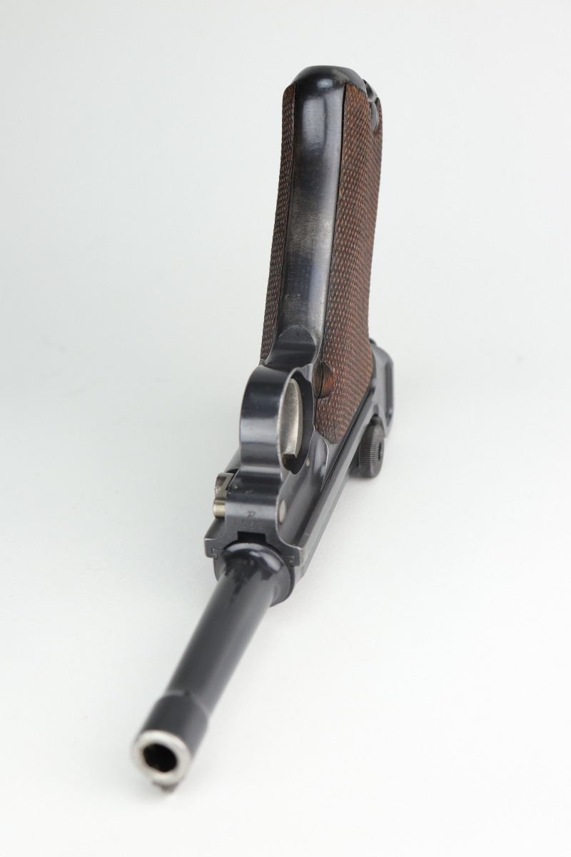 12/31/20 – This is a nice 1915 DWM Luger with an interesting history. It was issued to the German Imperial military during WW1 and was later diverted to the German police force. It is all matching and has the proper Imperial military proofs. After WW1, a police seer safety was added and a matching magazine was made at the police arsenal. It has retained about 90% of its original finish. There is minor wear around the muzzle, the side plate, and high edges of the frame. There is spotty wear on the straps and spotty oxidation throughout. The bore is minty. Comes with one matching magazine. Excellent period-correct grips. One panel matches the gun.