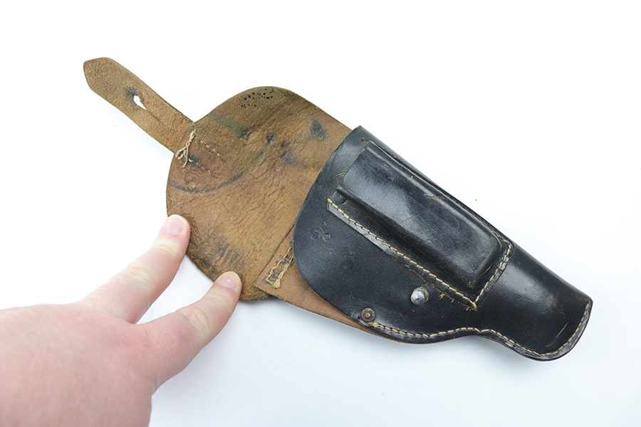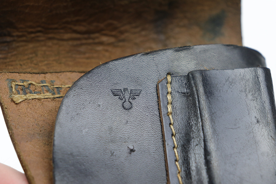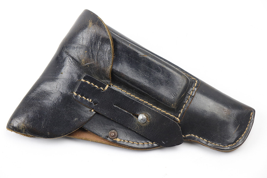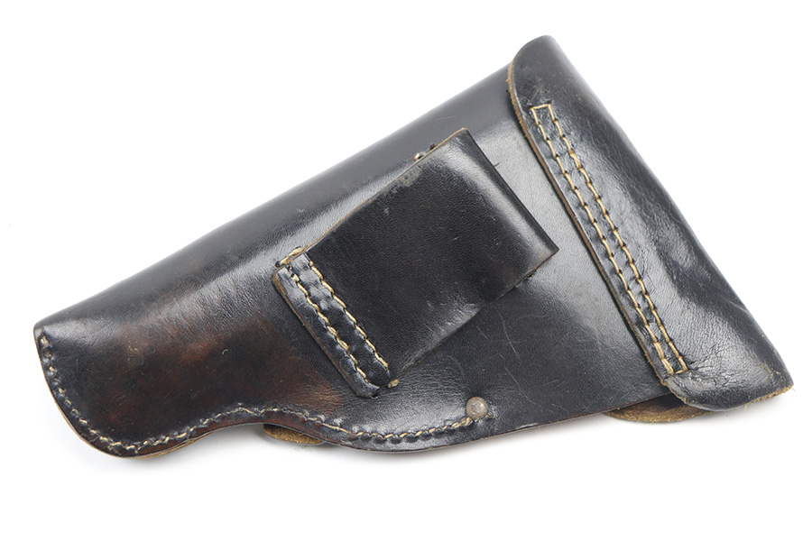 11/2/21 – This is an original Police issued 7.65mm pistol holster from WW2. The holster is police Nazi eagle stamped under the closure strap. There’s also an ink stamp on the interior leather as shown. Fits a HSC, 38h, or PPK pistol. Very nice black leather and excellent original stitching is all in tact.