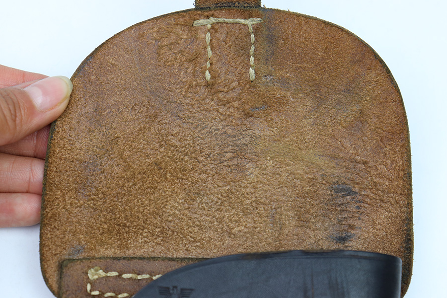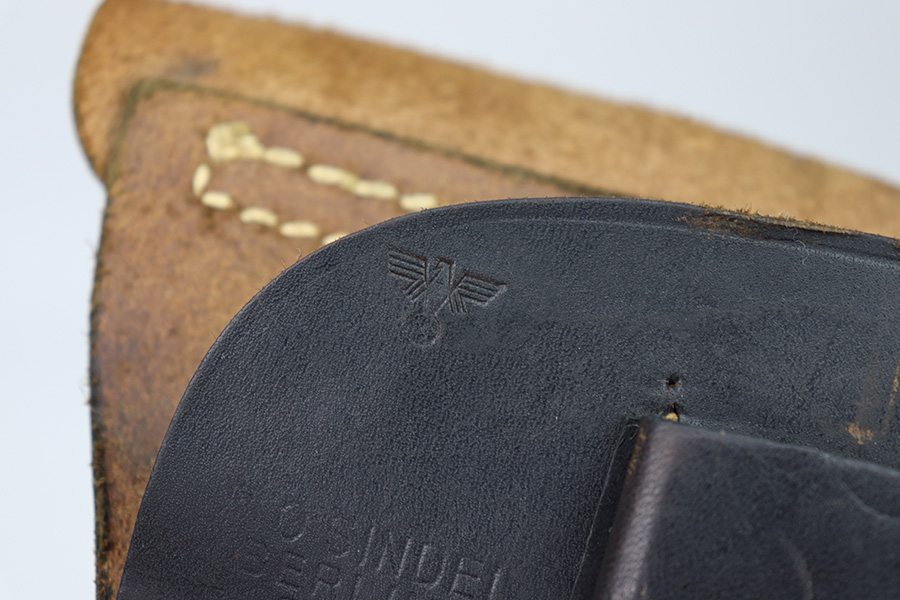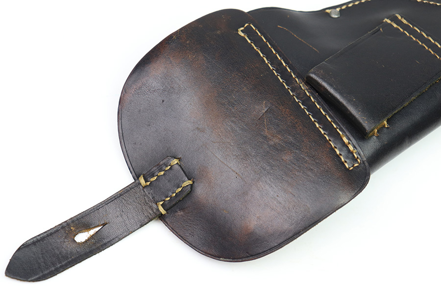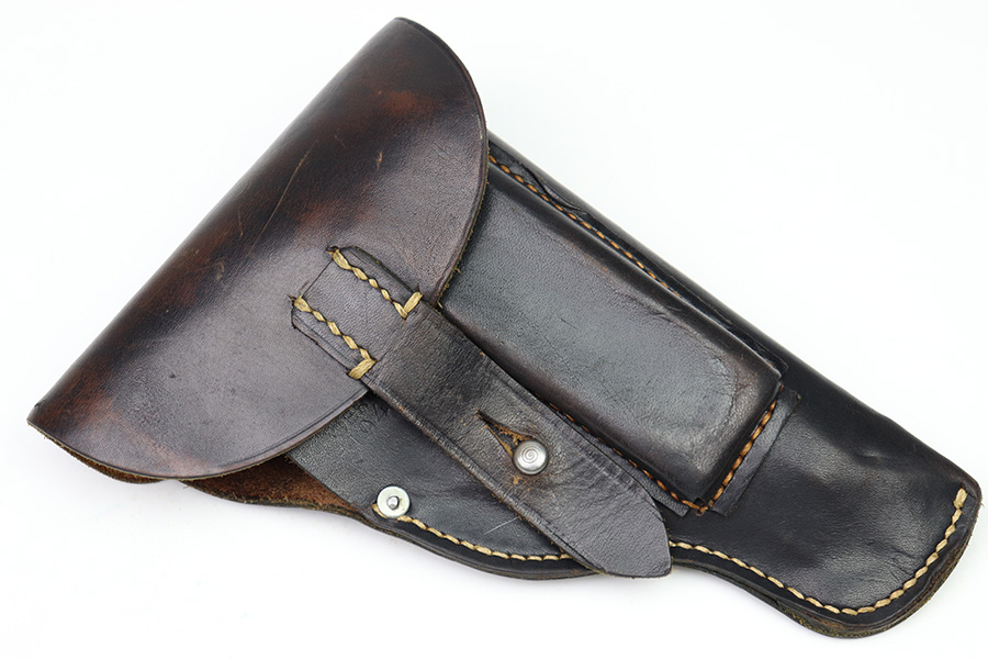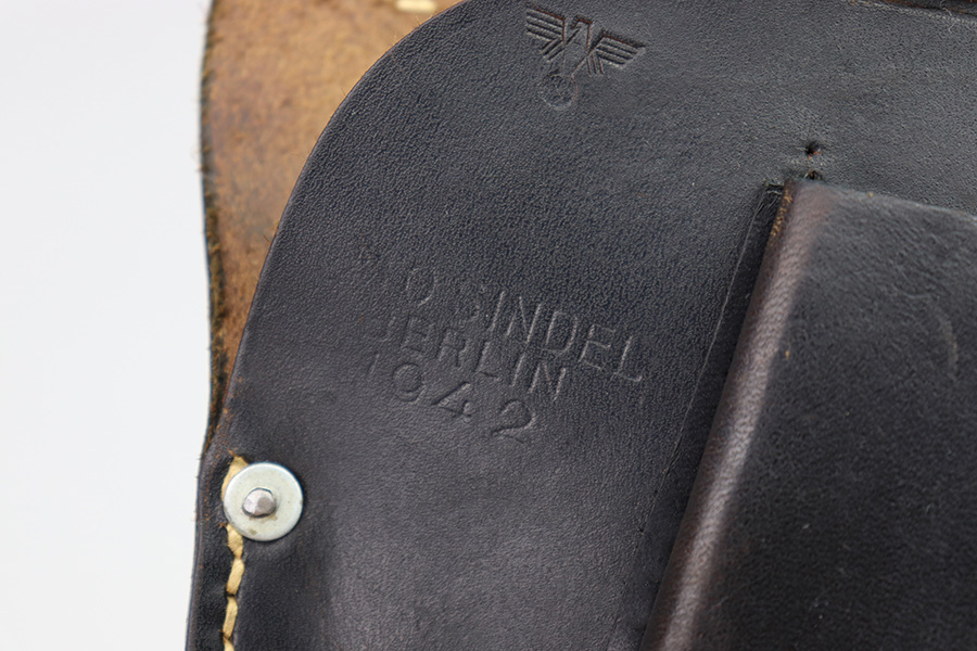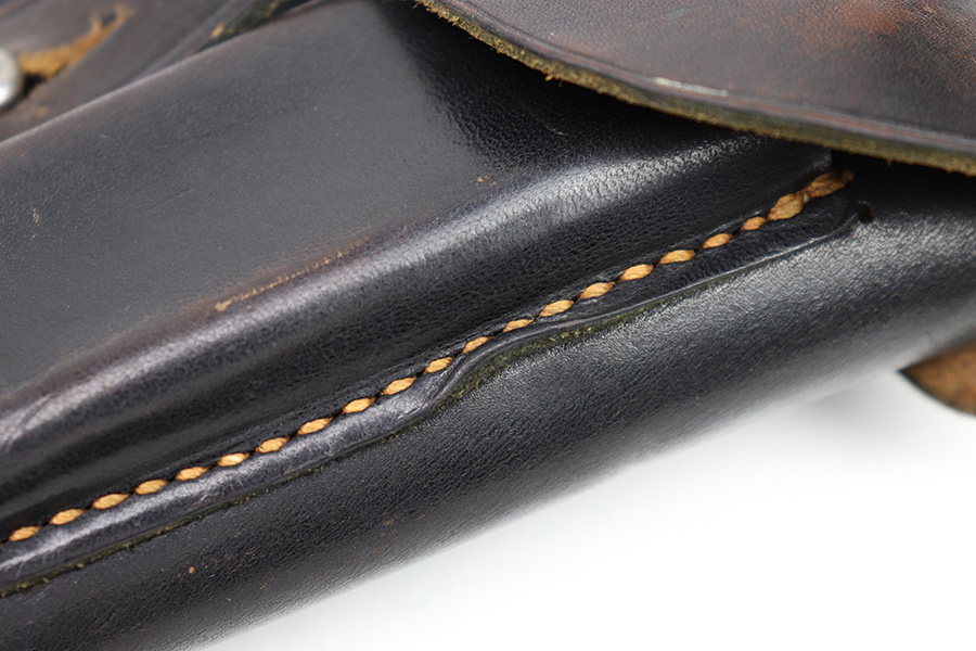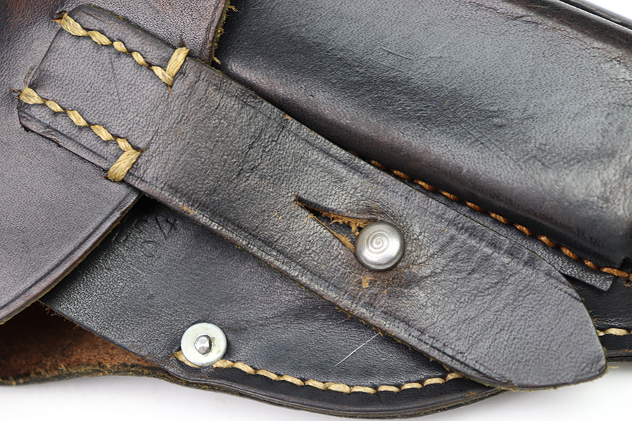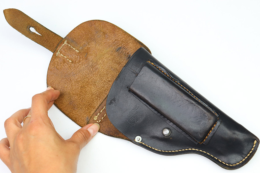 10/20/22 – This is an original 1942 dated Police issued holster for a 7.65mm Axis pistol such as the Sauer 38h, Walther PPK, or Mauser HSC. The holster fits most 7.65mm Axis pistols. The front leather is maker stamped, dated, and police eagle proof stamped. The leather shows typical signs of use wear and aging without excessive wear or damage. Normal pliability and fairly clean interior. No stitching issues.