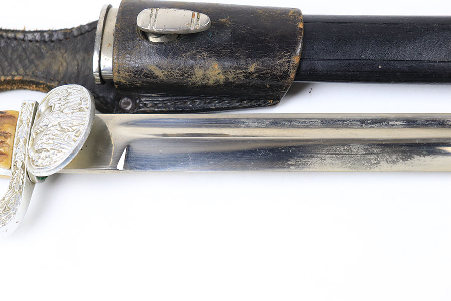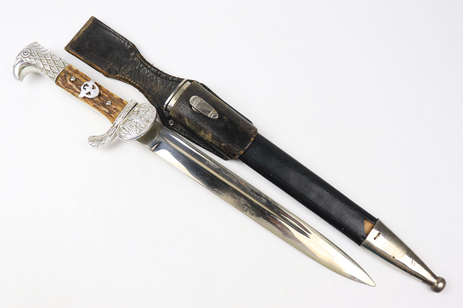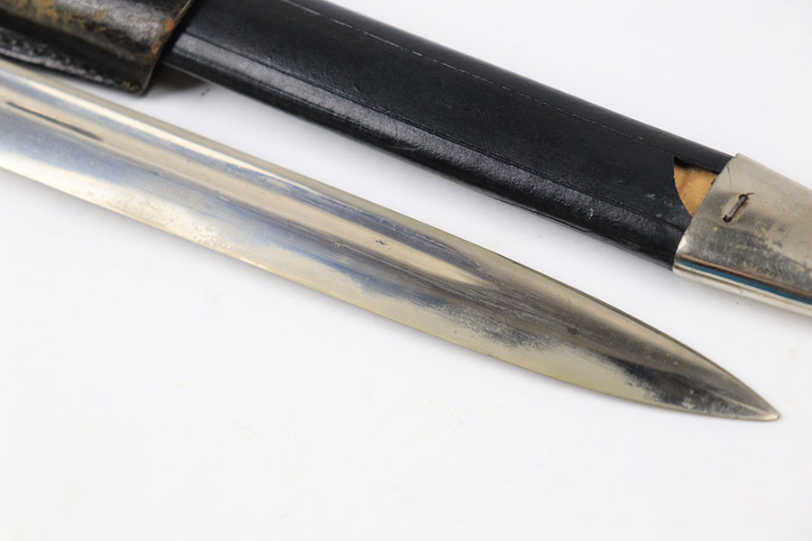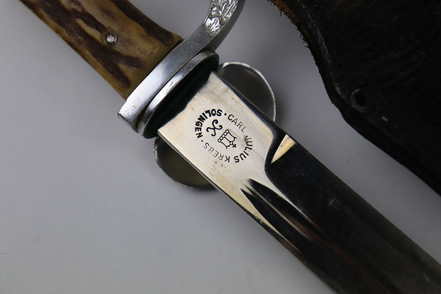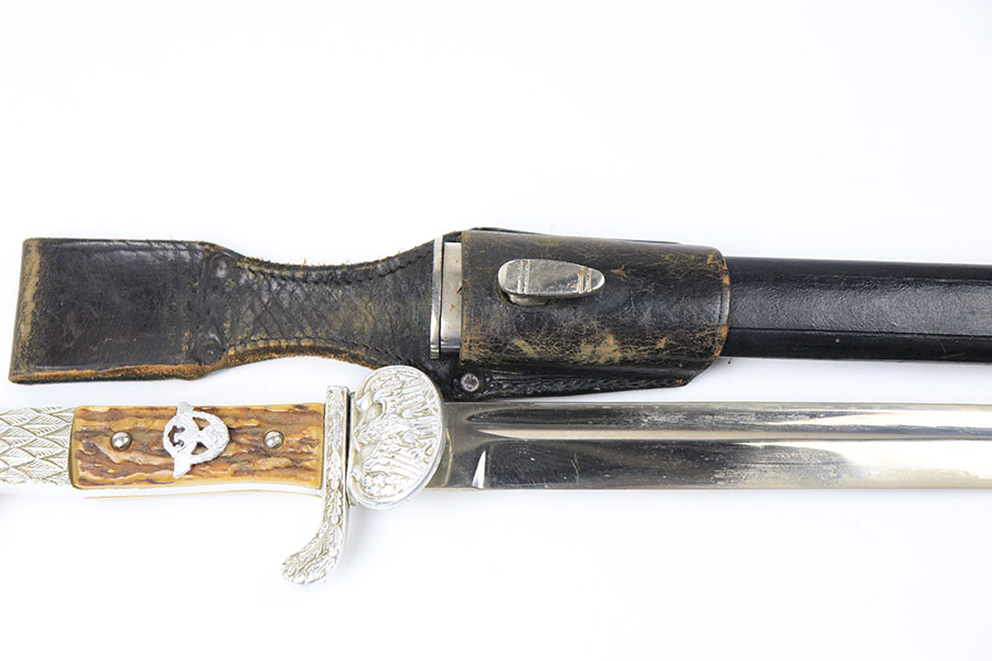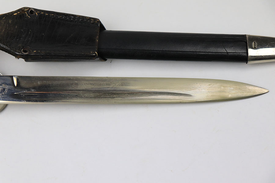 11/12/21 – This is an original WW2 Nazi Police Parade / Dress bayonet. The bayonet is the shortened variation with a clamshell. The blade is approximately 10 inches long. The blade is in great condition with some mild surface patina but no rust or pitting. Maker stamped on the reverse by Julius Krebs. The clamshell, metal fittings, and police emblem are all in great condition. Nice stag grips as well. The scabbard presents the biggest issue, with the metal tip not being secure – it can be removed / fall off as shown. Price reduced accordingly.