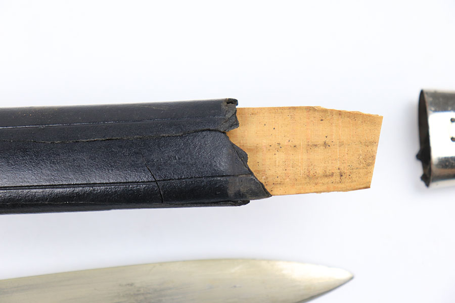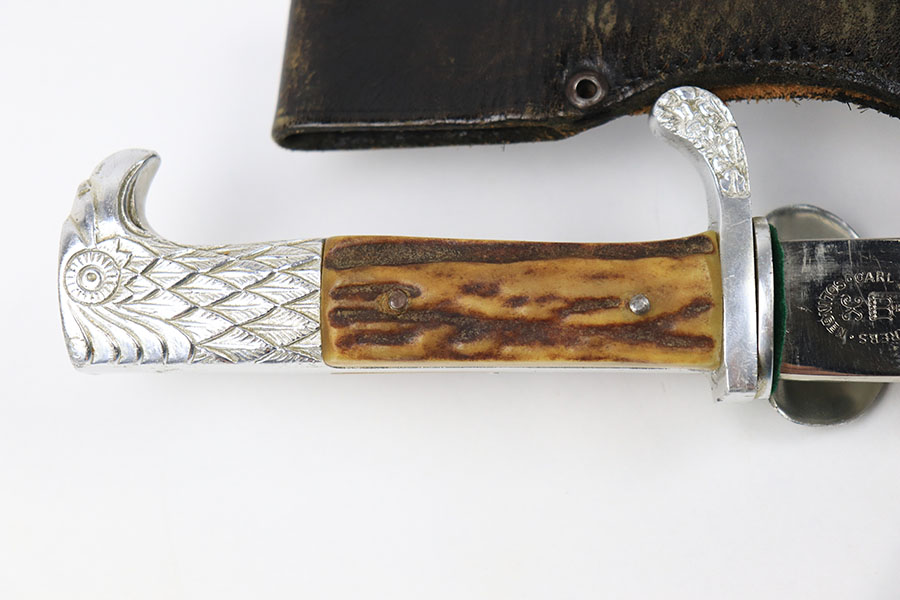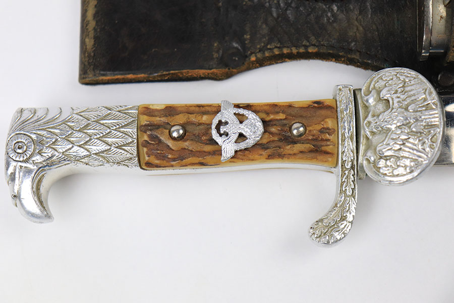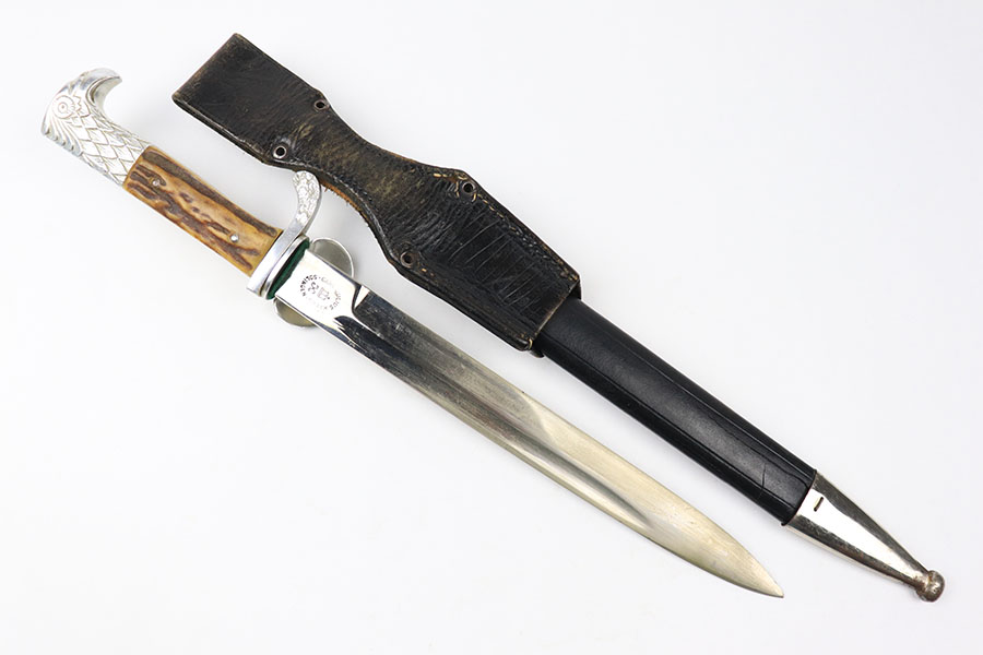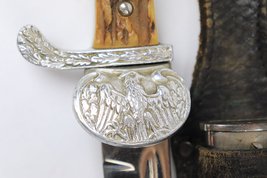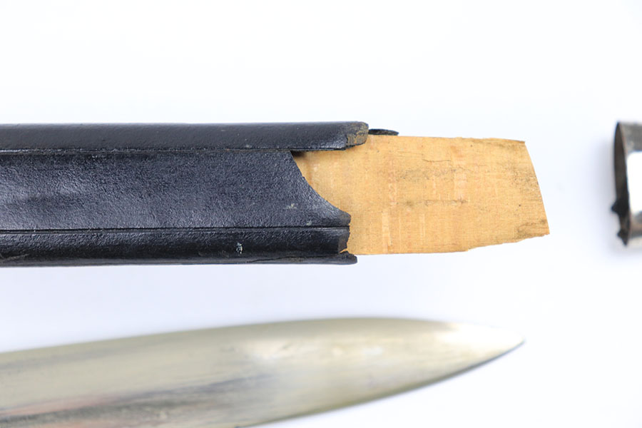 11/12/21 – This is an original WW2 Nazi Police Parade / Dress bayonet. The bayonet is the shortened variation with a clamshell. The blade is approximately 10 inches long. The blade is in great condition with some mild surface patina but no rust or pitting. Maker stamped on the reverse by Julius Krebs. The clamshell, metal fittings, and police emblem are all in great condition. Nice stag grips as well. The scabbard presents the biggest issue, with the metal tip not being secure – it can be removed / fall off as shown. Price reduced accordingly.