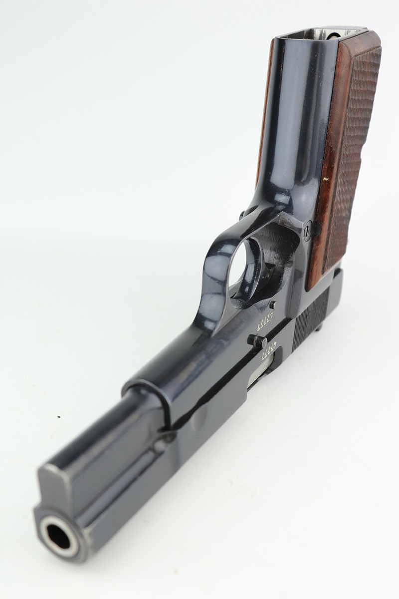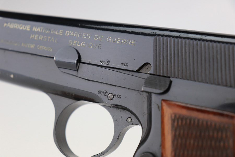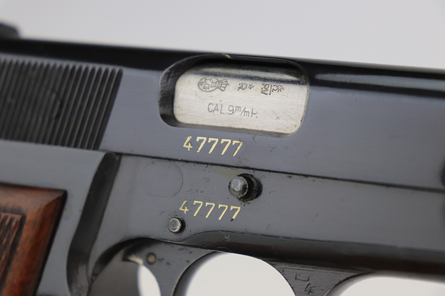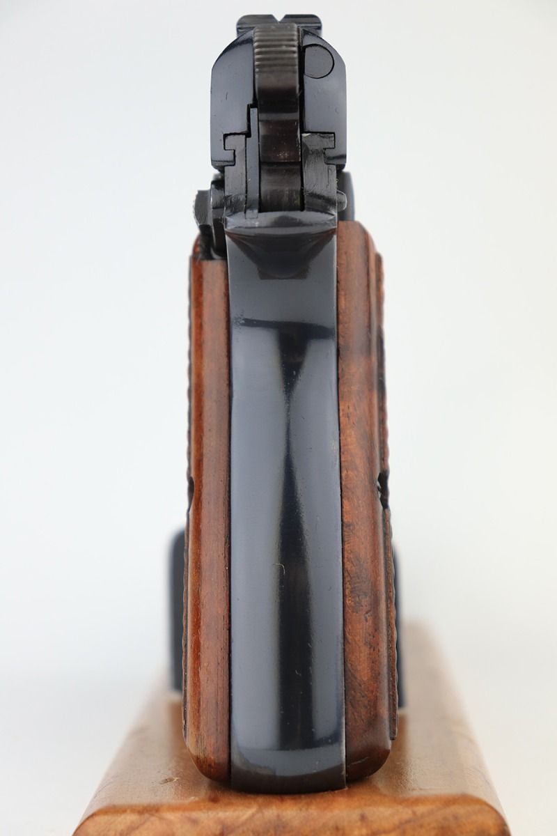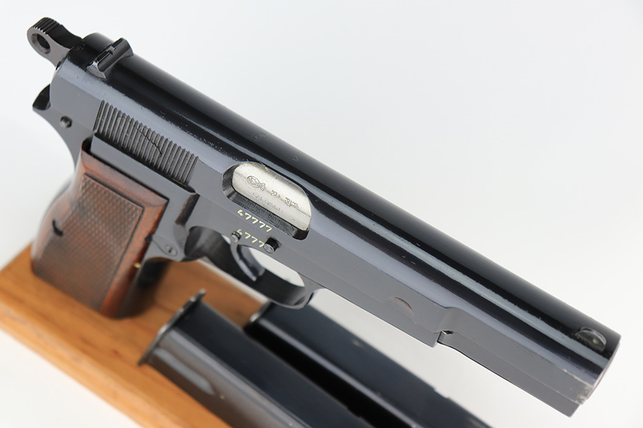 4/4/23 – This is a minty FN Browning Hi Power from the early 1950’s that went to the West German Police and has two matching numbered magazines. The pistol is all matching and original with 98% of the blue remaining. Just a little wear around the muzzle, and a spot of wear along the underside of the frame. Minty bore and grips.