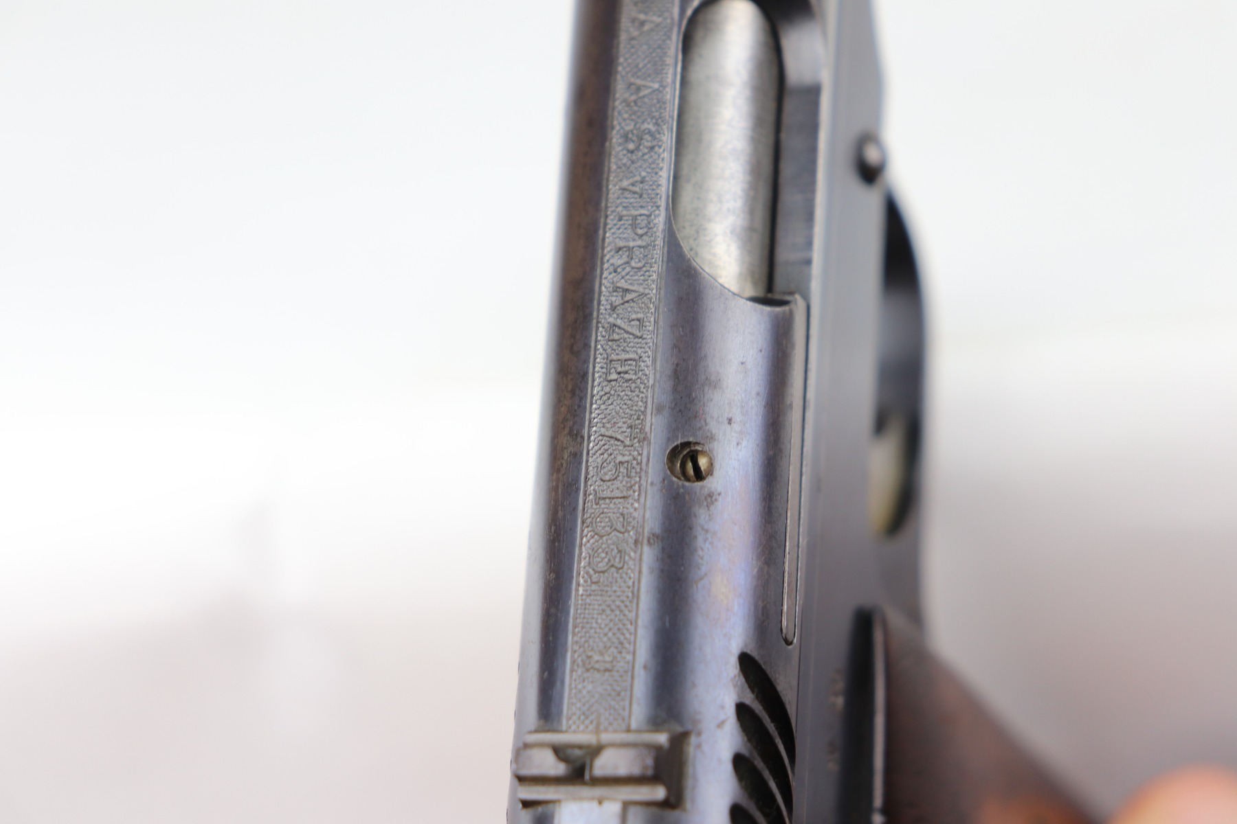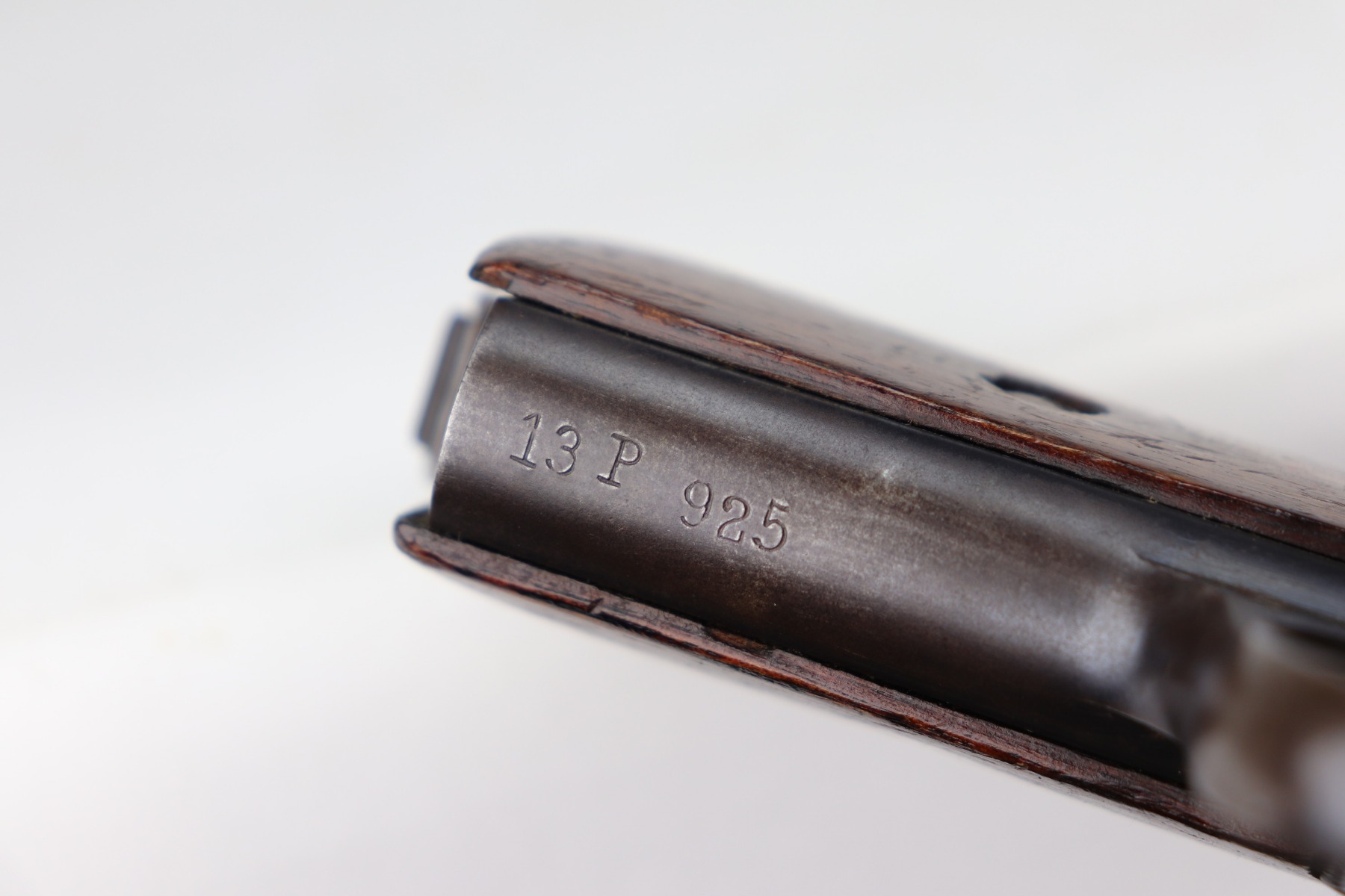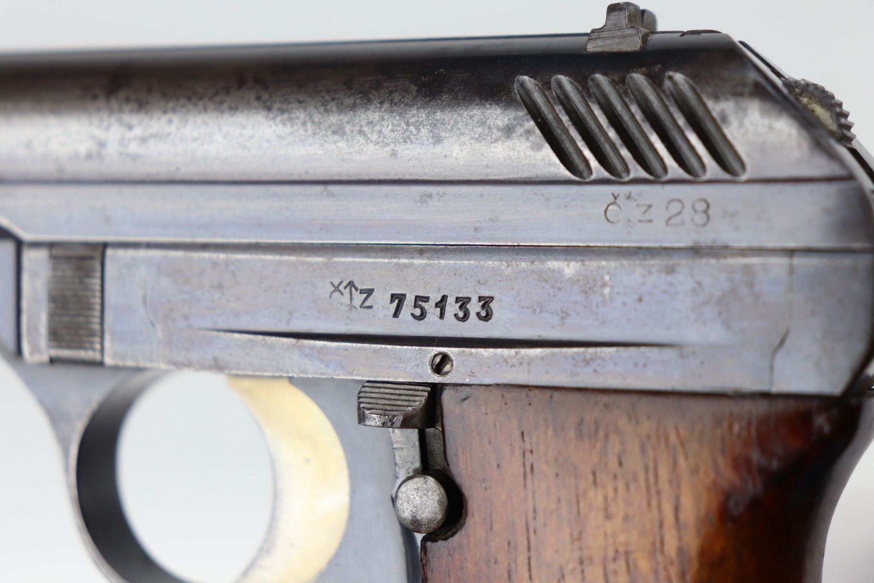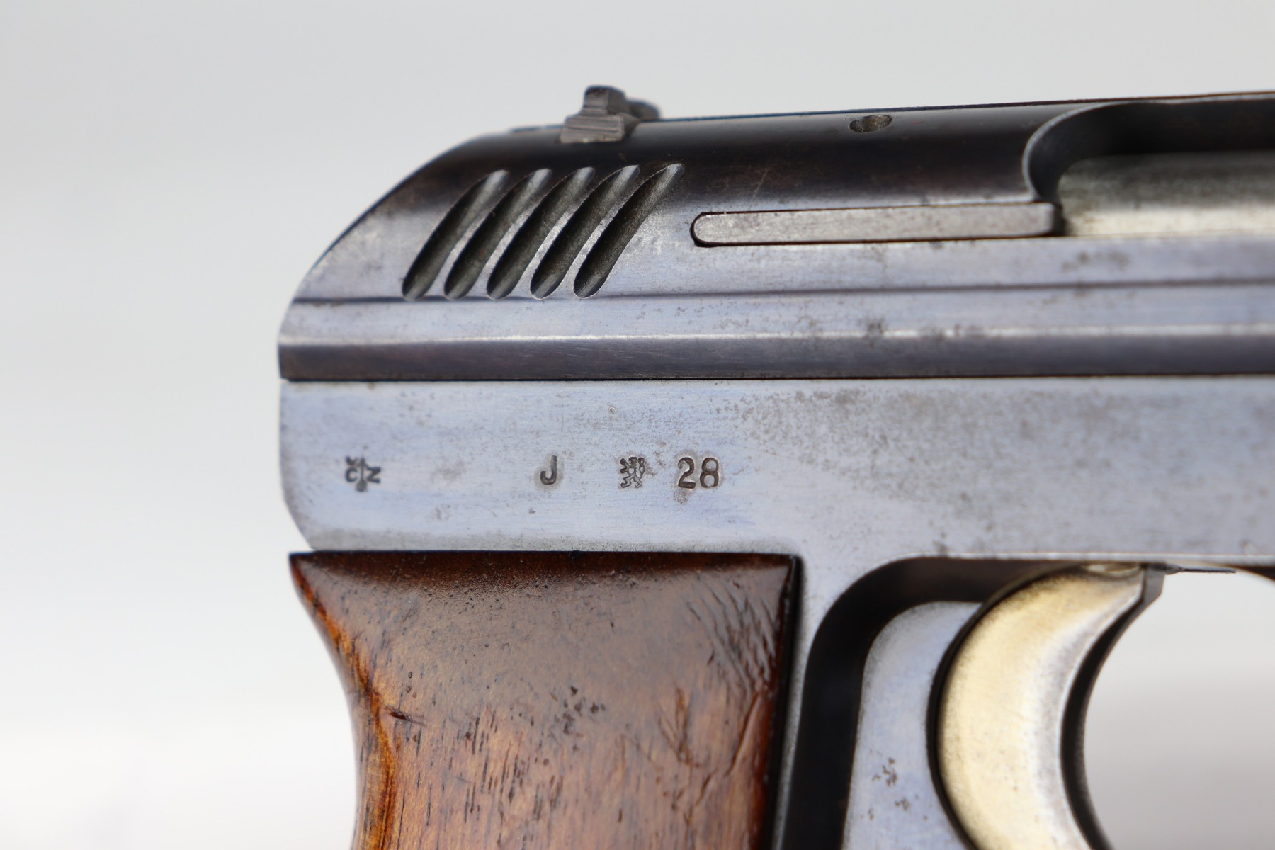 3/15/21 – This is a nice example of a CZ vz 24 manufactured in 1928. It is all matching and has the proper CZ proofs. There is also what looks to be a police arsenal marking on the front strap. The gun has retained roughly 85% of its original finish. There is thinning on both sides of the slide and minor wear on around the muzzle, high edges, and front strap. There is noticeable spotty oxidation throughout. Comes with a nice wood grip with minor dings and bruises and a correct magazine. The bore is nice but the rifling is a little worn.