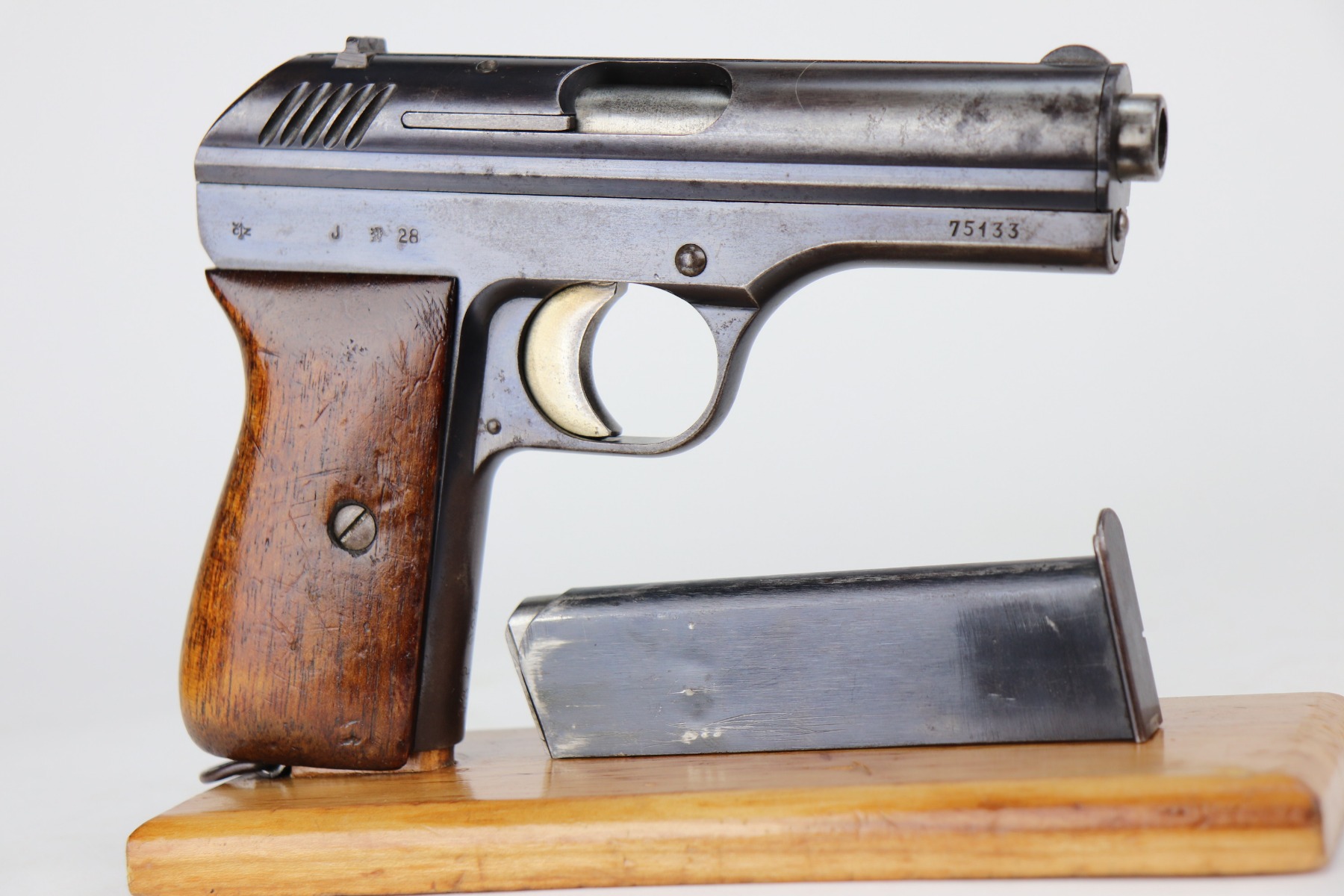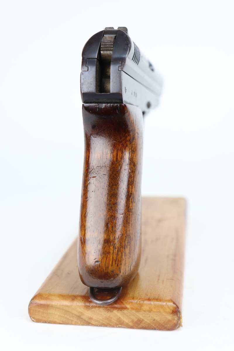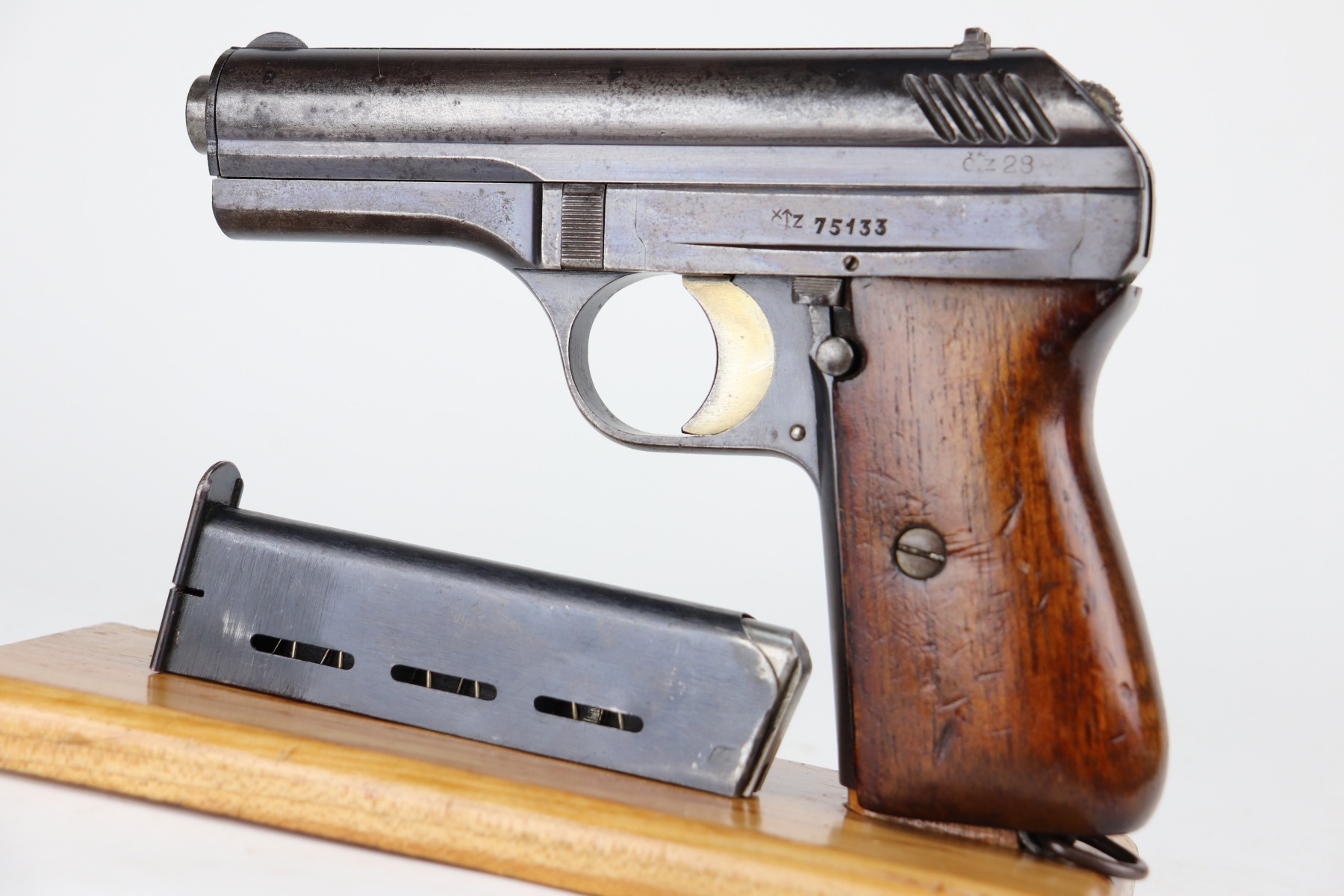 3/15/21 – This is a nice example of a CZ vz 24 manufactured in 1928. It is all matching and has the proper CZ proofs. There is also what looks to be a police arsenal marking on the front strap. The gun has retained roughly 85% of its original finish. There is thinning on both sides of the slide and minor wear on around the muzzle, high edges, and front strap. There is noticeable spotty oxidation throughout. Comes with a nice wood grip with minor dings and bruises and a correct magazine. The bore is nice but the rifling is a little worn.