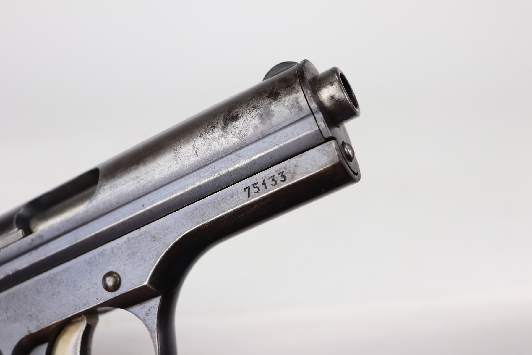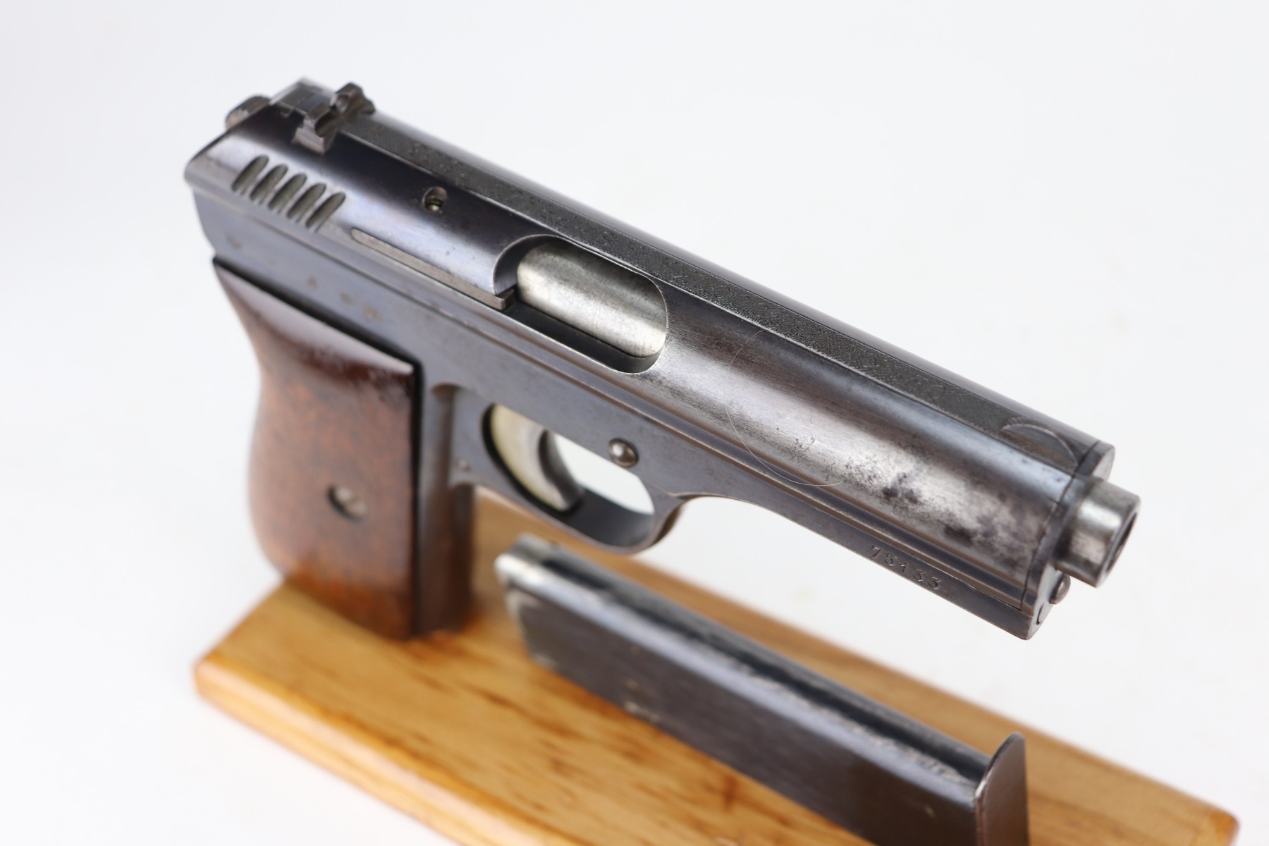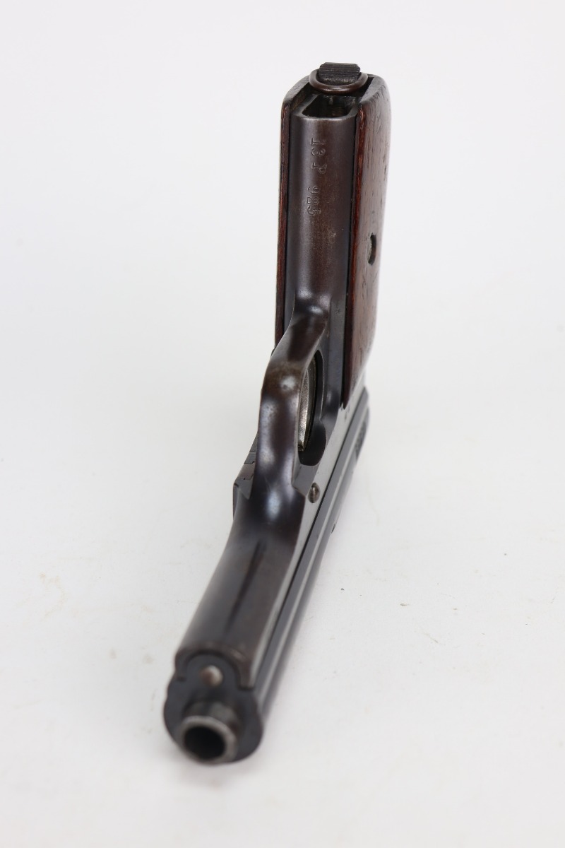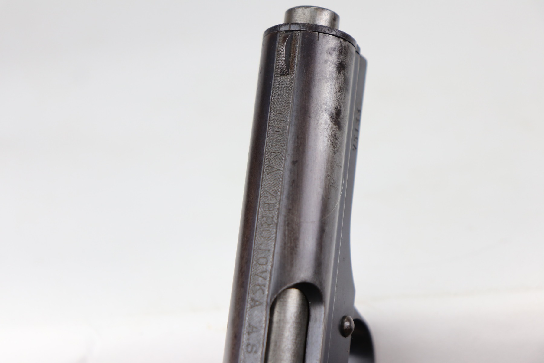 3/15/21 – This is a nice example of a CZ vz 24 manufactured in 1928. It is all matching and has the proper CZ proofs. There is also what looks to be a police arsenal marking on the front strap. The gun has retained roughly 85% of its original finish. There is thinning on both sides of the slide and minor wear on around the muzzle, high edges, and front strap. There is noticeable spotty oxidation throughout. Comes with a nice wood grip with minor dings and bruises and a correct magazine. The bore is nice but the rifling is a little worn.
