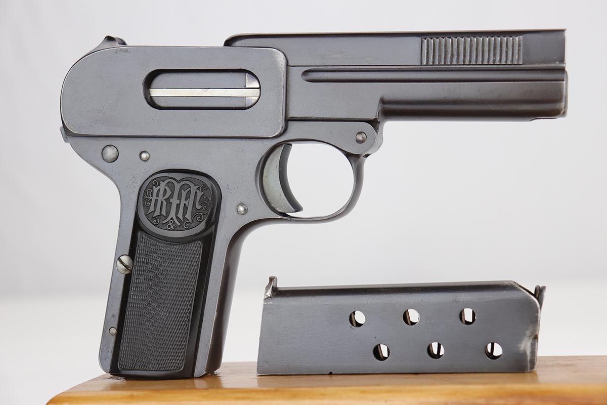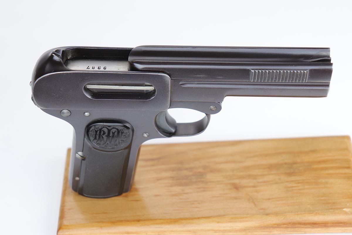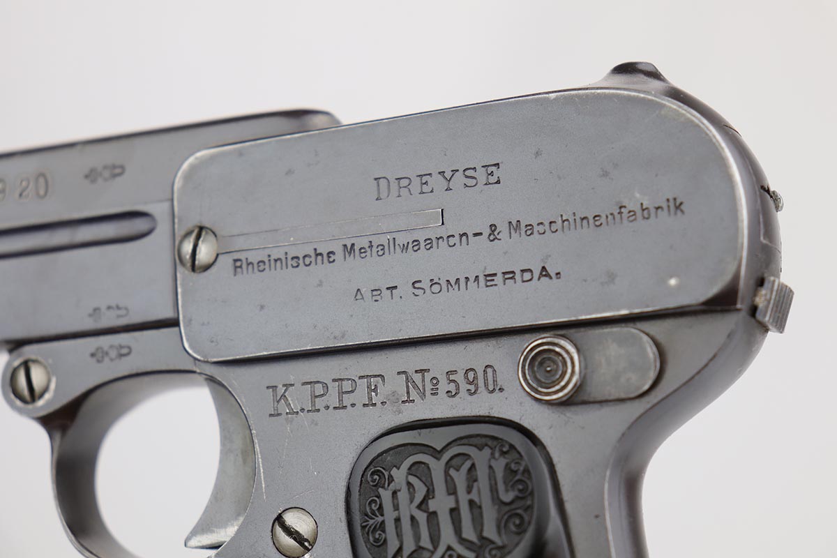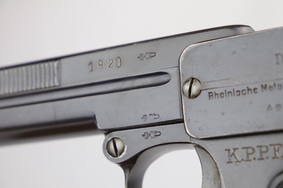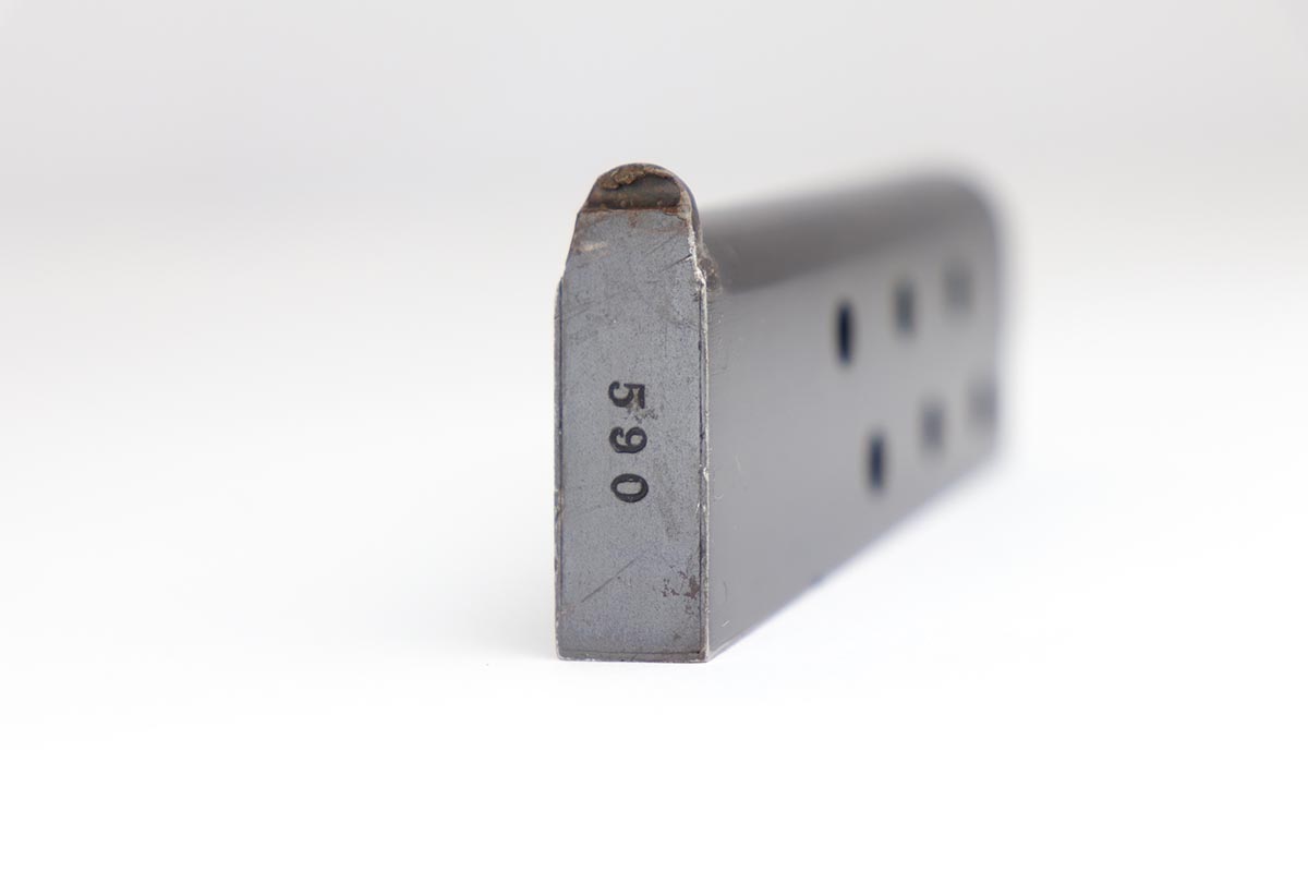 10/24/19 – This is an excellent example of a Dreyse M1907 that was marked and issued to the Frankfurt Police, and retains the original, matching numbered magazine. The pistol has about 96-97% of its original finish, with standard high edge wear but no major areas of finish loss. Excellent grips and bore. The left side of the frame is Marked ‘K.P.P.F. No 590’, denoting issue to the ‘Polizei Presidium Frankfurt’, with pistol number 590 then also found on the bottom of the magazine. The pistol was manufactured around 1910, so it has a rich history that passed through both wars.