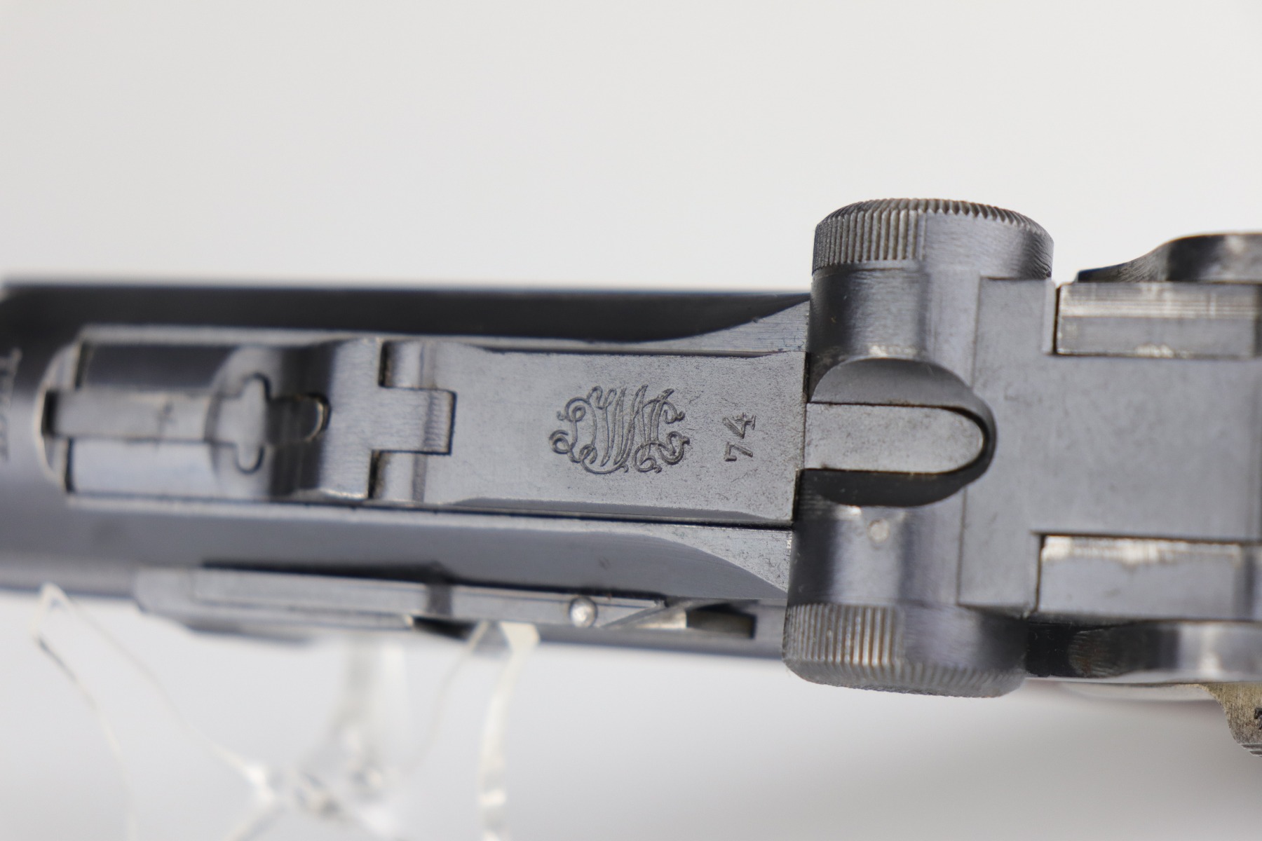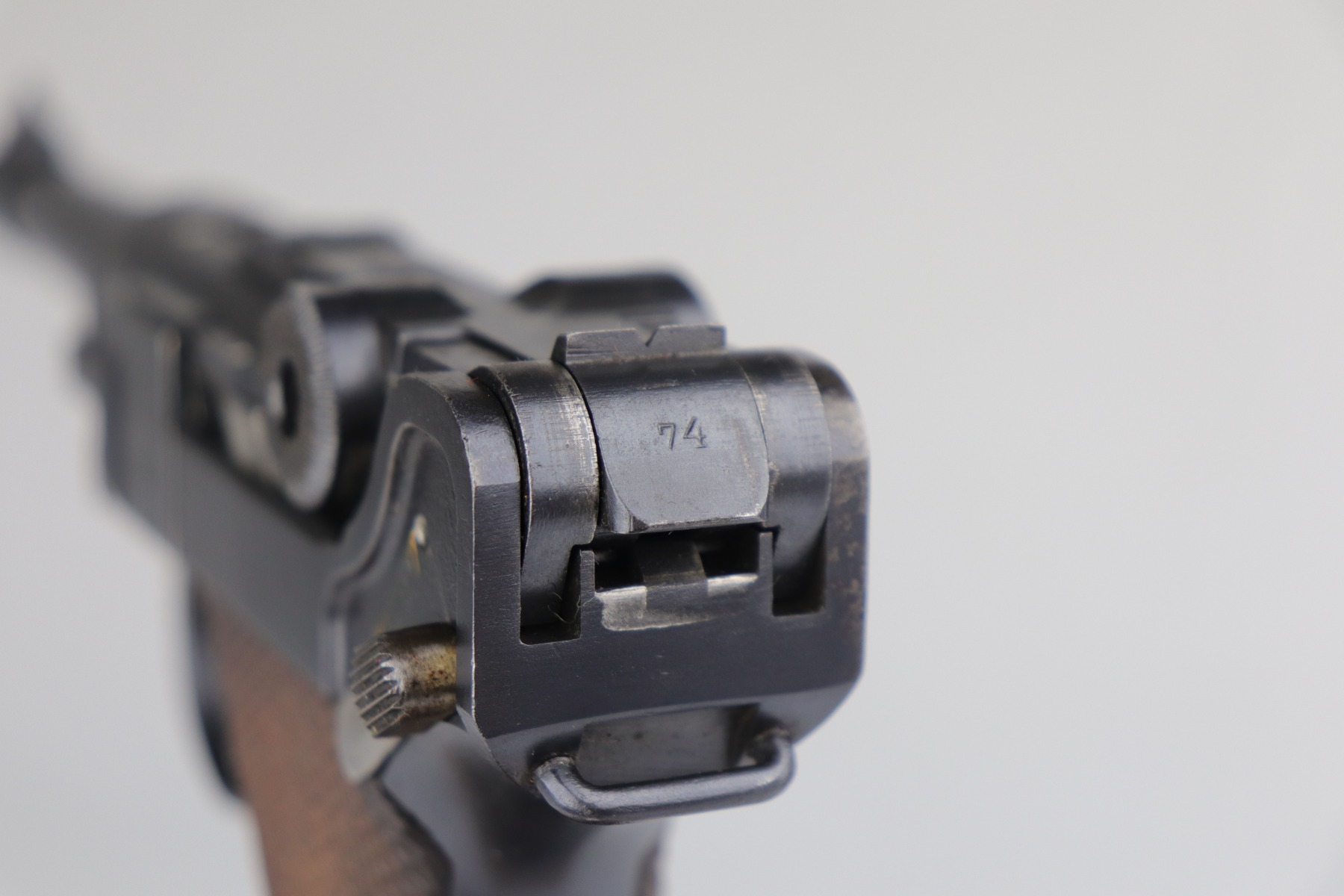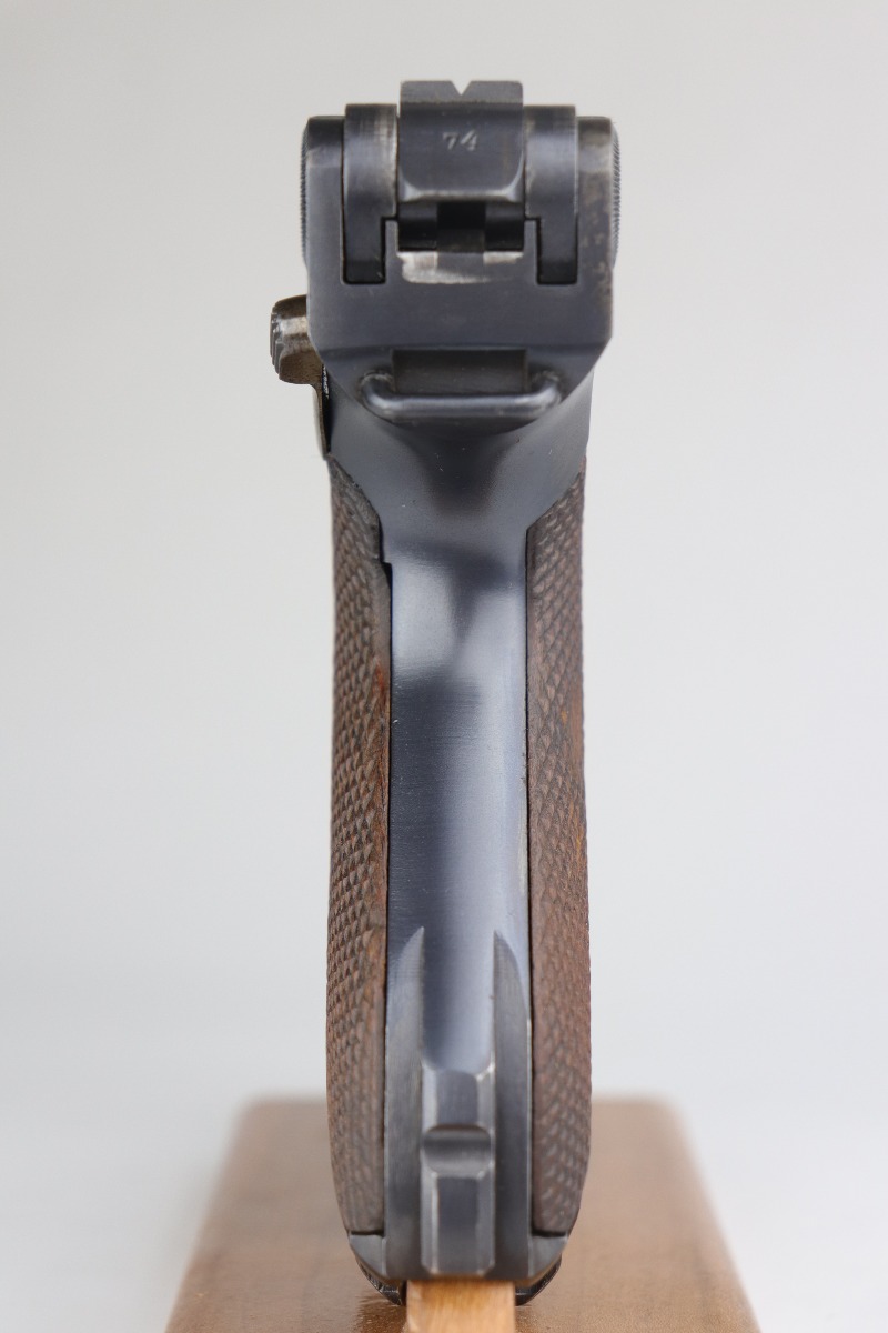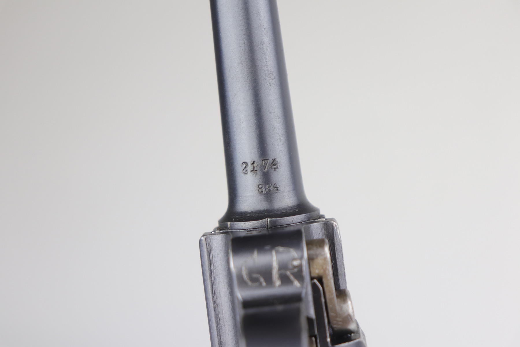 8/12/20 – This is a double-date commercial DWM luger rig that was later diverted to the police. The dates on the chamber are 1920 and 1921. It is all matching and has two original matching magazines. It also comes with a luger tool and an original police holster. The holster has a police marking on the back with a serial that does not match the gun. Scratched into the back appears to be the name of the vet who captured it. The closure strap and loop have been replaced. The gun is in excellent condition, retaining about 96-97% of its original bluing. There is minor muzzle and high edge wear, especially on the side plate. There is an area of wear at the base of the front strap and one very small spot of discoloration on the left side of the frame. The initials “GR” are scratched into the underside of the frame, near the base of the barrel. However, these initials do match the name on the holster, leading us to believe that the gun and holster did in fact come together. The bore is nice but there is minor frosting in the grooves.