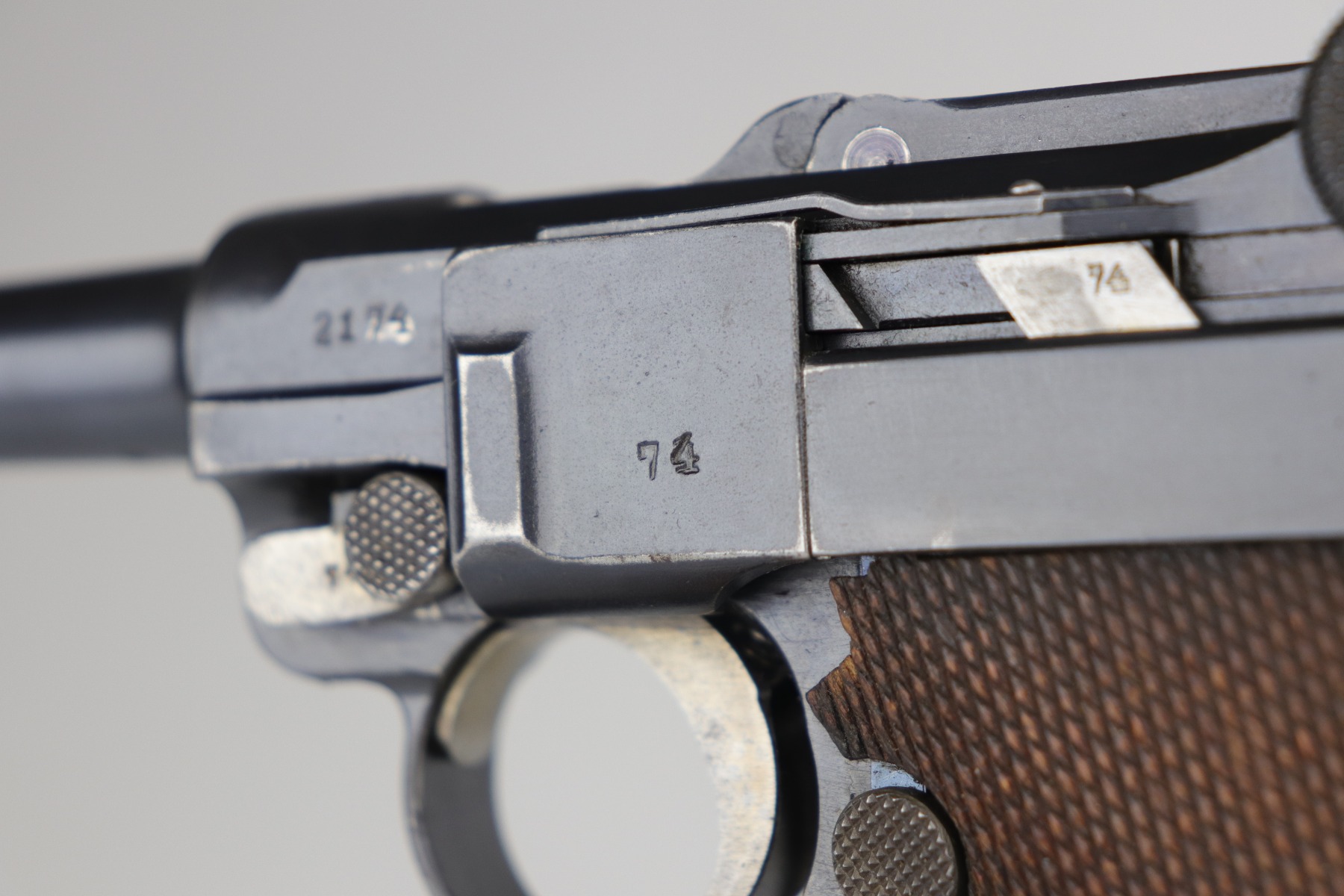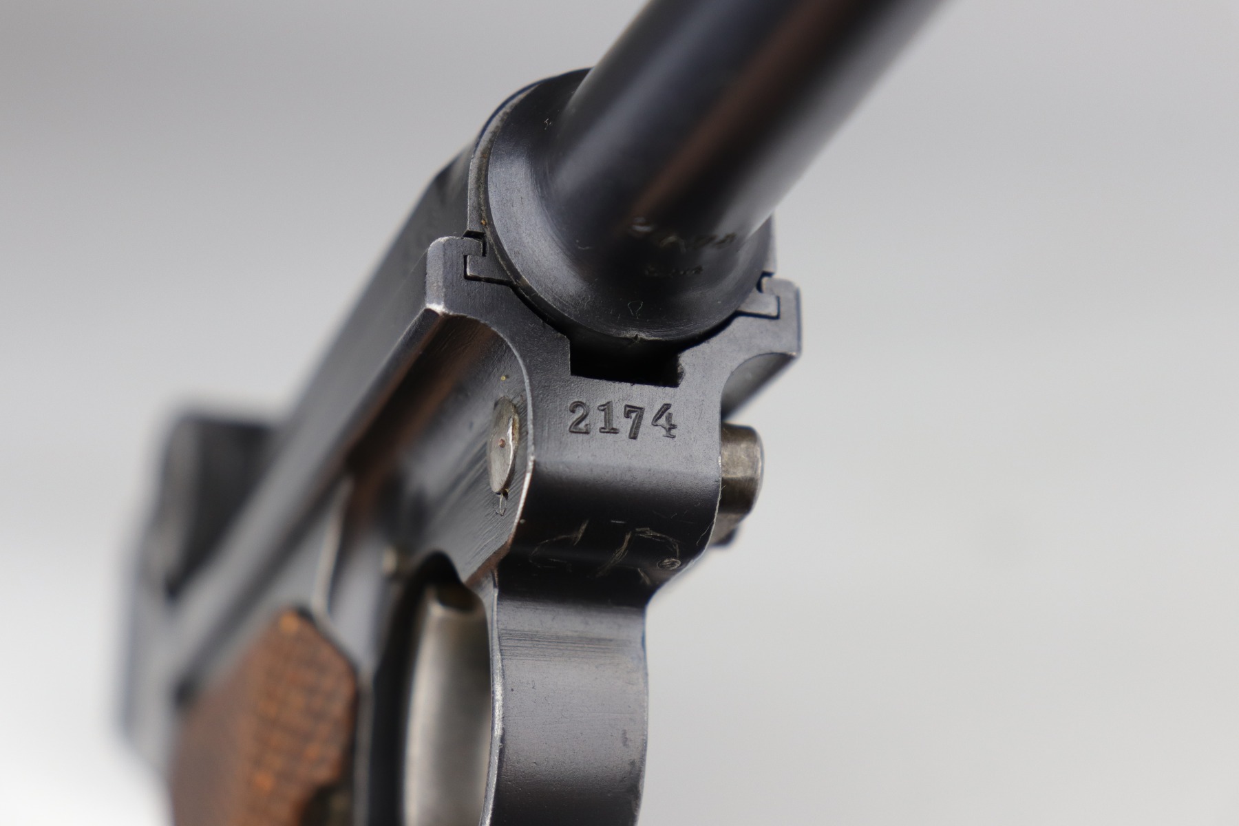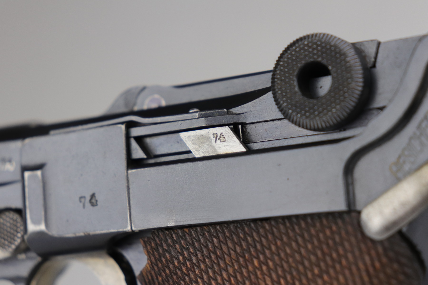 8/12/20 – This is a double-date commercial DWM luger rig that was later diverted to the police. The dates on the chamber are 1920 and 1921. It is all matching and has two original matching magazines. It also comes with a luger tool and an original police holster. The holster has a police marking on the back with a serial that does not match the gun. Scratched into the back appears to be the name of the vet who captured it. The closure strap and loop have been replaced. The gun is in excellent condition, retaining about 96-97% of its original bluing. There is minor muzzle and high edge wear, especially on the side plate. There is an area of wear at the base of the front strap and one very small spot of discoloration on the left side of the frame. The initials “GR” are scratched into the underside of the frame, near the base of the barrel. However, these initials do match the name on the holster, leading us to believe that the gun and holster did in fact come together. The bore is nice but there is minor frosting in the grooves.