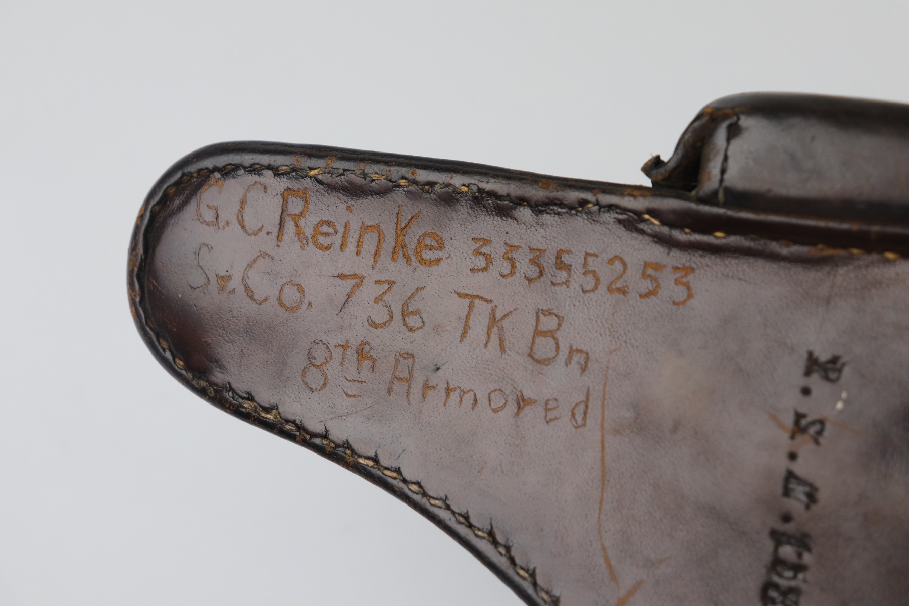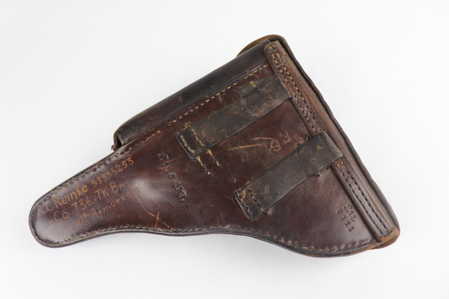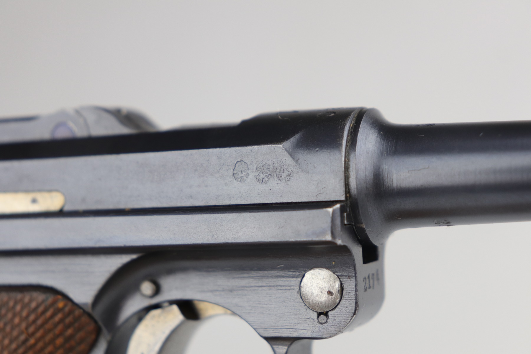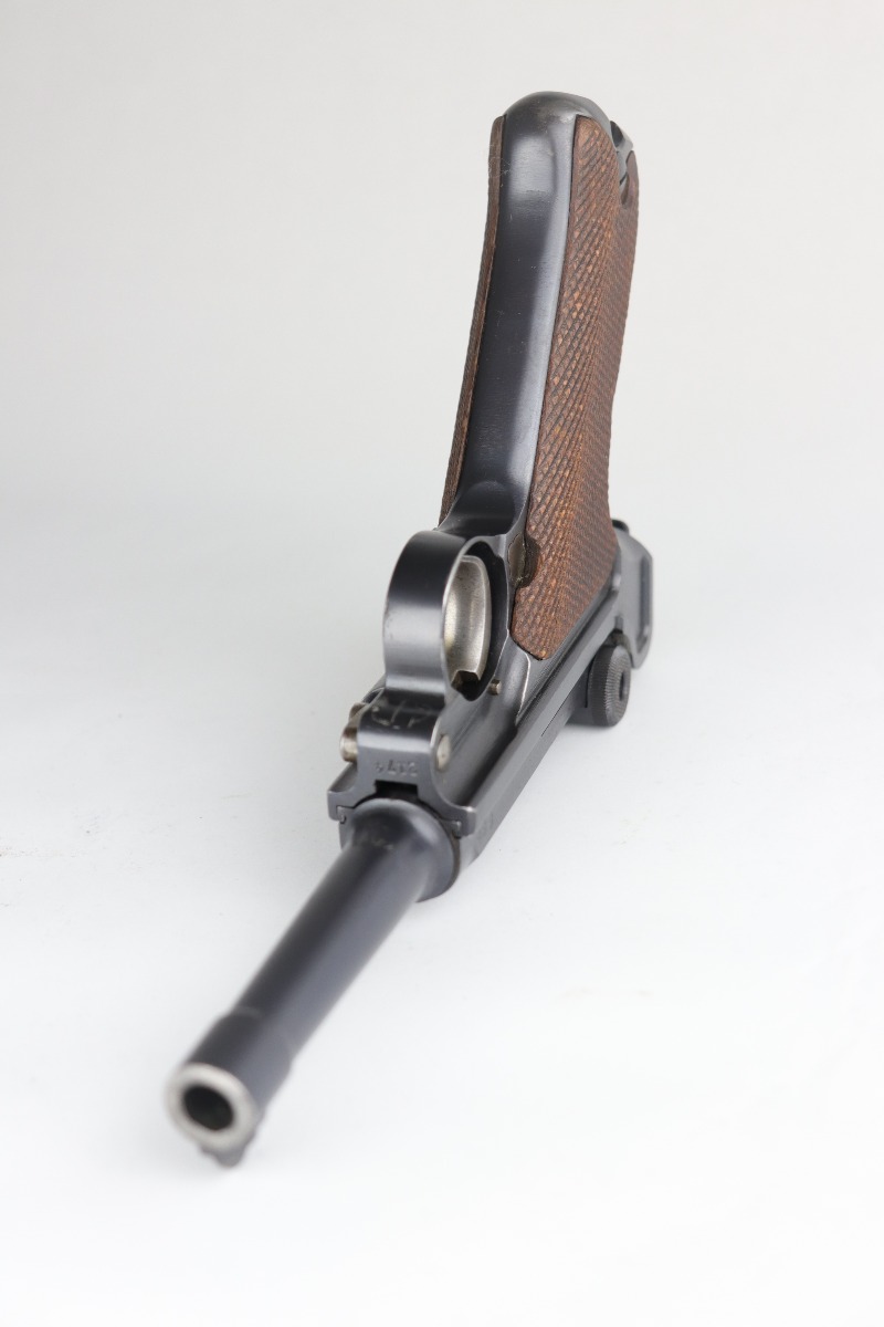 8/12/20 – This is a double-date commercial DWM luger rig that was later diverted to the police. The dates on the chamber are 1920 and 1921. It is all matching and has two original matching magazines. It also comes with a luger tool and an original police holster. The holster has a police marking on the back with a serial that does not match the gun. Scratched into the back appears to be the name of the vet who captured it. The closure strap and loop have been replaced. The gun is in excellent condition, retaining about 96-97% of its original bluing. There is minor muzzle and high edge wear, especially on the side plate. There is an area of wear at the base of the front strap and one very small spot of discoloration on the left side of the frame. The initials “GR” are scratched into the underside of the frame, near the base of the barrel. However, these initials do match the name on the holster, leading us to believe that the gun and holster did in fact come together. The bore is nice but there is minor frosting in the grooves.