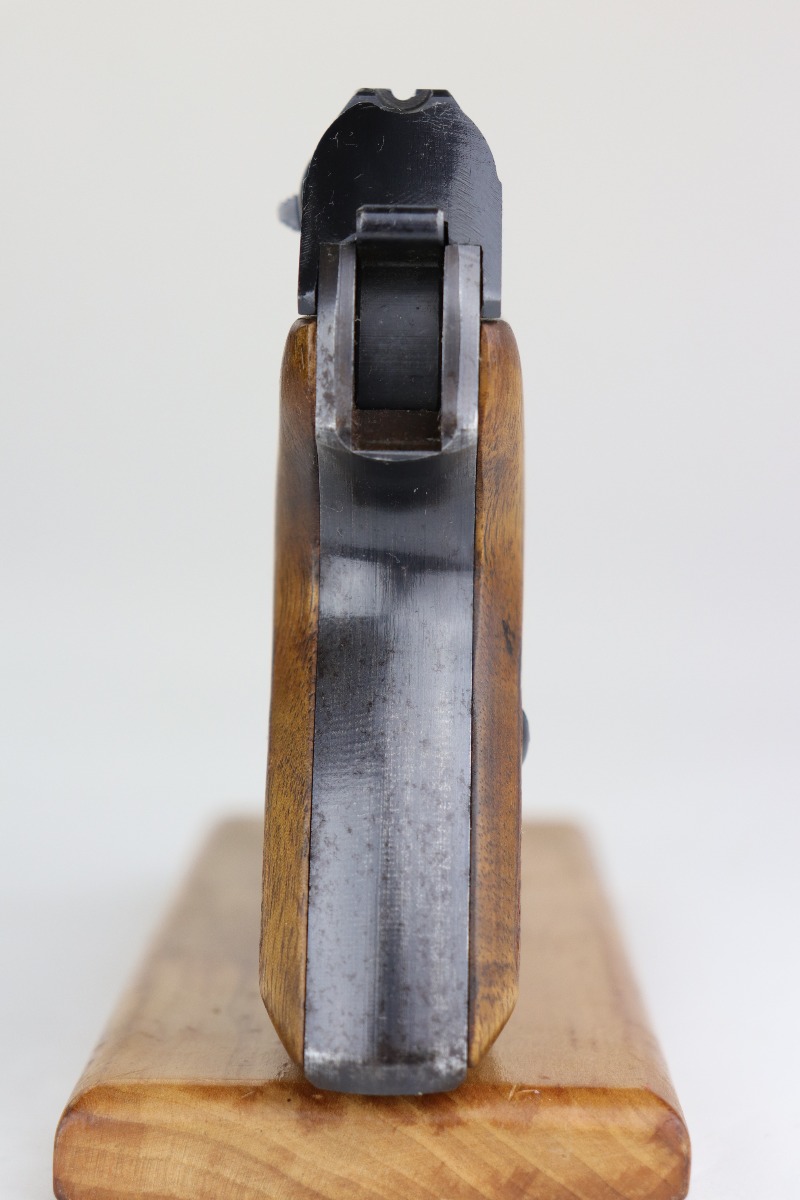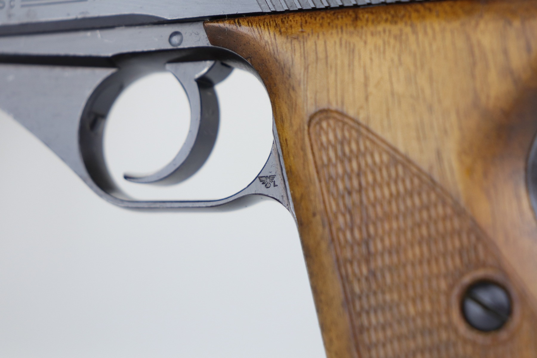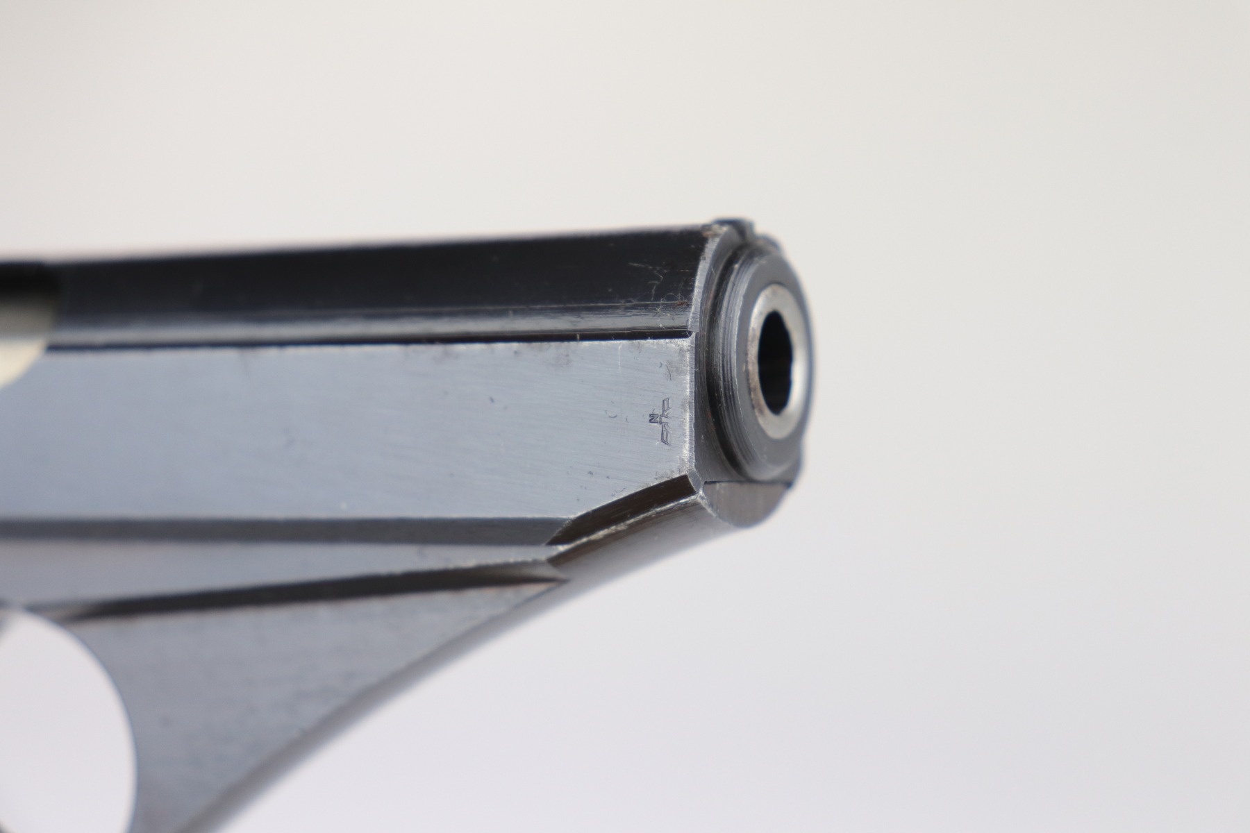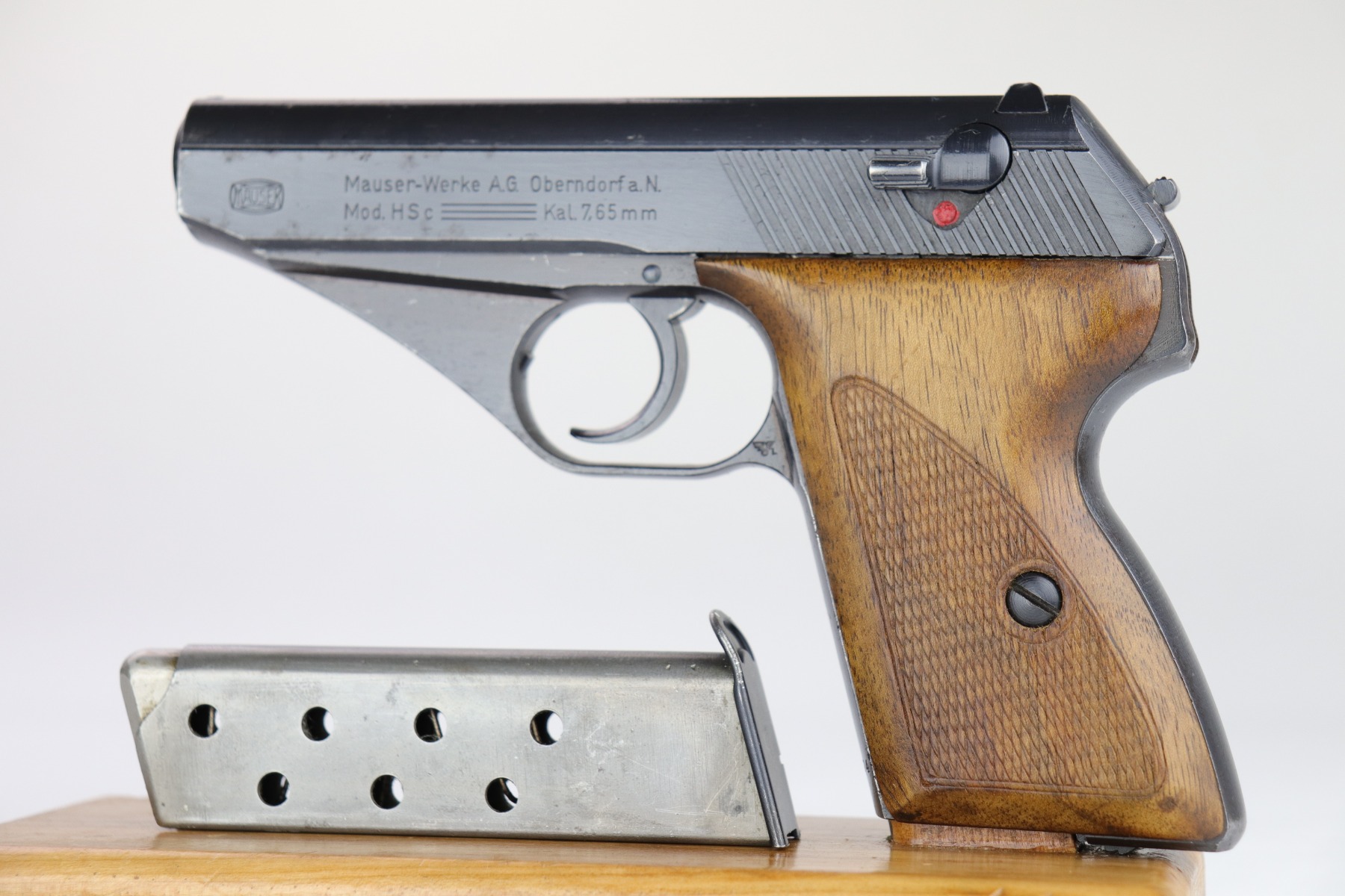 4/25/20 – This is an excellent and original WW2 Nazi Police-issued Mauser HSC, manufactured in 1944. It is marked with the “Eagle L” police acceptance proof. Overall, the gun is in excellent condition. There is very little actual bluing loss – it has retained ~96% of its original finish. The only signs of wear is thinning on the straps and some very minor freckling on the slide. The wood grips are original and excellent. It comes with a period-correct Mauser magazine. The magazine base is slightly bent upward on the toe. The gun functions properly. The bore is minty.