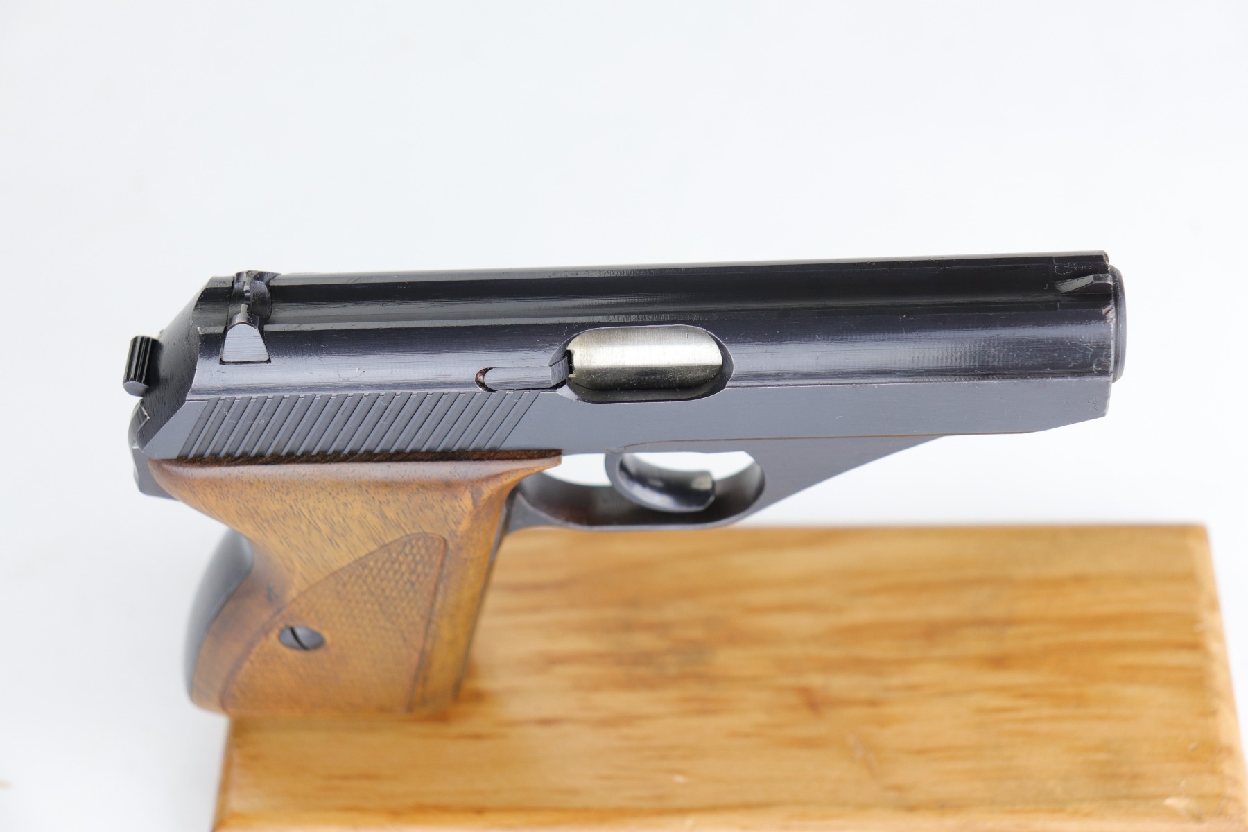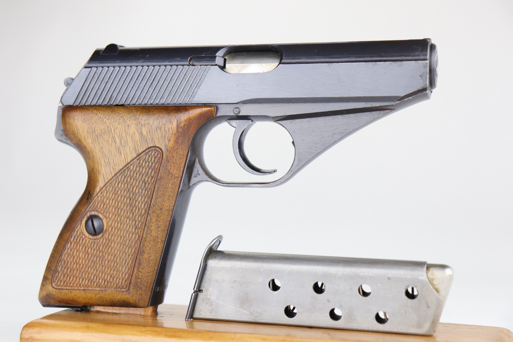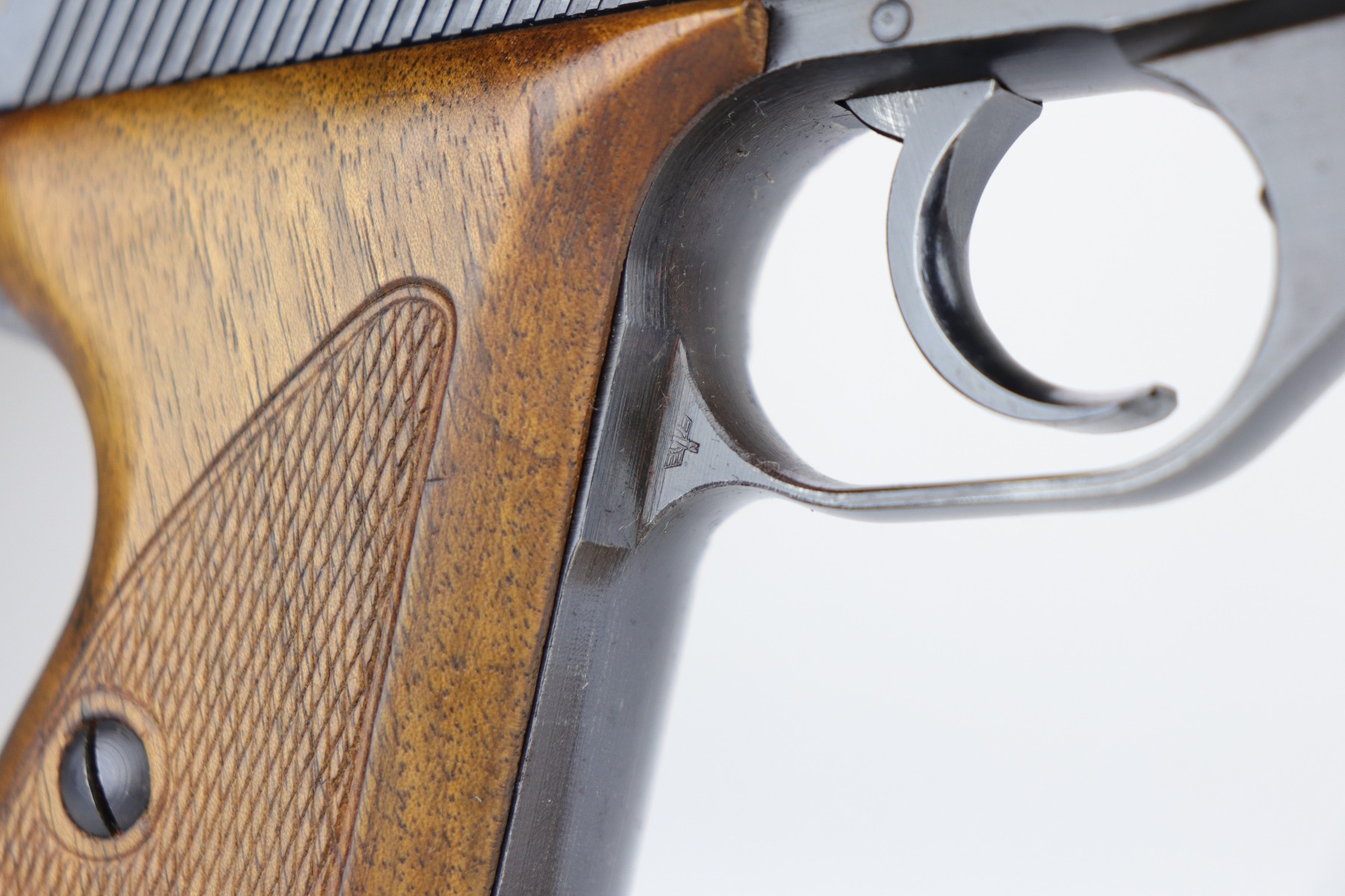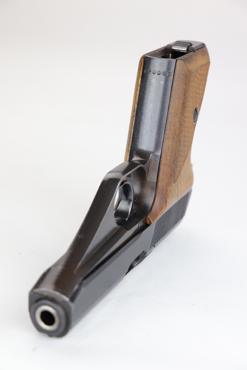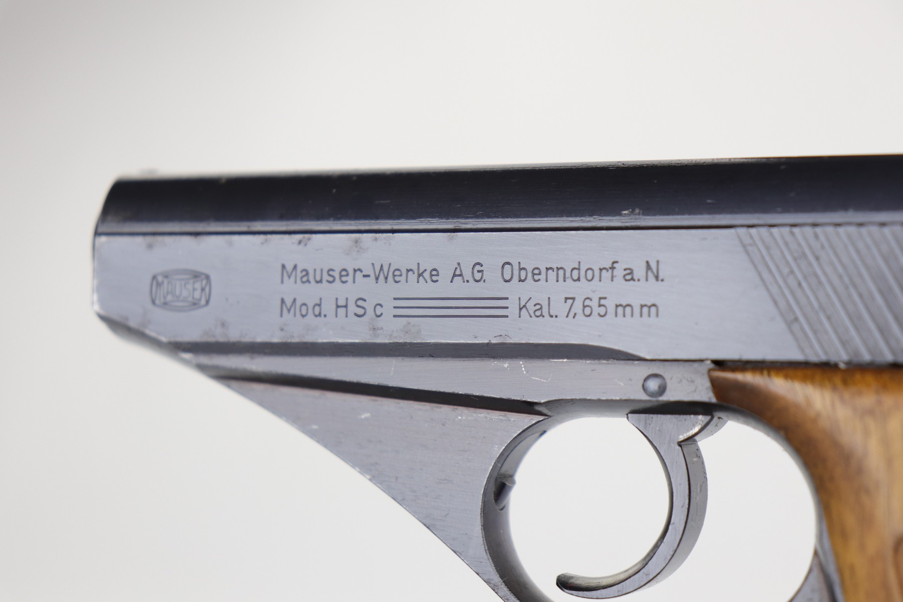 4/25/20 – This is an excellent and original WW2 Nazi Police-issued Mauser HSC, manufactured in 1944. It is marked with the “Eagle L” police acceptance proof. Overall, the gun is in excellent condition. There is very little actual bluing loss – it has retained ~96% of its original finish. The only signs of wear is thinning on the straps and some very minor freckling on the slide. The wood grips are original and excellent. It comes with a period-correct Mauser magazine. The magazine base is slightly bent upward on the toe. The gun functions properly. The bore is minty.