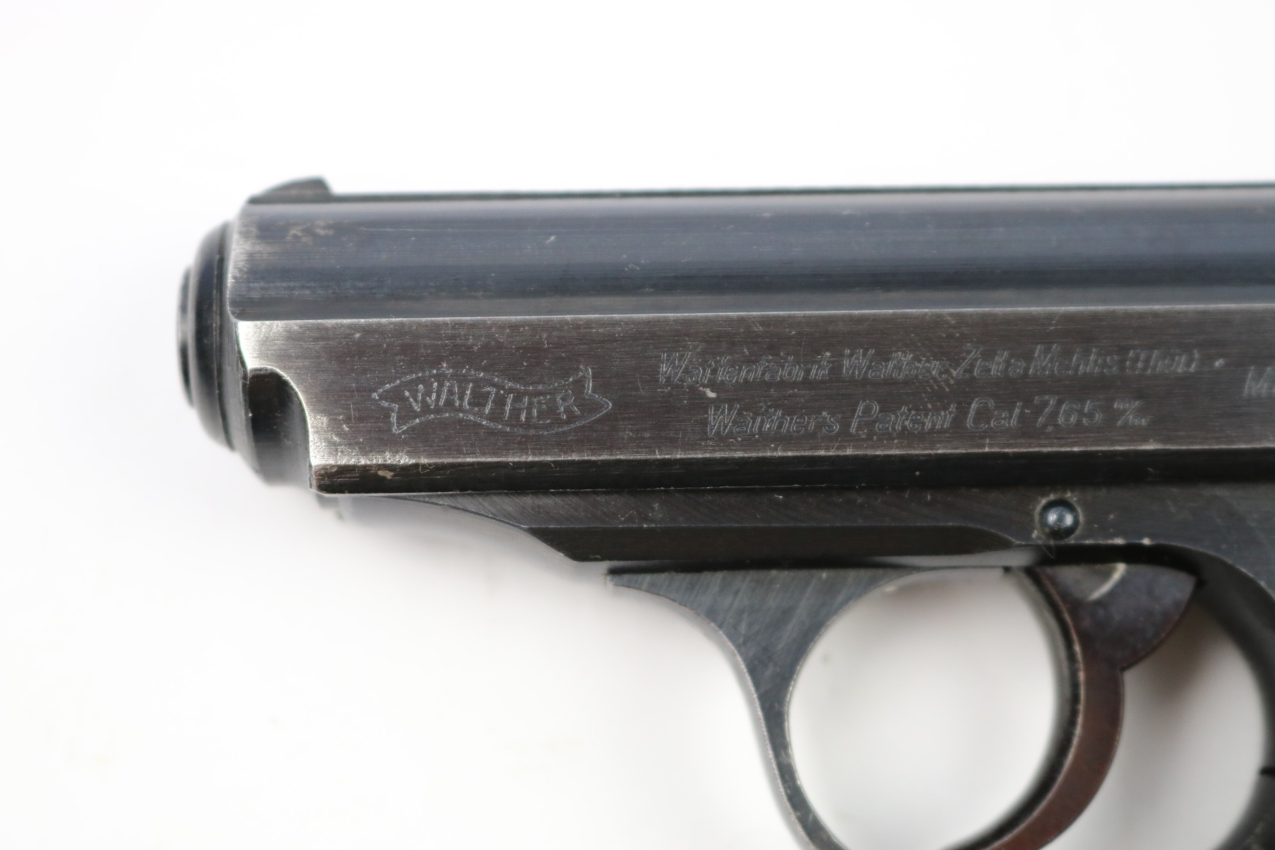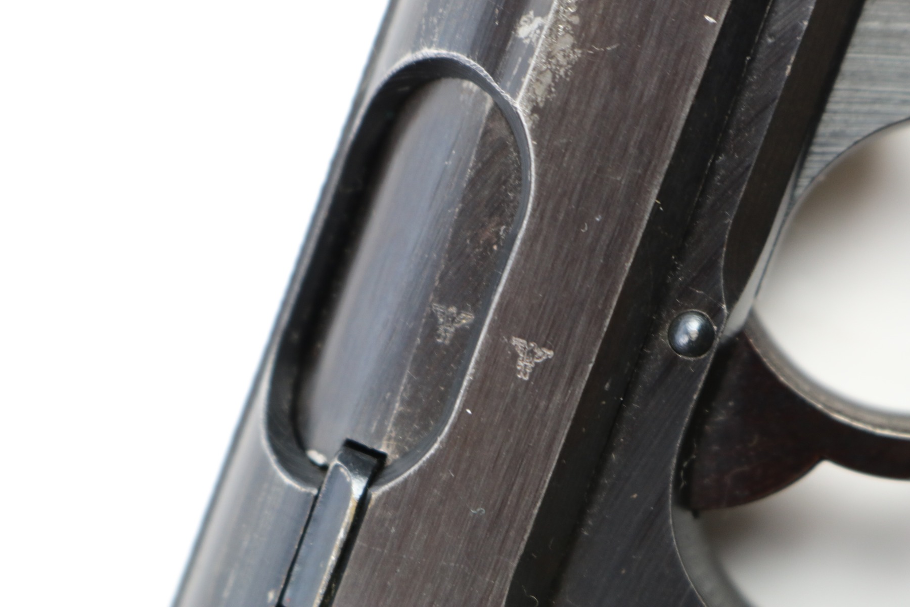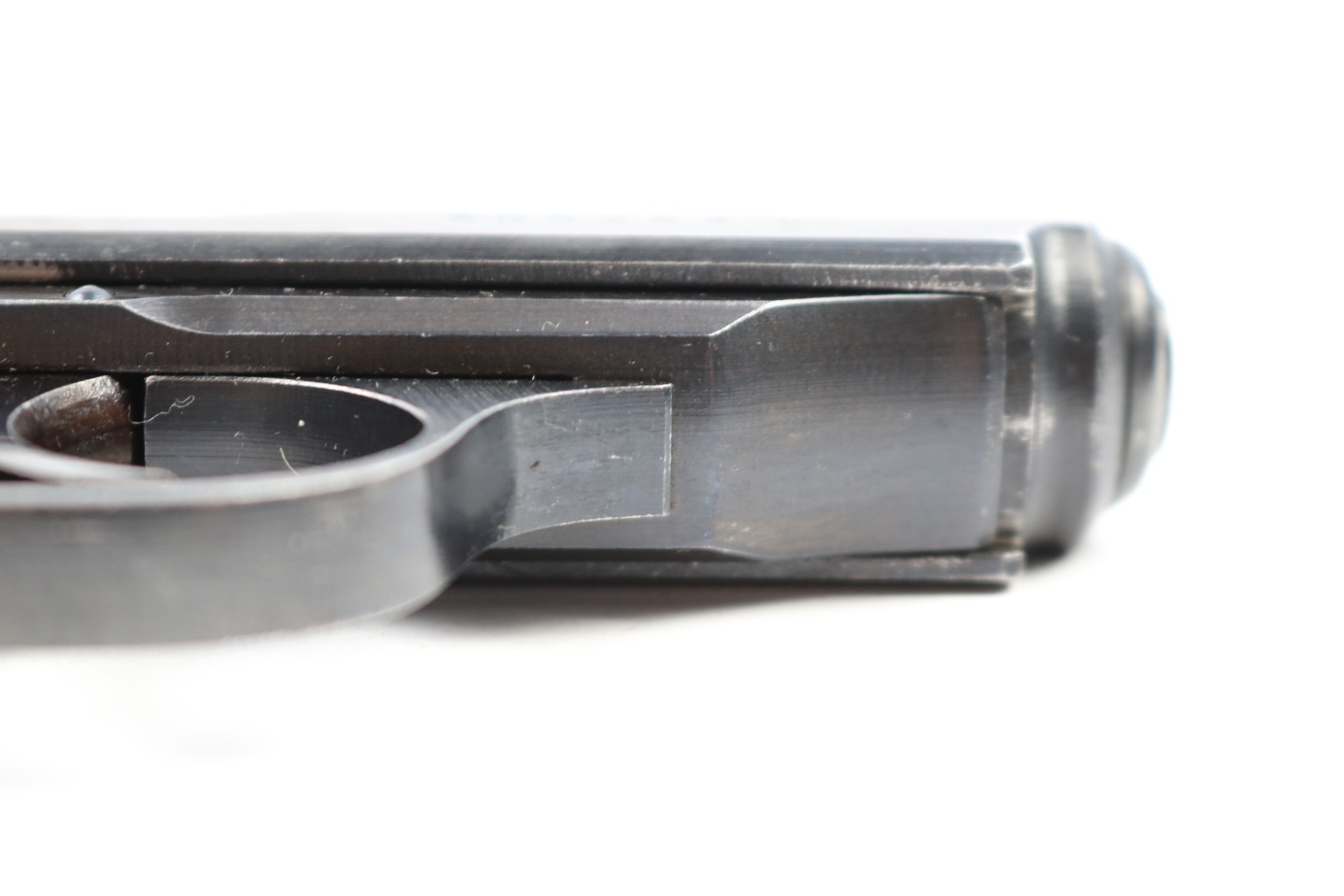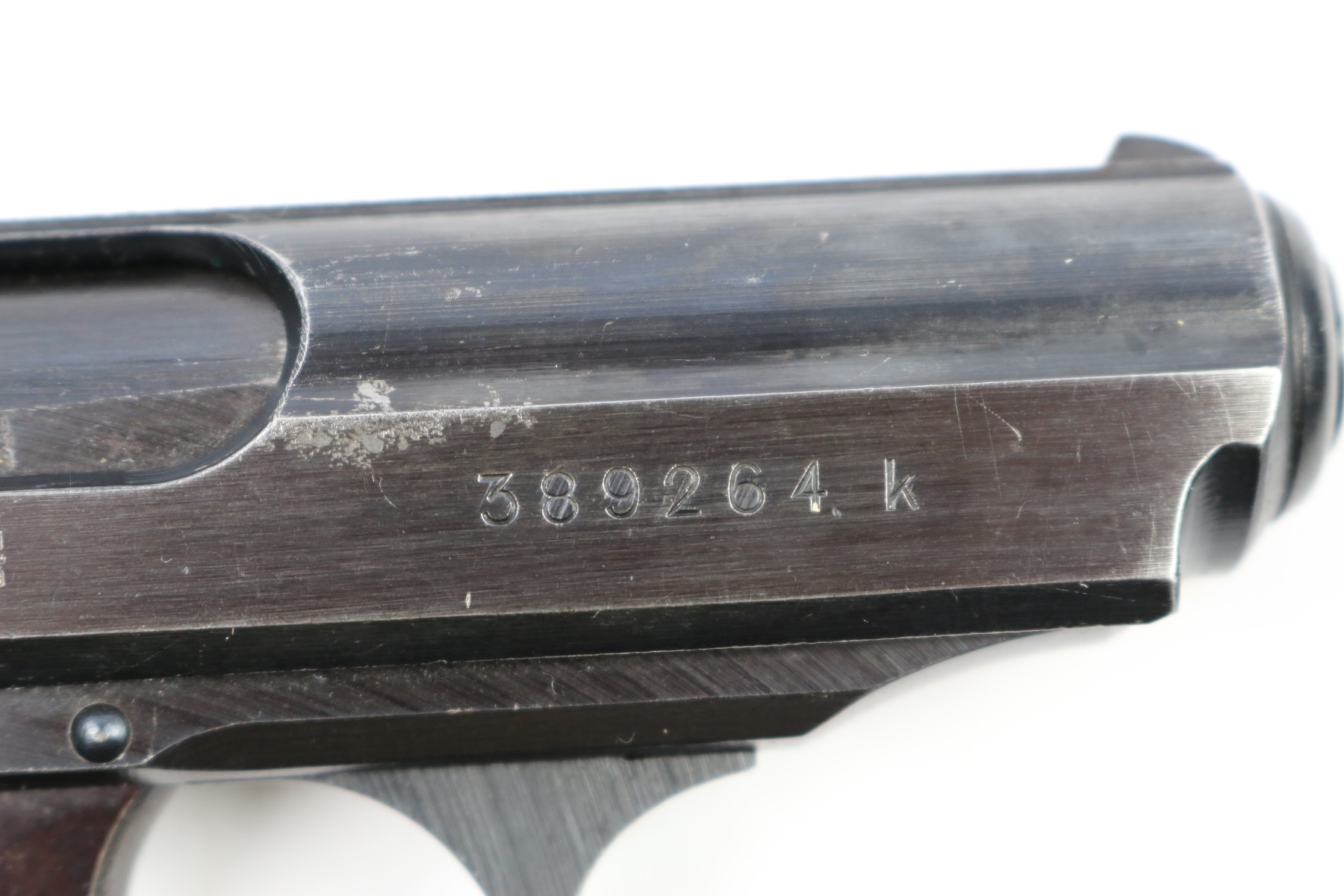 6/15/18 – This is an original Police Eagle/C Walther PPk from WW2. About 96%+ original condition in tact with some bluing loss on the slide. There’s bluing loss near the muzzle, edges, and ejection port of the slide. The safety lever also has a spot or two of bluing loss. Front strap is excellent. Police eagle/C stamped on the frame. The grip is a beautiful and scarce grey color. One small crack on the spine (most common area for a crack). The bore is excellent+ with minimal patina and excellent rifling. Guaranteed original.