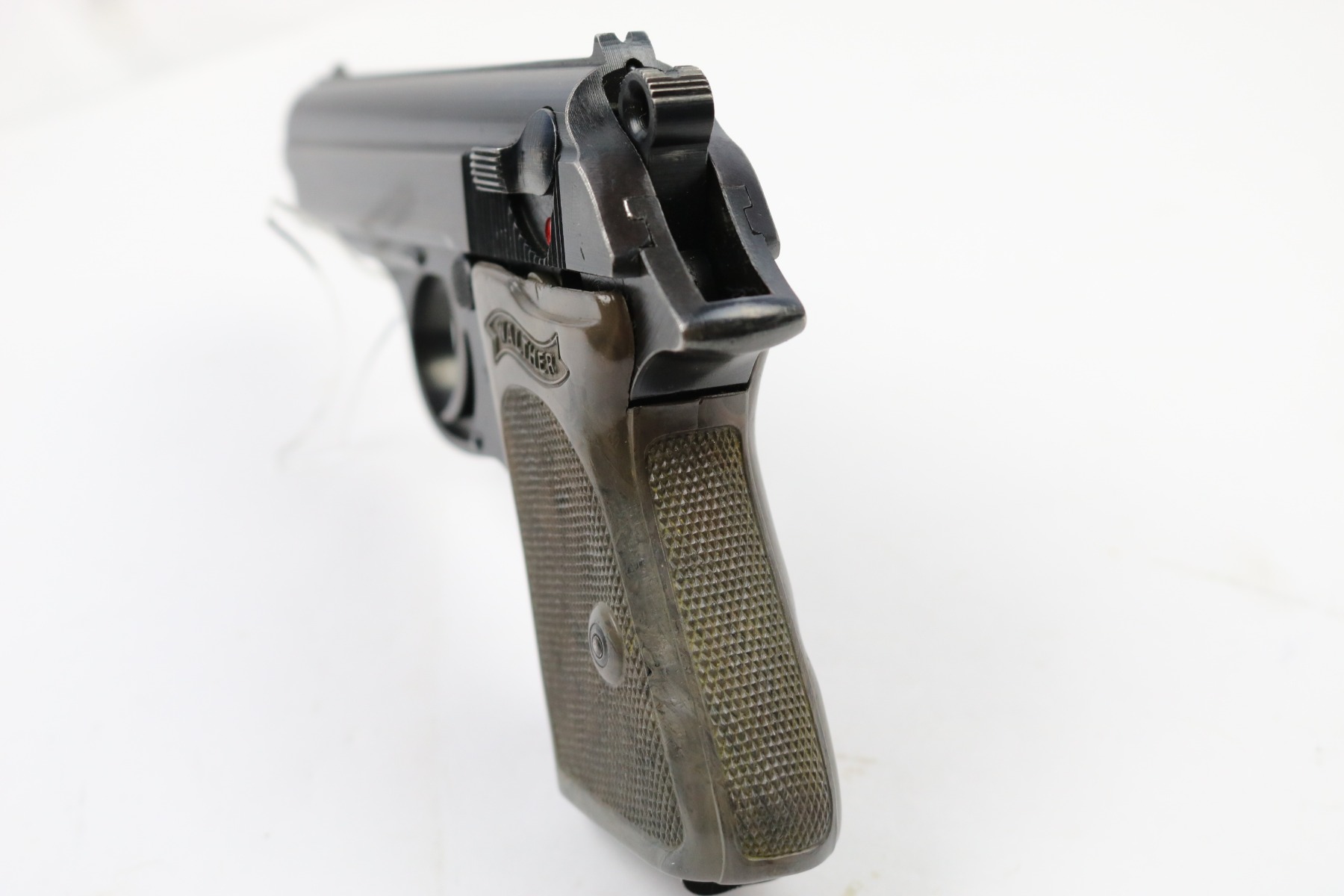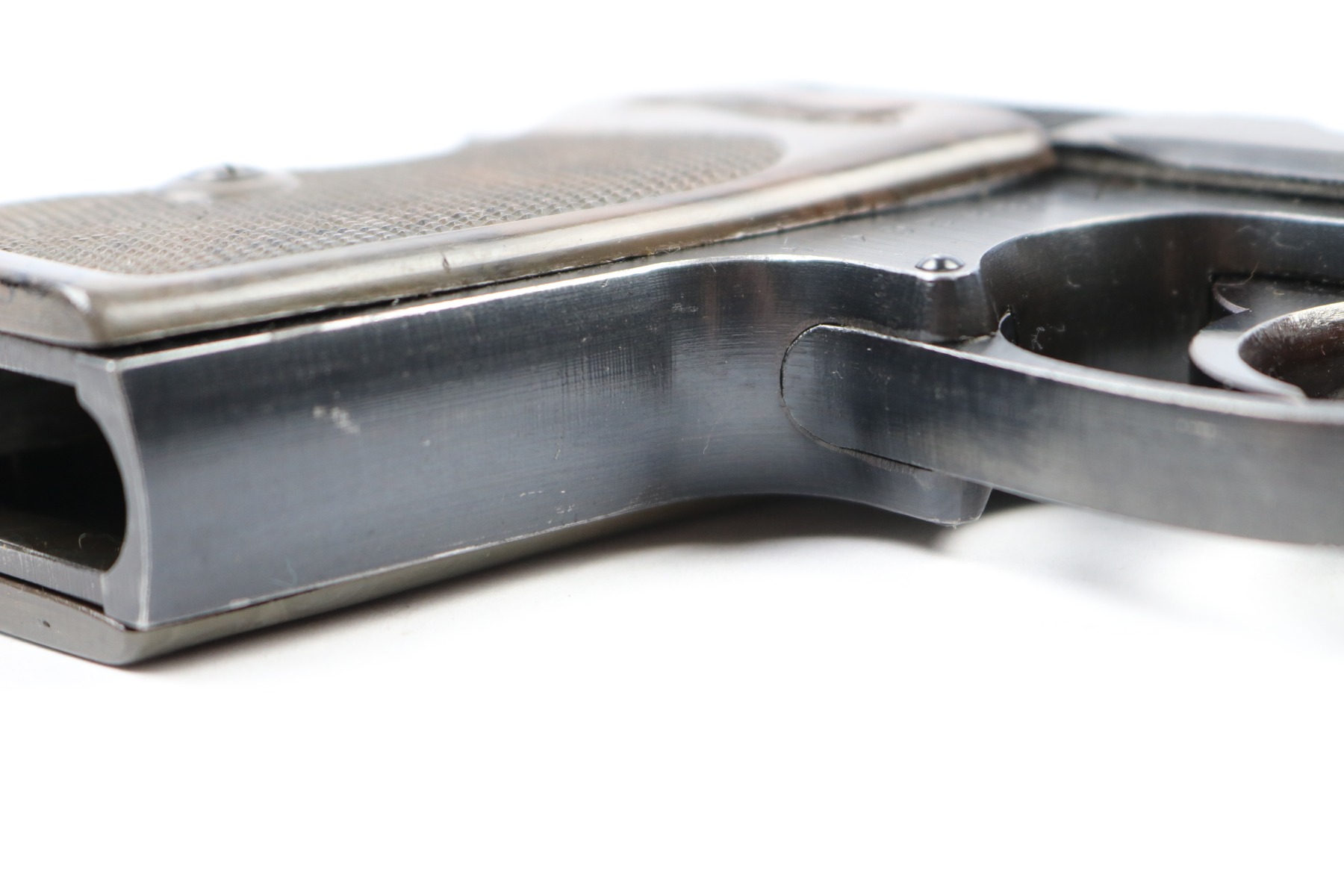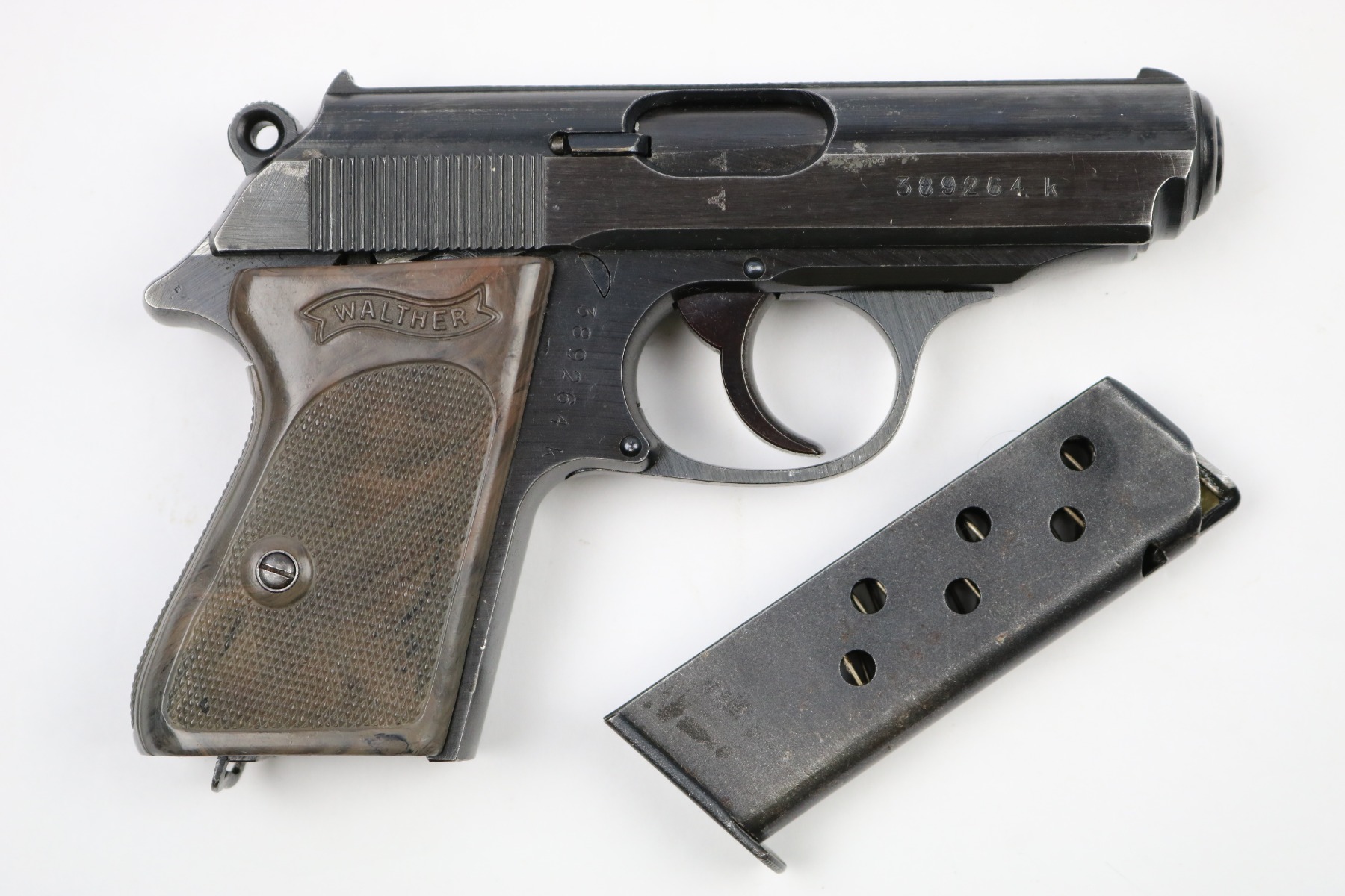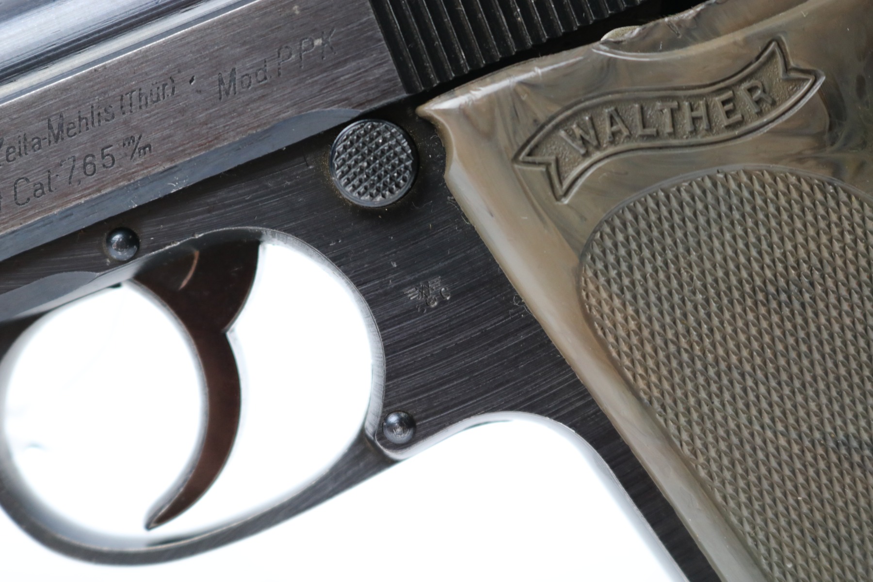 6/15/18 – This is an original Police Eagle/C Walther PPk from WW2. About 96%+ original condition in tact with some bluing loss on the slide. There’s bluing loss near the muzzle, edges, and ejection port of the slide. The safety lever also has a spot or two of bluing loss. Front strap is excellent. Police eagle/C stamped on the frame. The grip is a beautiful and scarce grey color. One small crack on the spine (most common area for a crack). The bore is excellent+ with minimal patina and excellent rifling. Guaranteed original.