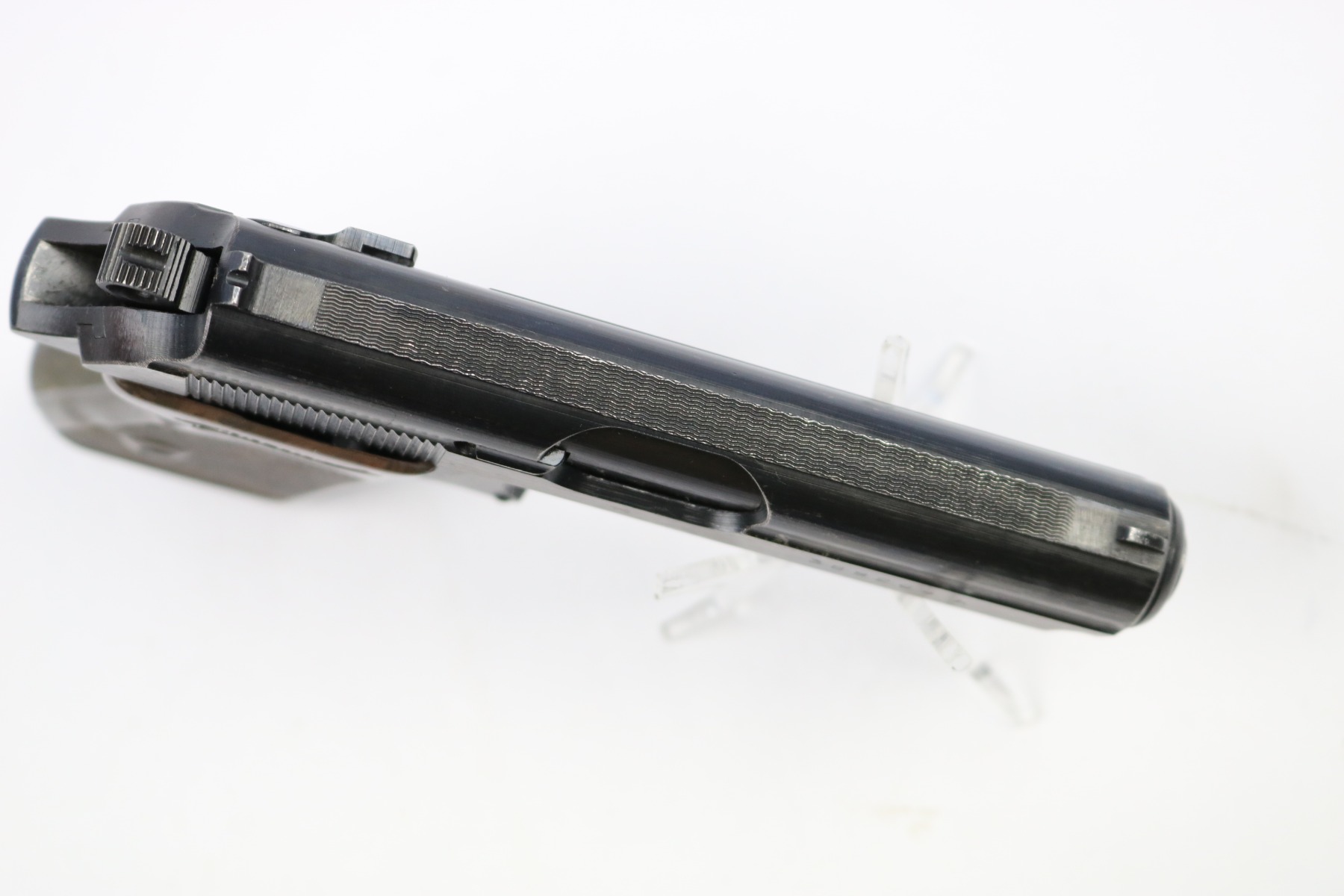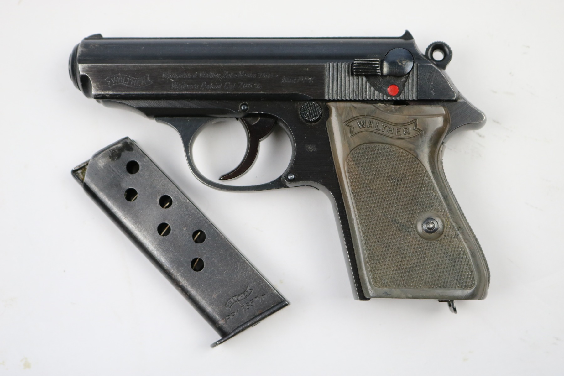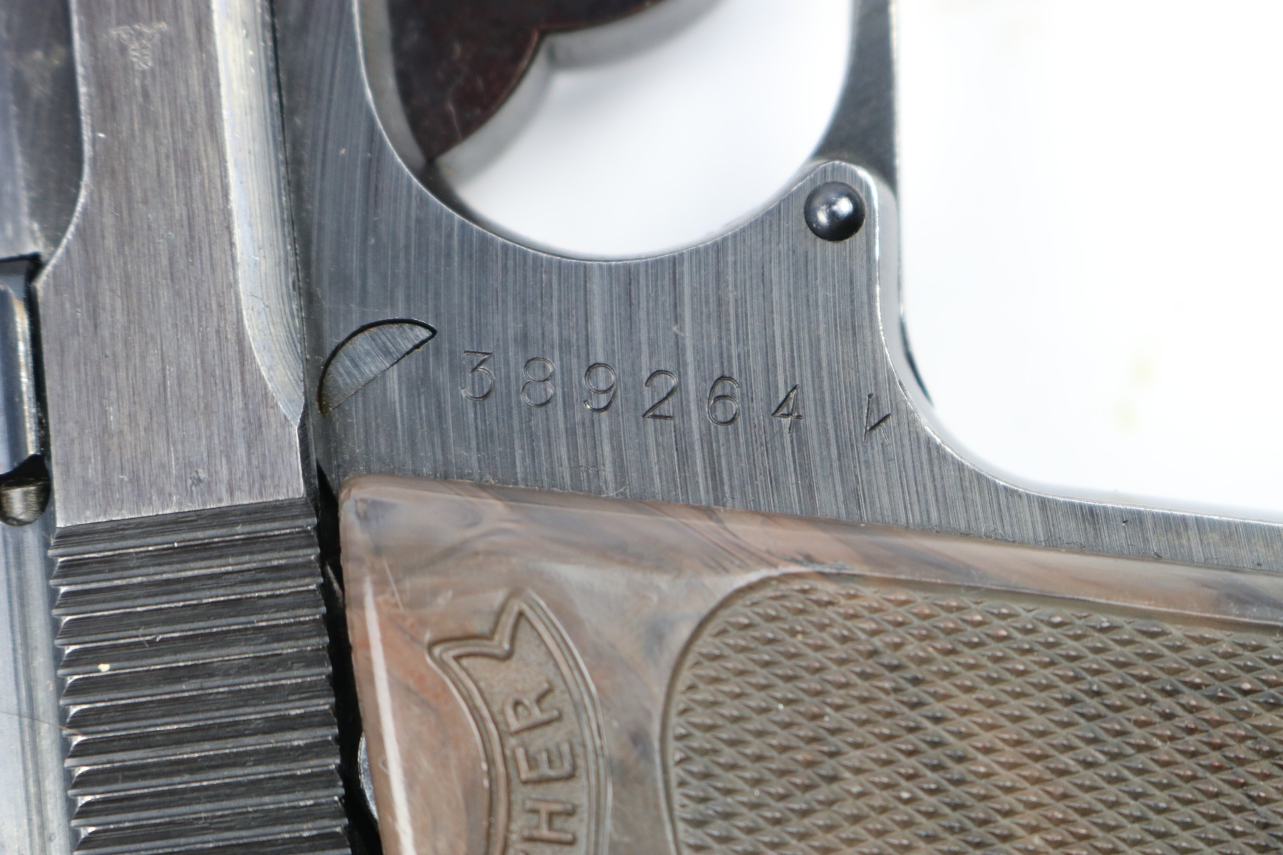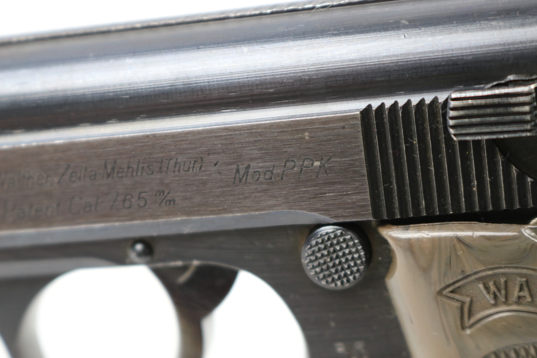 6/15/18 – This is an original Police Eagle/C Walther PPk from WW2. About 96%+ original condition in tact with some bluing loss on the slide. There’s bluing loss near the muzzle, edges, and ejection port of the slide. The safety lever also has a spot or two of bluing loss. Front strap is excellent. Police eagle/C stamped on the frame. The grip is a beautiful and scarce grey color. One small crack on the spine (most common area for a crack). The bore is excellent+ with minimal patina and excellent rifling. Guaranteed original.
