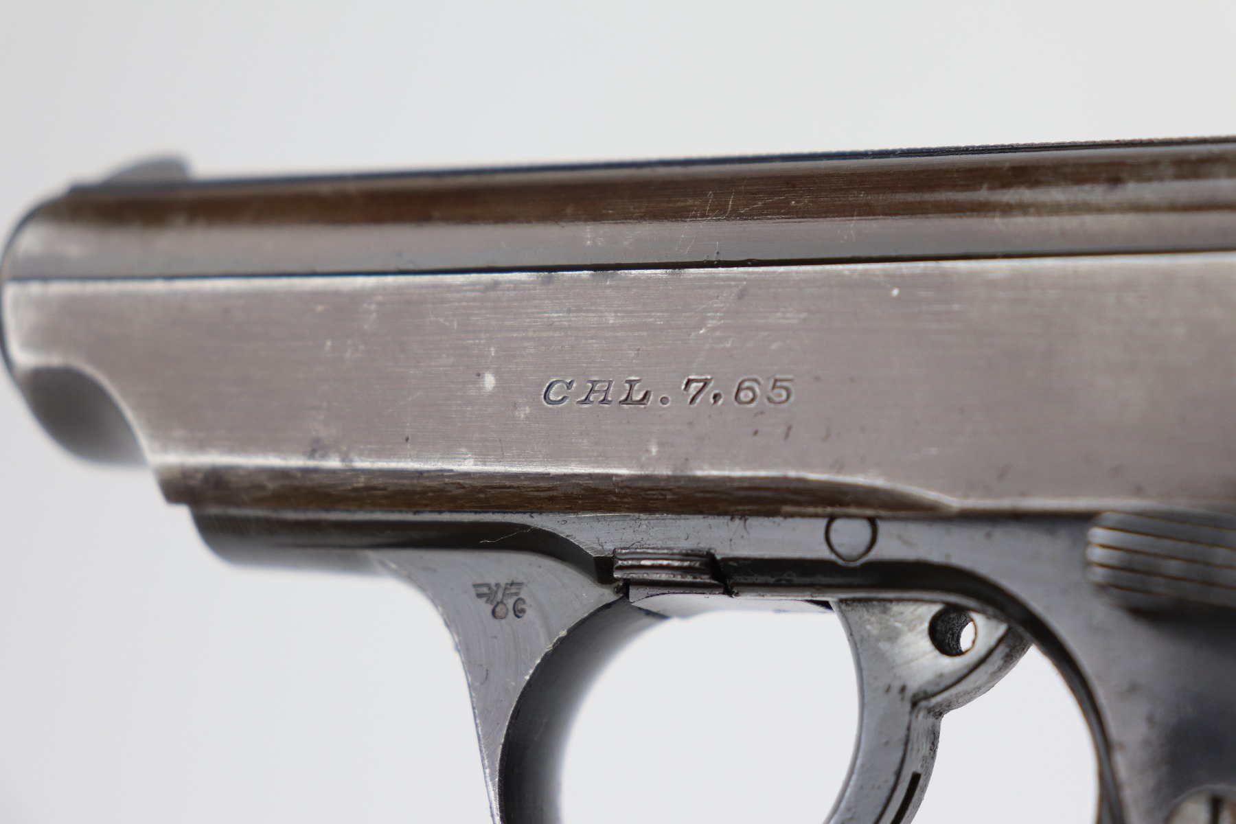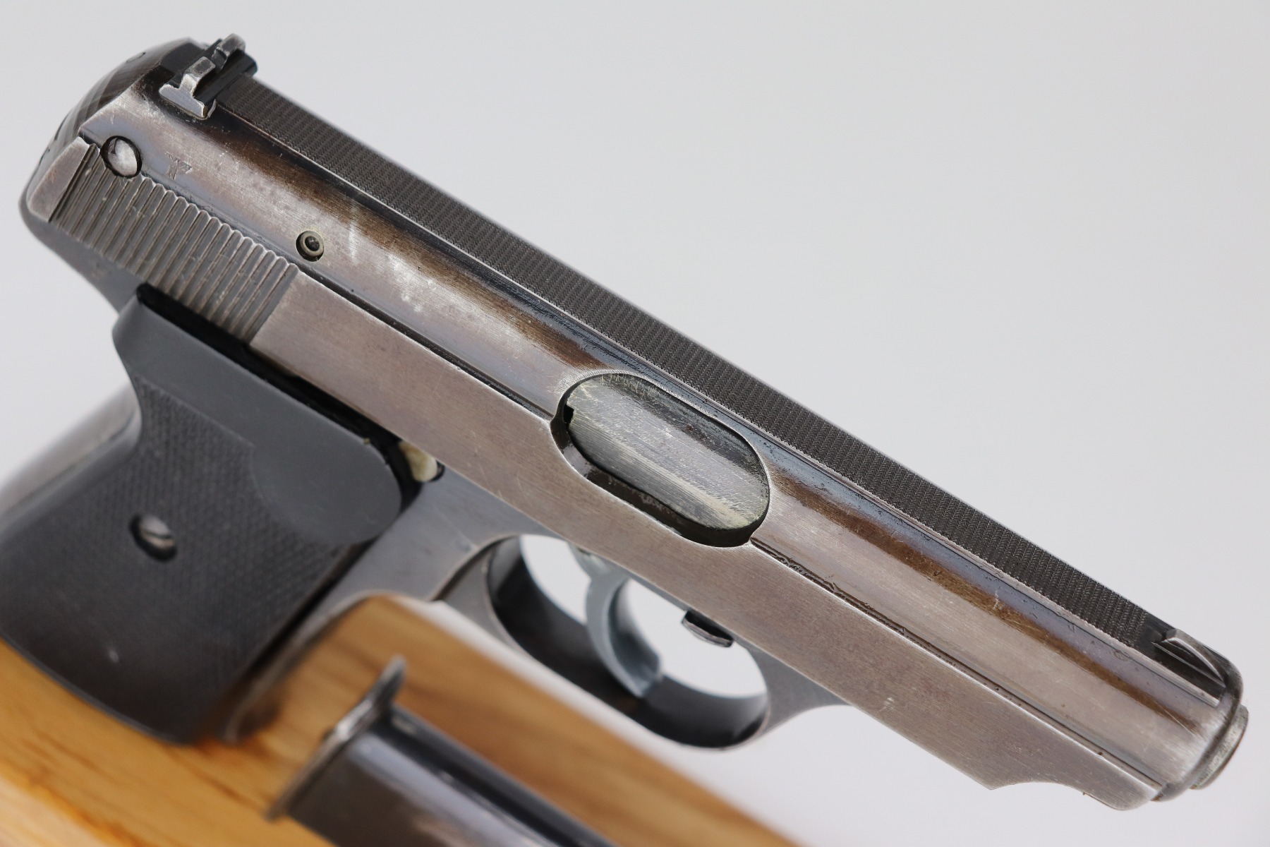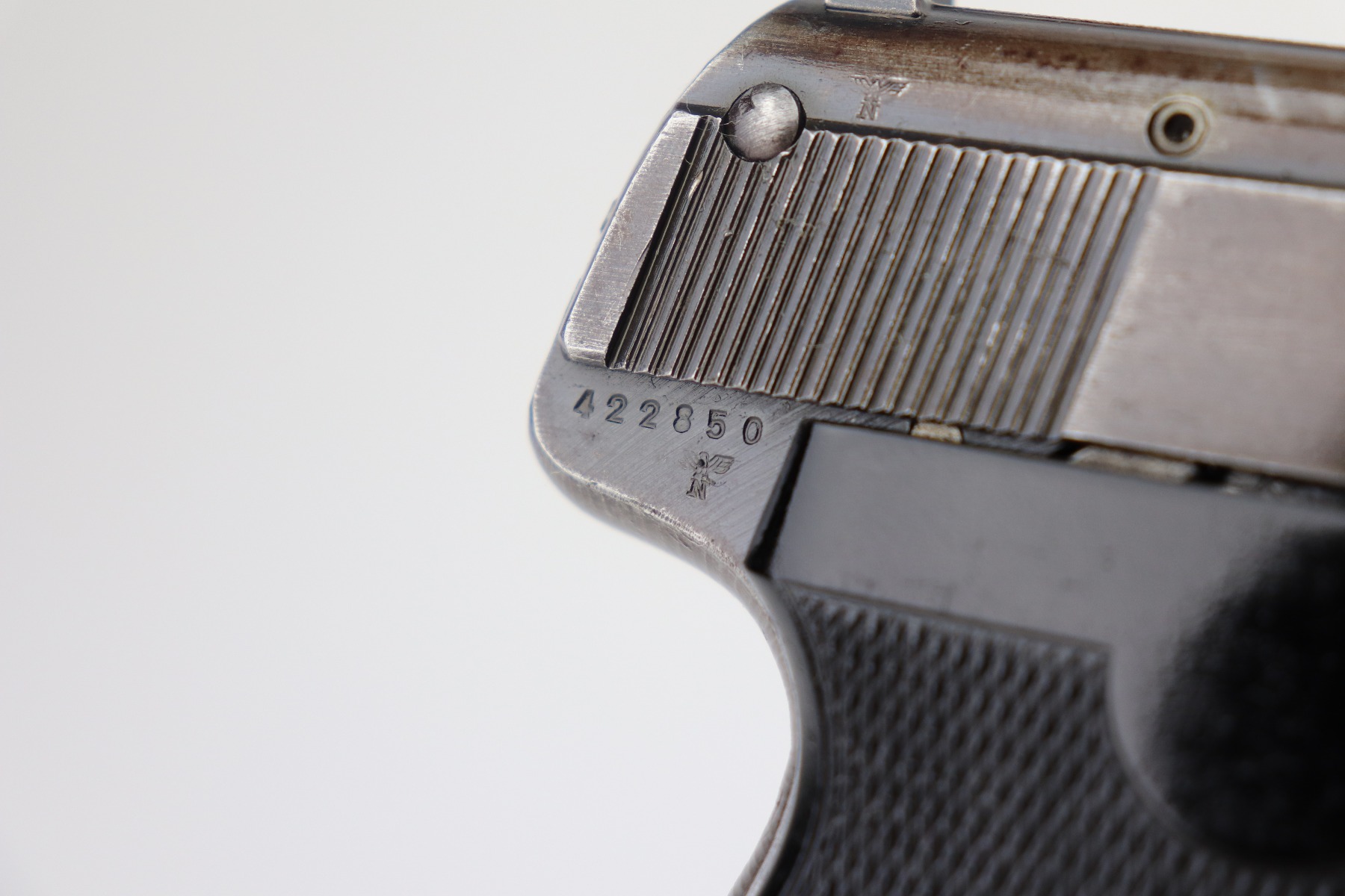 4/6/21 – This is a Sauer 38h issued to the Nazi police force during WW2. The gun is matching and has the proper police “Eagle C” proof. It has lost almost of its original finish. There is thinning and spotty oxidation throughout. Brown patina along the length of the slide. Comes with excellent grips and a period-correct magazine. The bore is shiny but the rifling is a little worn.