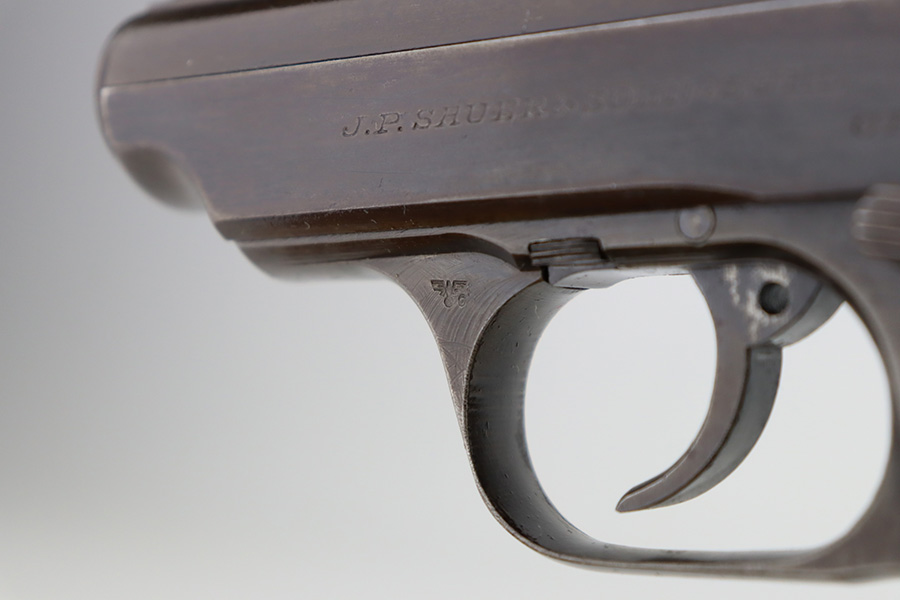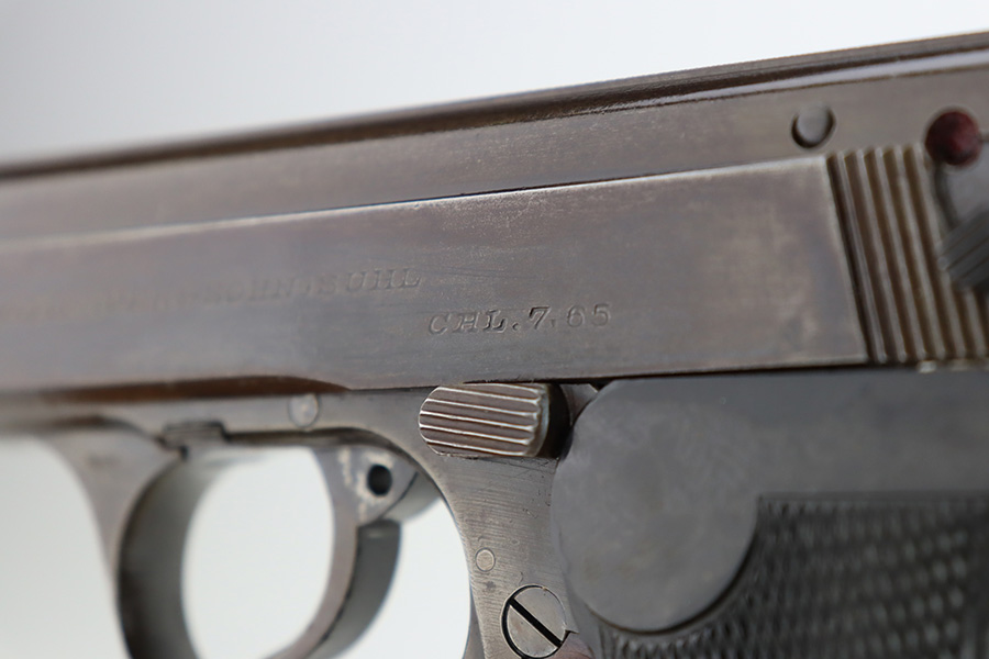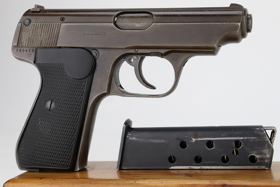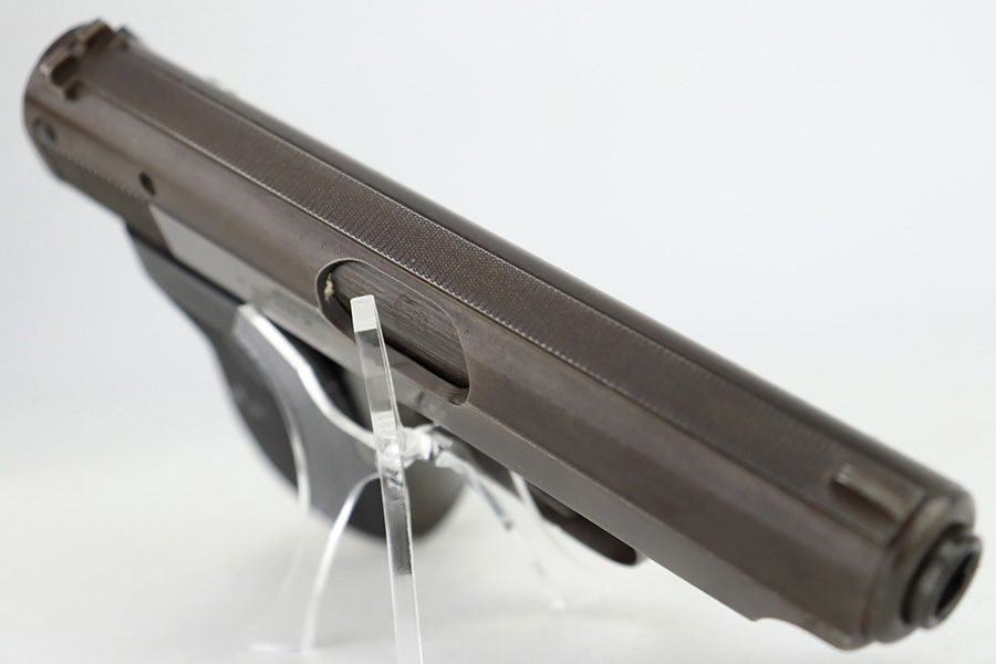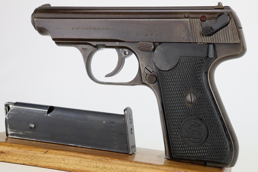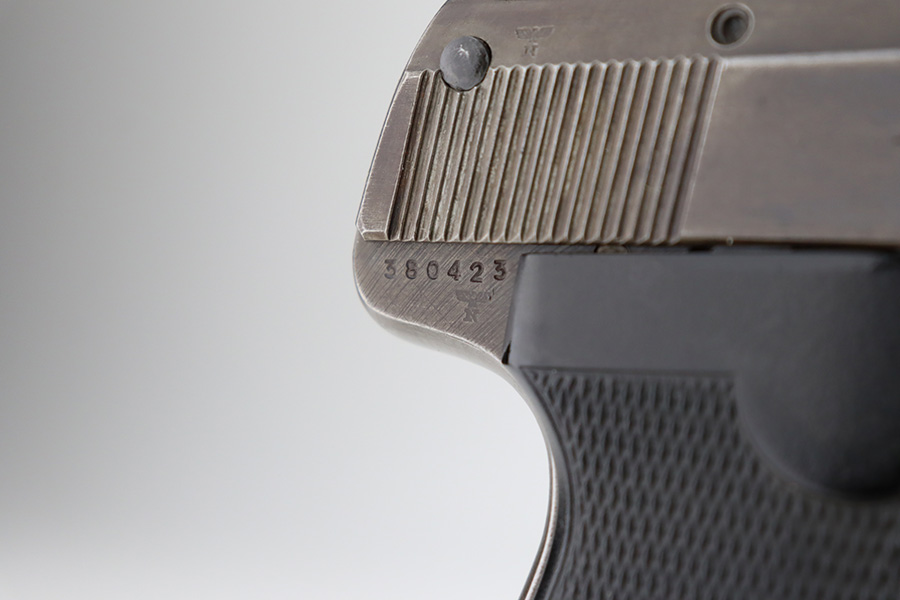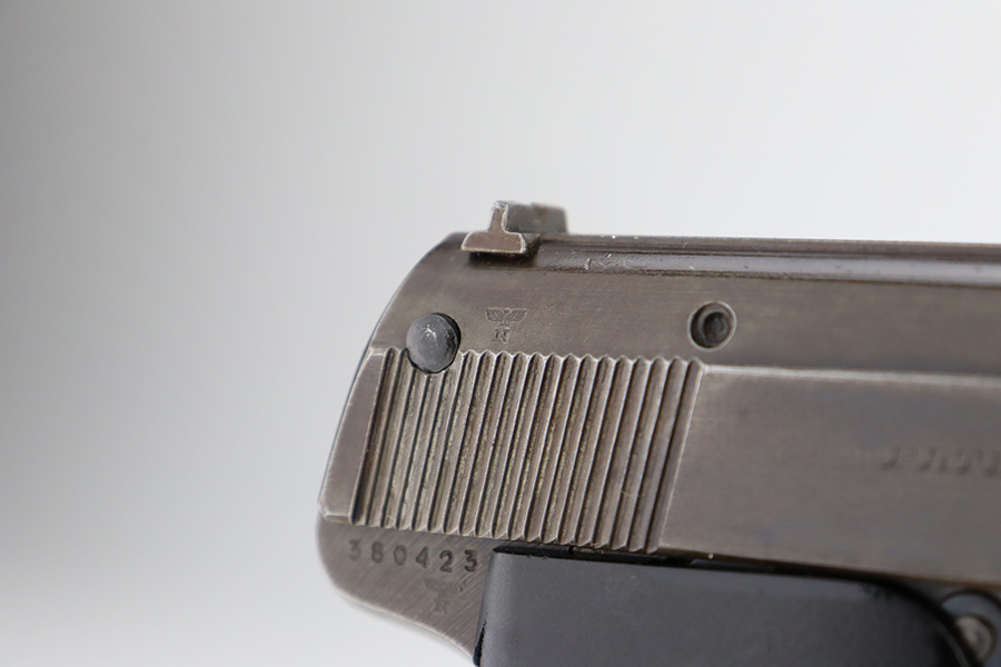 12/27/23 – This is a Sauer 38h issued to the Nazi police force during WW2. All matching with the proper “Eagle C” police proof. This one also comes with a matching police arsenal-numbered magazine. The finish rates about 95%. While there is very little actual finish loss, there is noticeable brown patina under the bluing throughout. Fitted with excellent black bakelite grips. Mint bore.