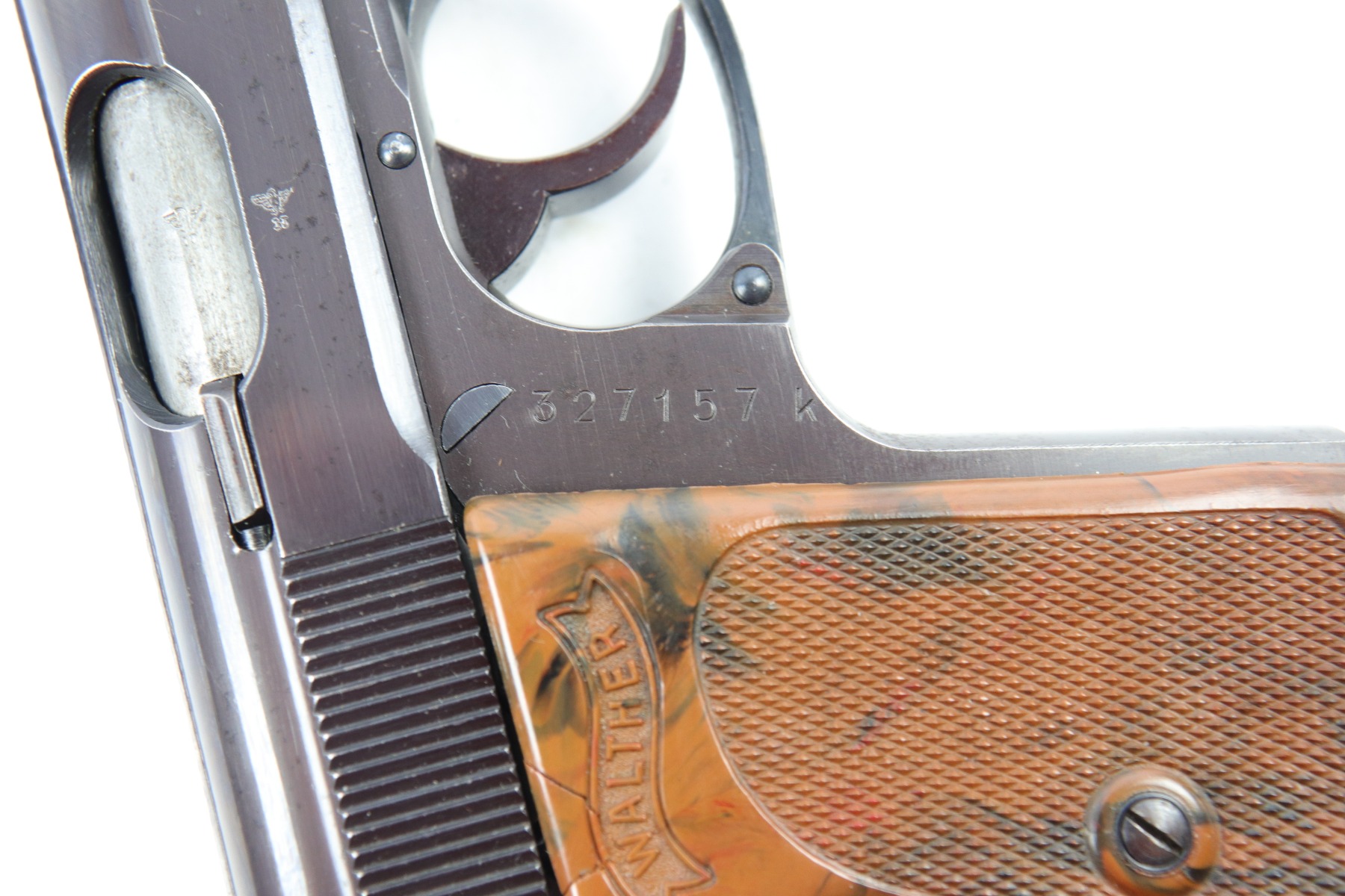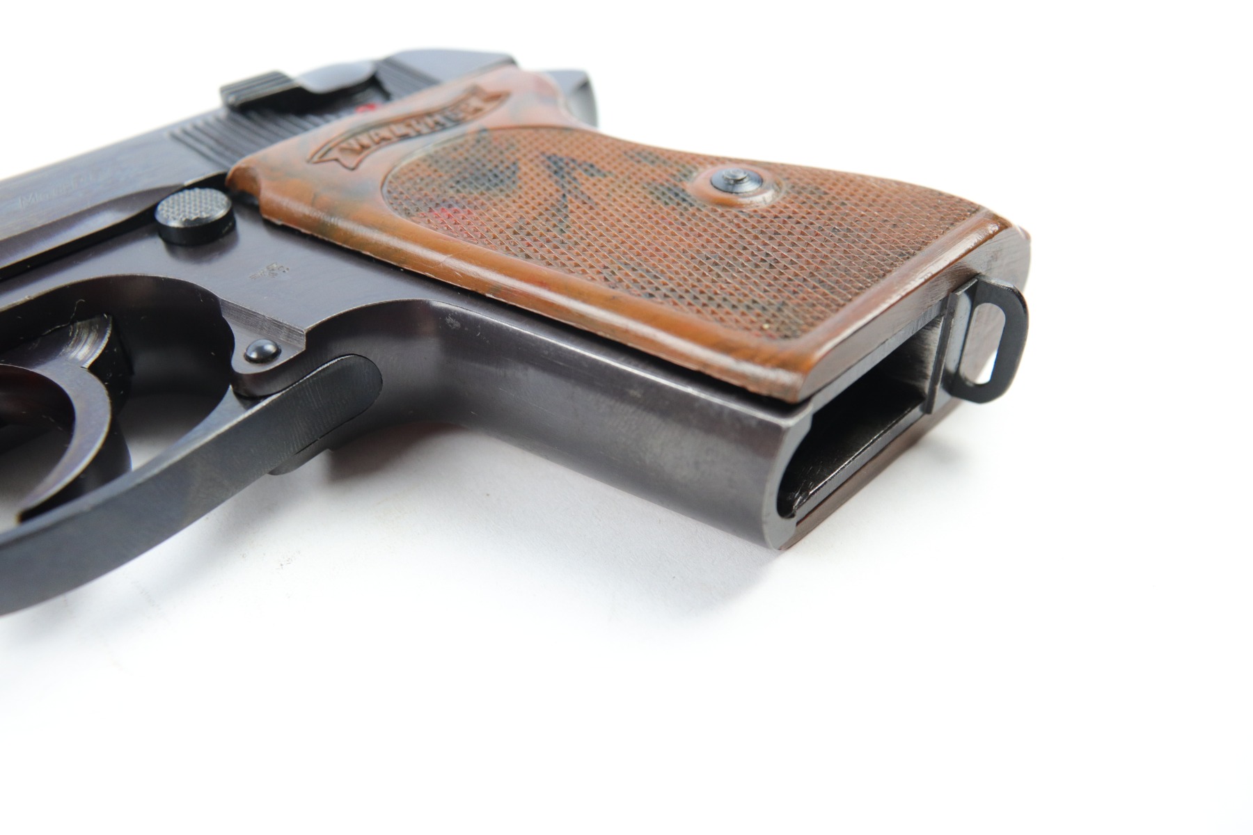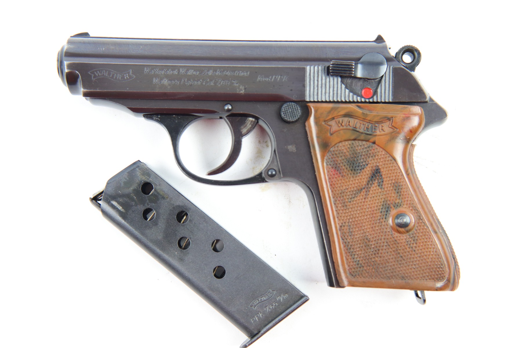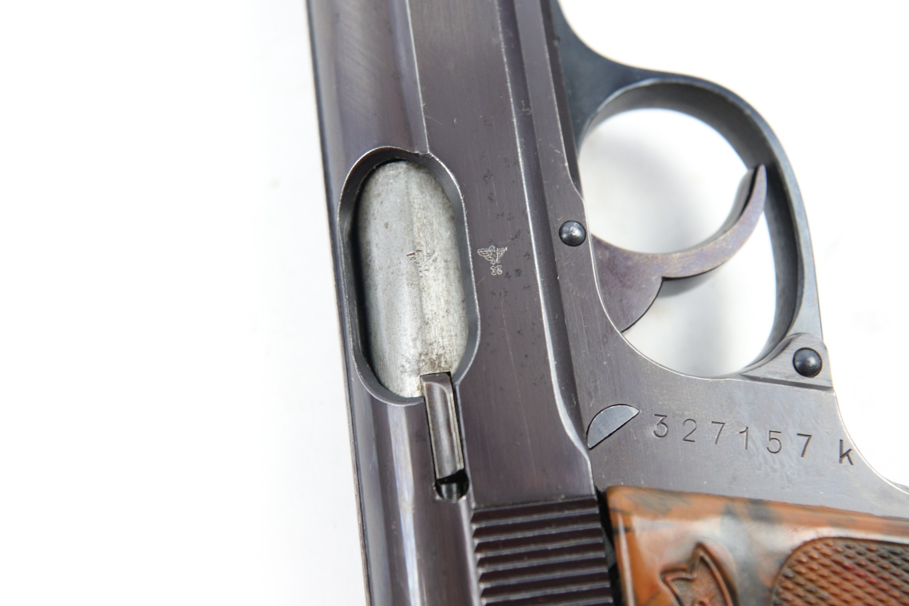 5/9/18 – This is an original Police Eagle/C Walther PPk. The pistol has a nice semi-plumb looking finish on both the slide and frame. The slide has some light edge wear and some spotty discoloration. This is light spots sporadically located on the slide. There’s similar wear on the front strap – some light patina throughout but the finish is still mostly clean and the patina is only visible under certain light. Overall the pistol looks very clean with about 97% of the finish in tact. The bore has very minor signs of use, and overall a 9 out of 10. Comes with an original wartime magazine and an excellent grip. The only notable grip flaw are the two small cracks on the right side near the Walther banner. Guaranteed original and fully functional.