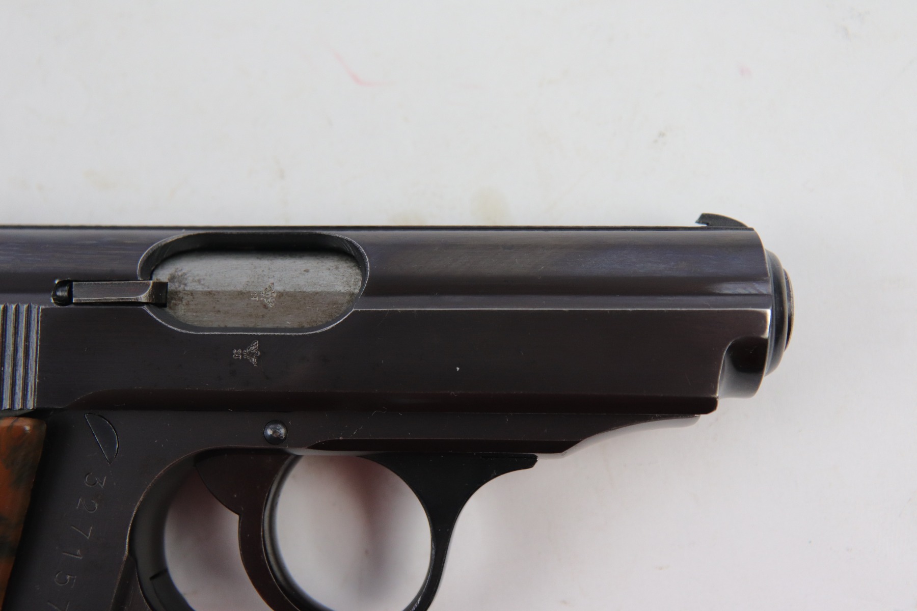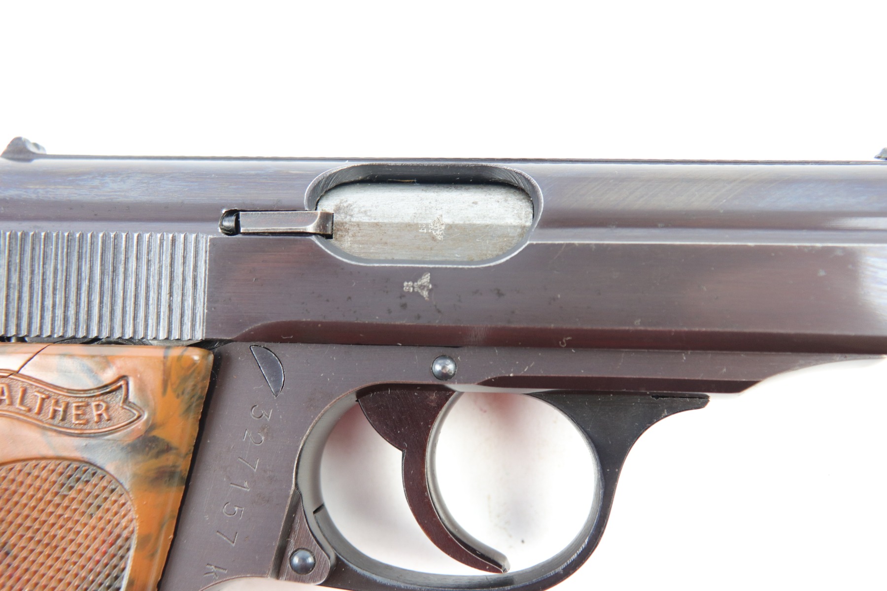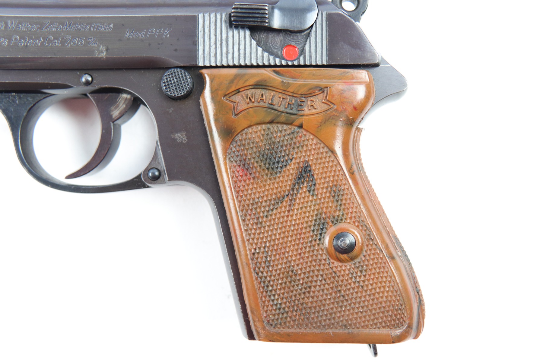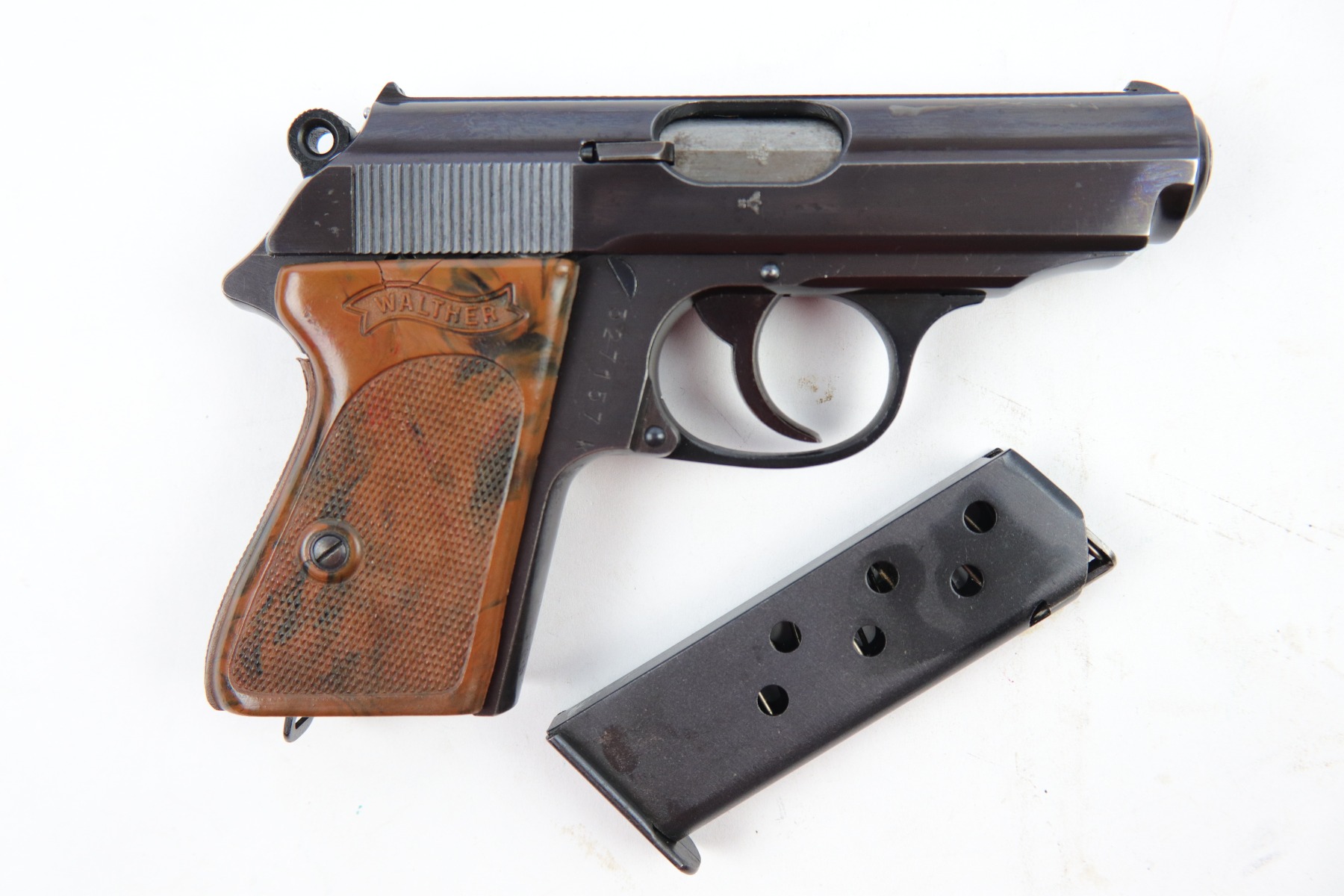 5/9/18 – This is an original Police Eagle/C Walther PPk. The pistol has a nice semi-plumb looking finish on both the slide and frame. The slide has some light edge wear and some spotty discoloration. This is light spots sporadically located on the slide. There’s similar wear on the front strap – some light patina throughout but the finish is still mostly clean and the patina is only visible under certain light. Overall the pistol looks very clean with about 97% of the finish in tact. The bore has very minor signs of use, and overall a 9 out of 10. Comes with an original wartime magazine and an excellent grip. The only notable grip flaw are the two small cracks on the right side near the Walther banner. Guaranteed original and fully functional.