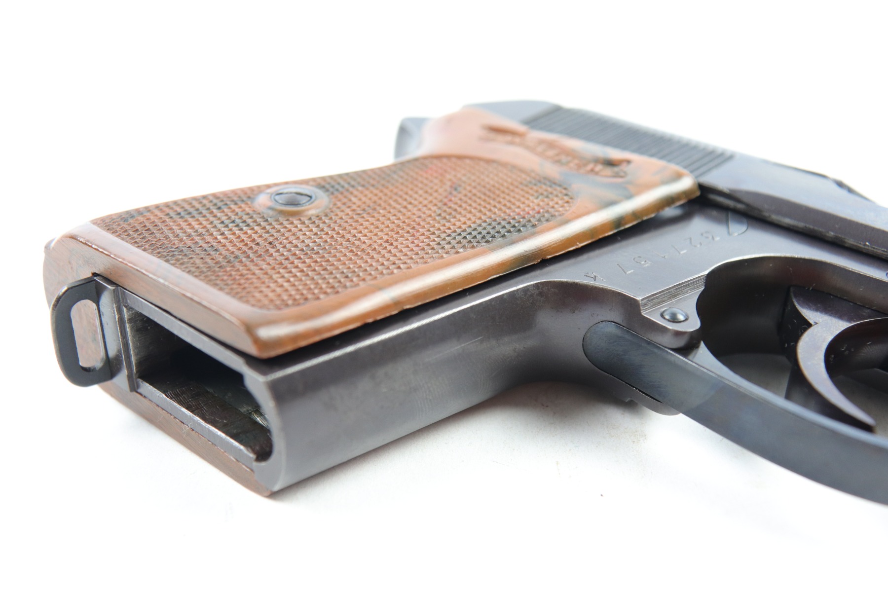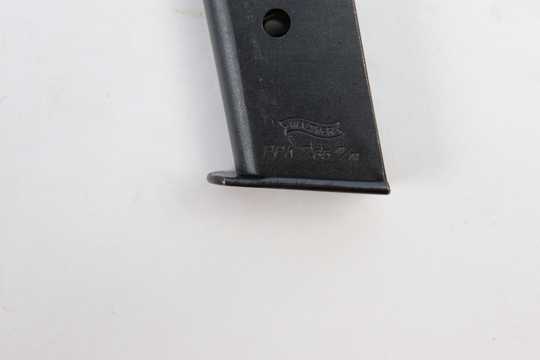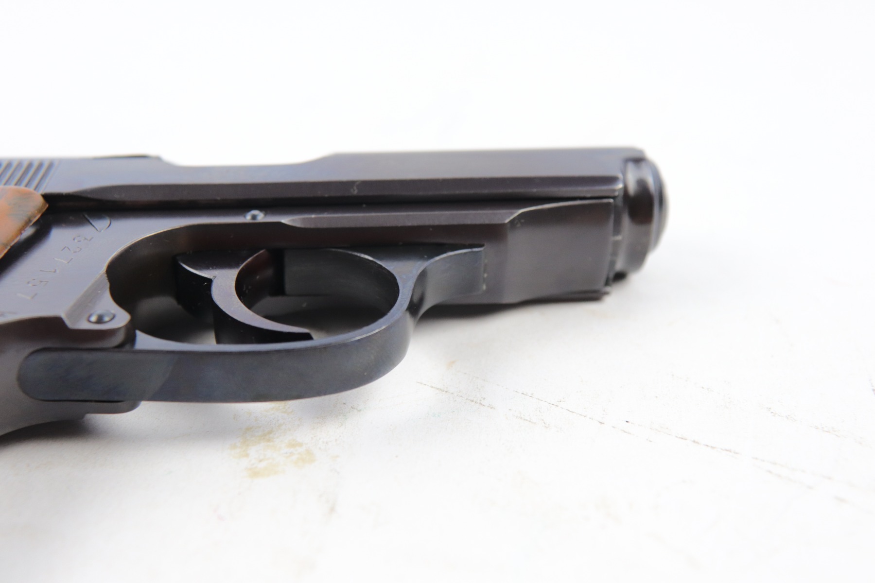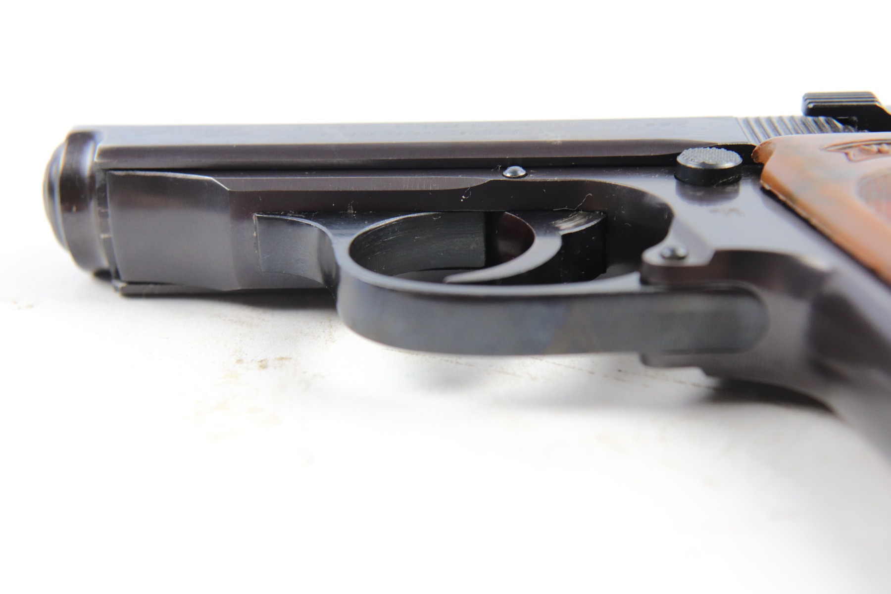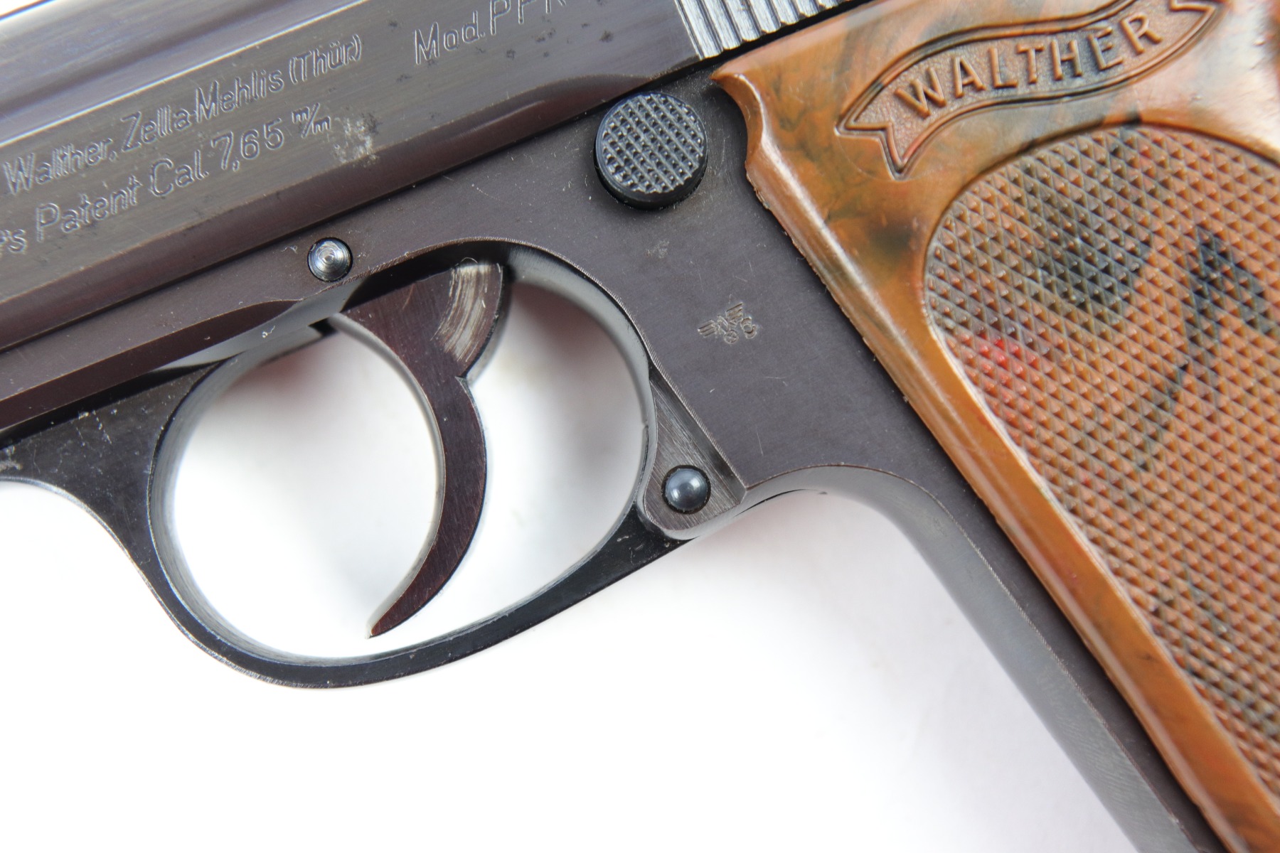 5/9/18 – This is an original Police Eagle/C Walther PPk. The pistol has a nice semi-plumb looking finish on both the slide and frame. The slide has some light edge wear and some spotty discoloration. This is light spots sporadically located on the slide. There’s similar wear on the front strap – some light patina throughout but the finish is still mostly clean and the patina is only visible under certain light. Overall the pistol looks very clean with about 97% of the finish in tact. The bore has very minor signs of use, and overall a 9 out of 10. Comes with an original wartime magazine and an excellent grip. The only notable grip flaw are the two small cracks on the right side near the Walther banner. Guaranteed original and fully functional.