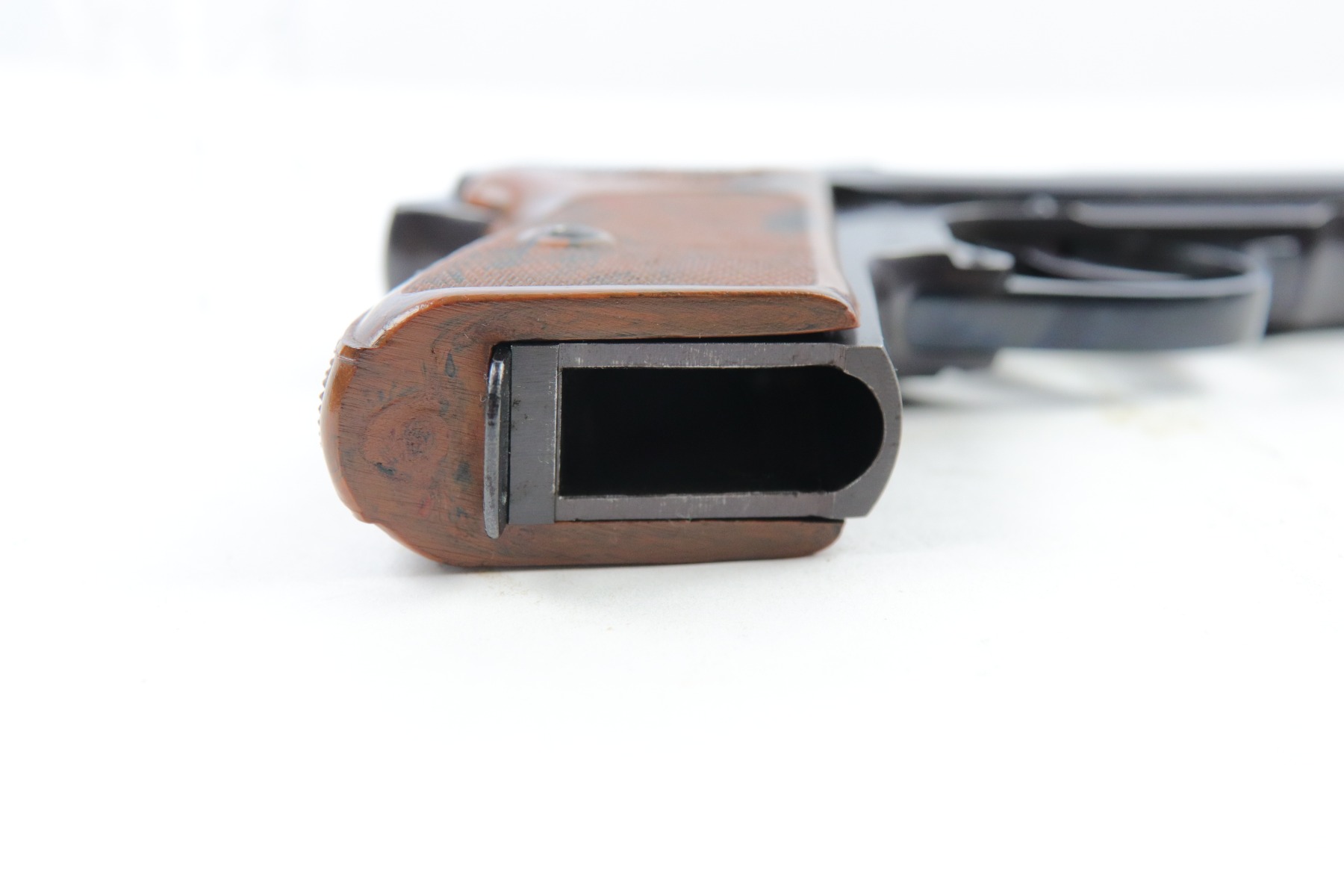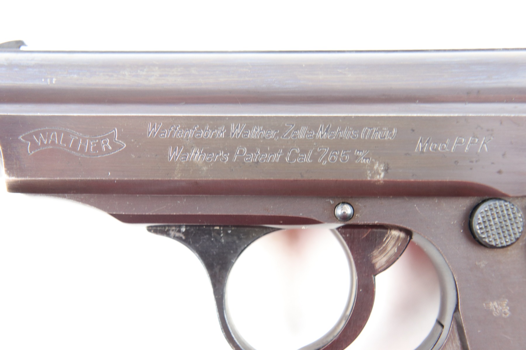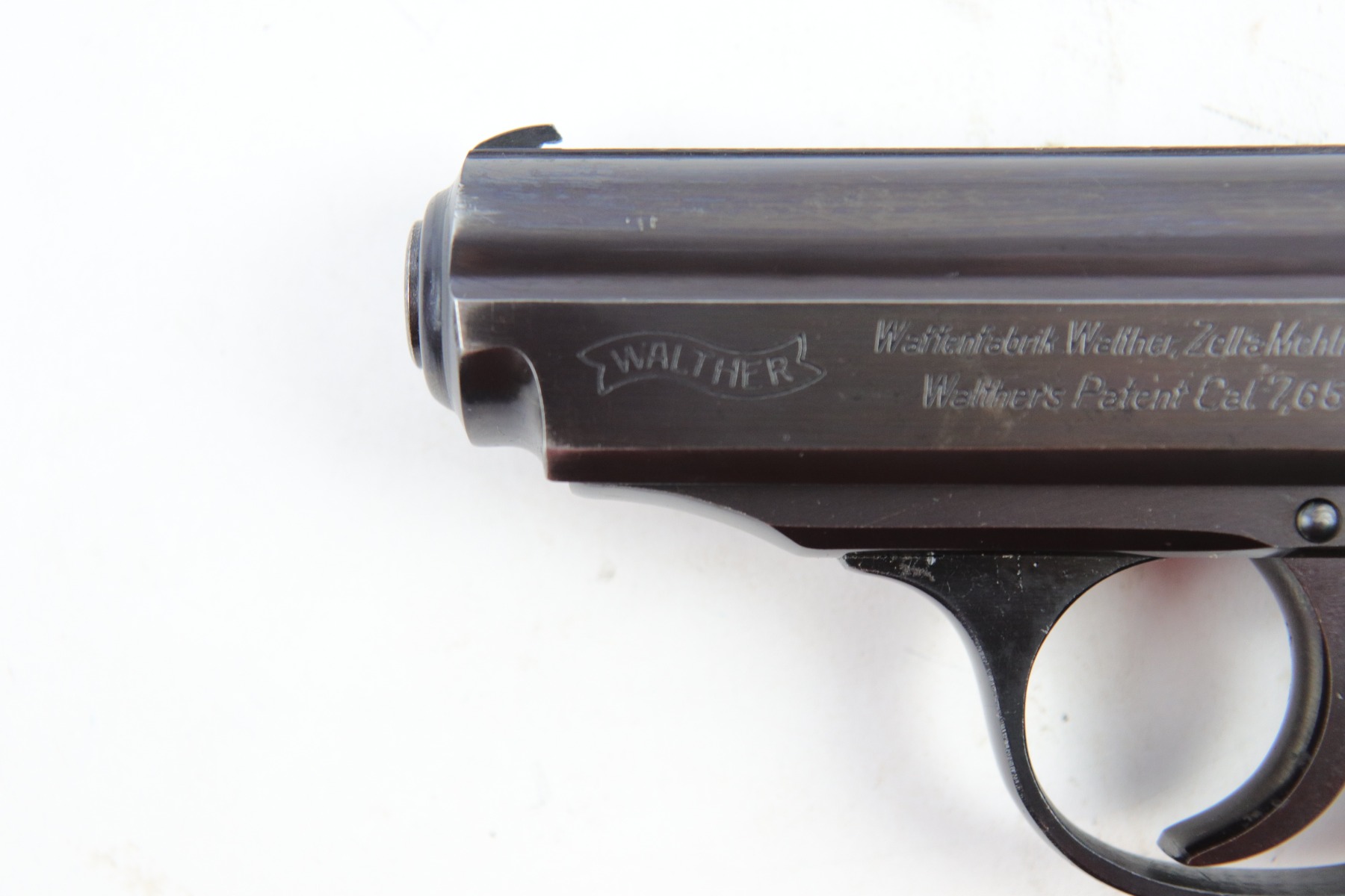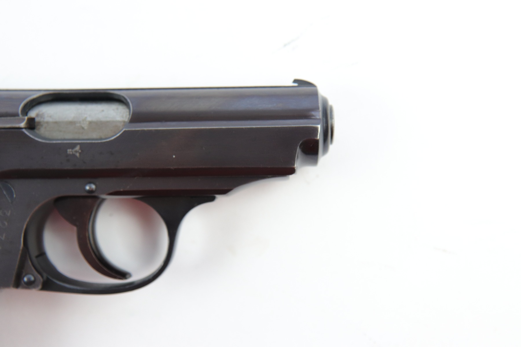 5/9/18 – This is an original Police Eagle/C Walther PPk. The pistol has a nice semi-plumb looking finish on both the slide and frame. The slide has some light edge wear and some spotty discoloration. This is light spots sporadically located on the slide. There’s similar wear on the front strap – some light patina throughout but the finish is still mostly clean and the patina is only visible under certain light. Overall the pistol looks very clean with about 97% of the finish in tact. The bore has very minor signs of use, and overall a 9 out of 10. Comes with an original wartime magazine and an excellent grip. The only notable grip flaw are the two small cracks on the right side near the Walther banner. Guaranteed original and fully functional.