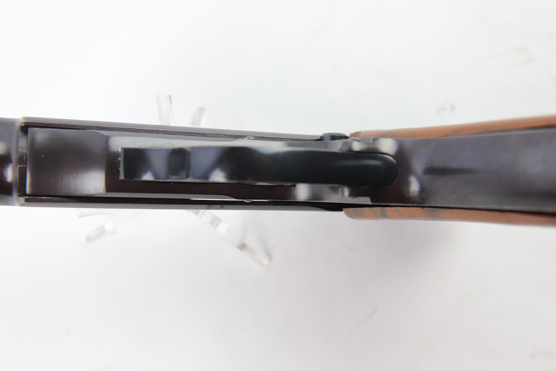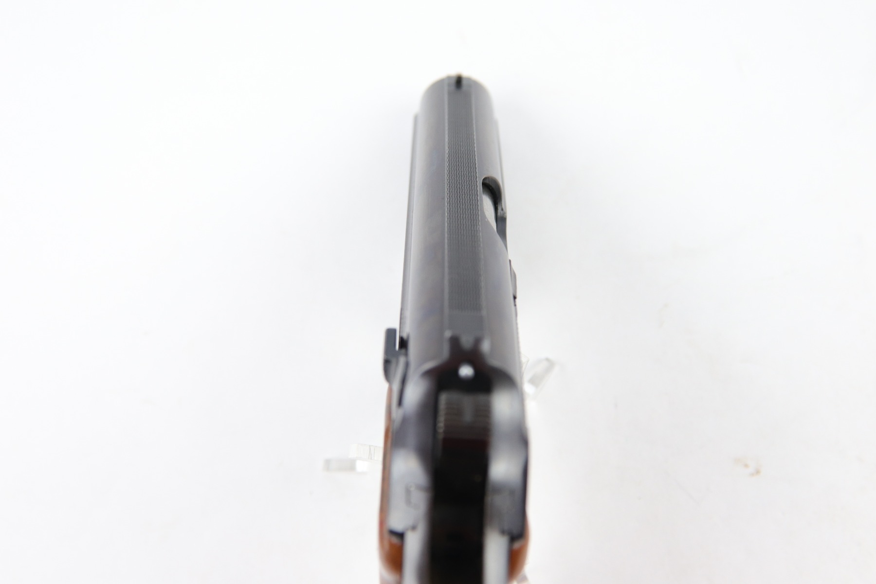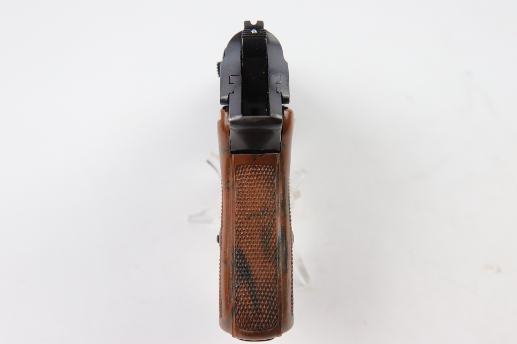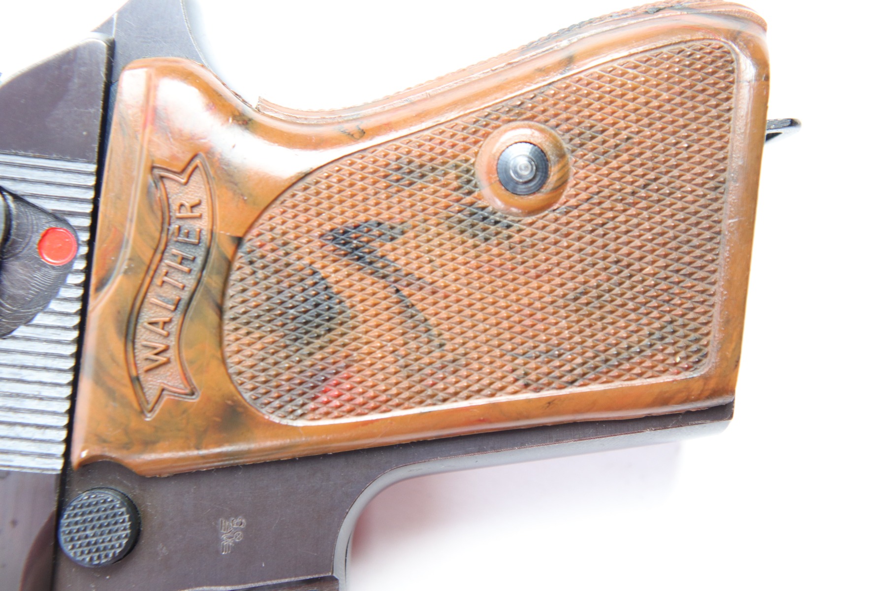 5/9/18 – This is an original Police Eagle/C Walther PPk. The pistol has a nice semi-plumb looking finish on both the slide and frame. The slide has some light edge wear and some spotty discoloration. This is light spots sporadically located on the slide. There’s similar wear on the front strap – some light patina throughout but the finish is still mostly clean and the patina is only visible under certain light. Overall the pistol looks very clean with about 97% of the finish in tact. The bore has very minor signs of use, and overall a 9 out of 10. Comes with an original wartime magazine and an excellent grip. The only notable grip flaw are the two small cracks on the right side near the Walther banner. Guaranteed original and fully functional.