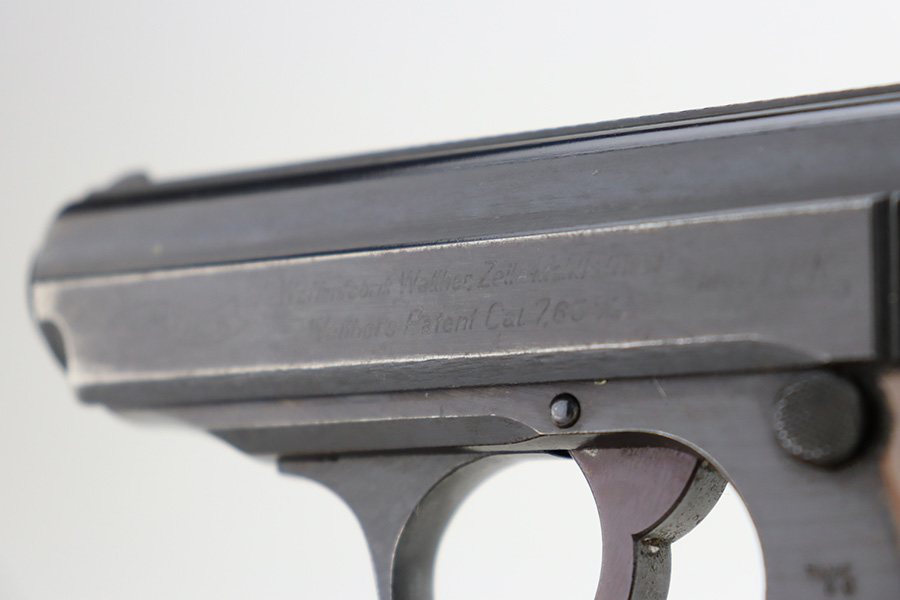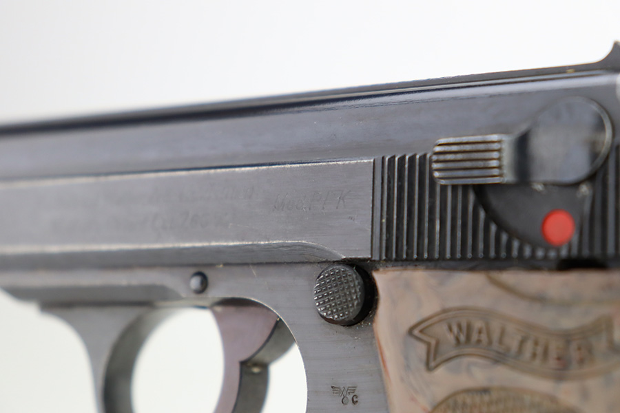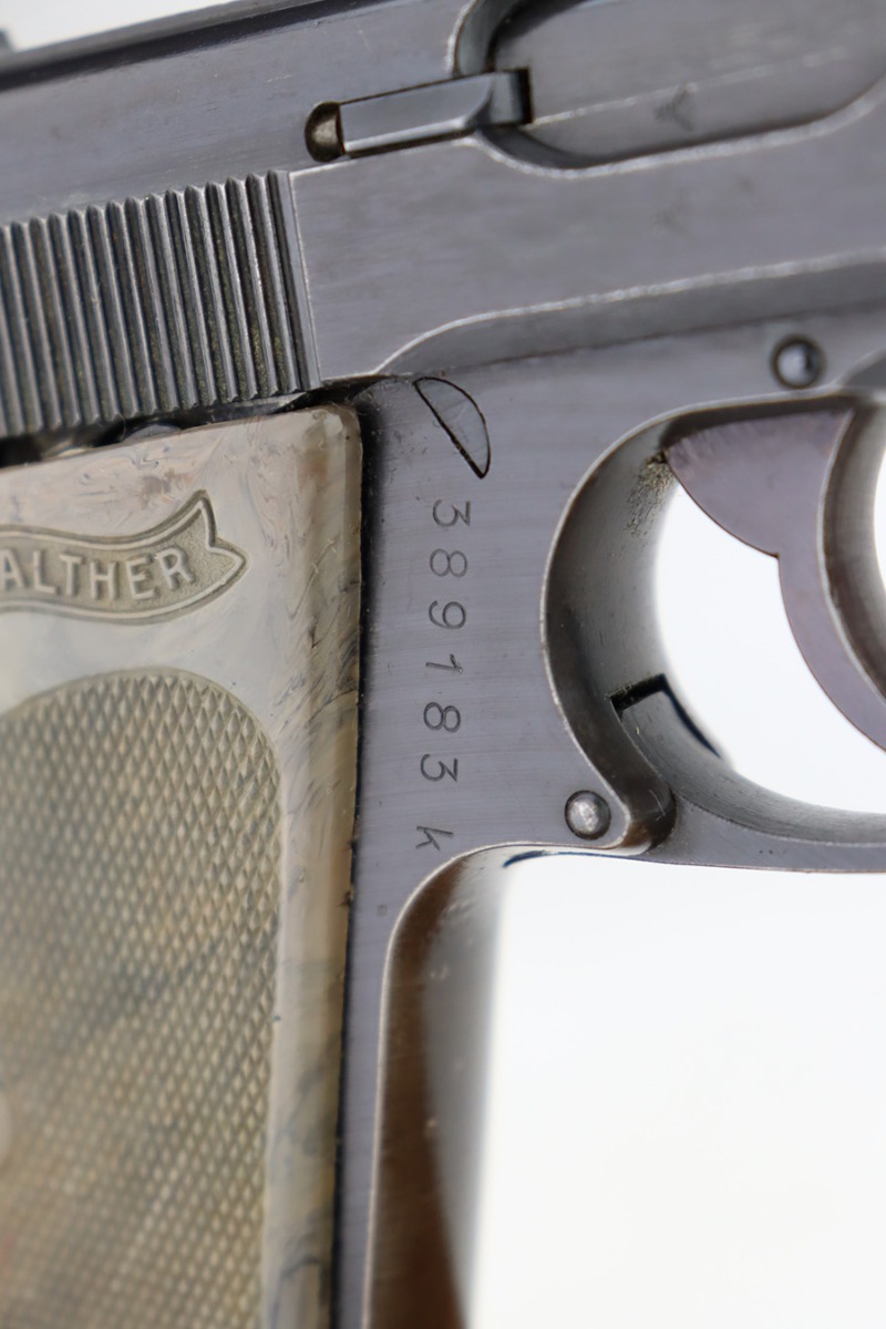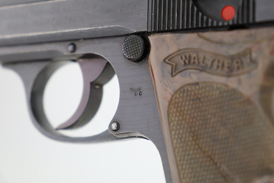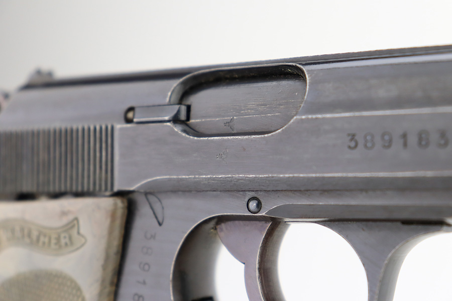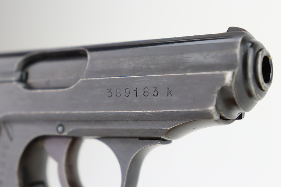 12/27/23 – This is an excellent example of a Walther PPK issued to the Nazi police force in 1943. All matching with the proper “Eagle C” police proof. This one also comes fitted with a nice gray-colored grip – there are notches carved into both sides and a noticeable crack on the left side. The original wartime finish rates about 96-97% with just very minor muzzle and high edge wear. Mint bore. Comes with a proper wartime magazine.