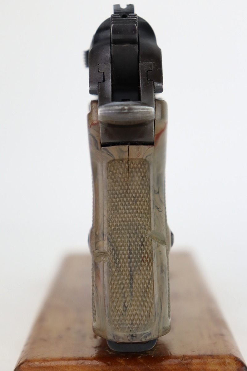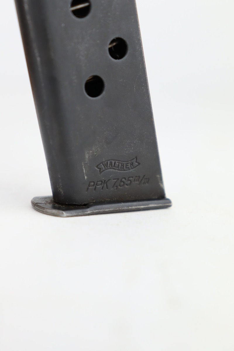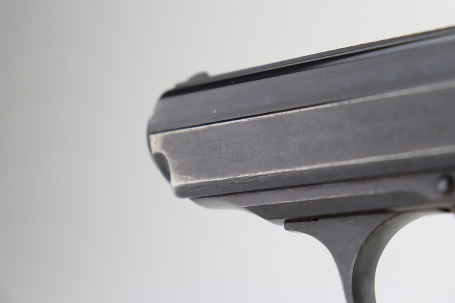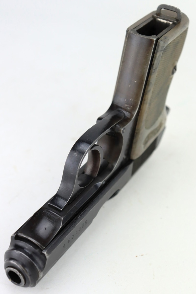 12/27/23 – This is an excellent example of a Walther PPK issued to the Nazi police force in 1943. All matching with the proper “Eagle C” police proof. This one also comes fitted with a nice gray-colored grip – there are notches carved into both sides and a noticeable crack on the left side. The original wartime finish rates about 96-97% with just very minor muzzle and high edge wear. Mint bore. Comes with a proper wartime magazine.