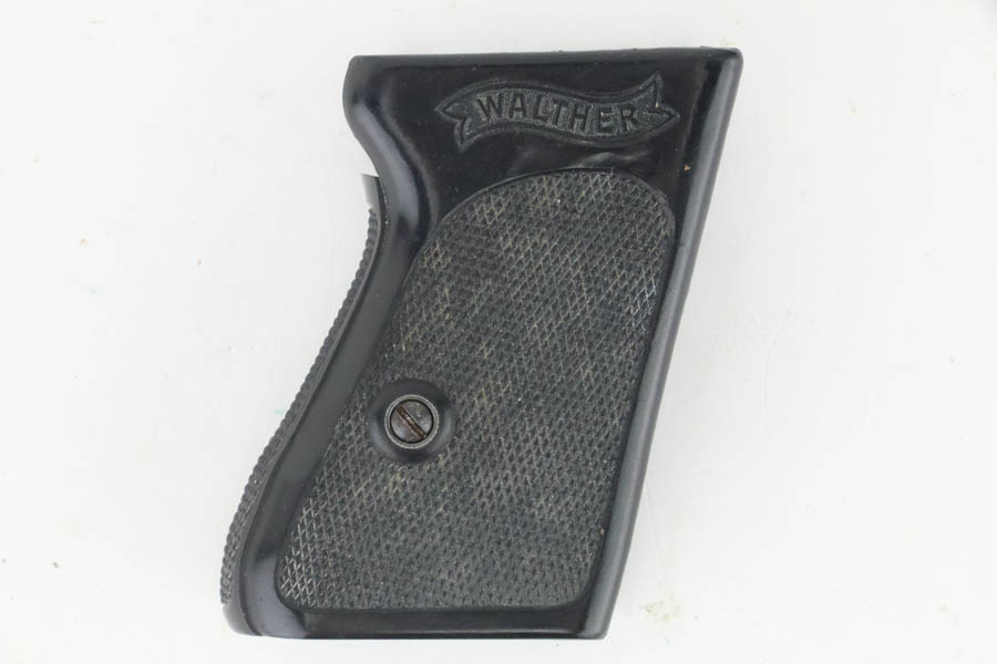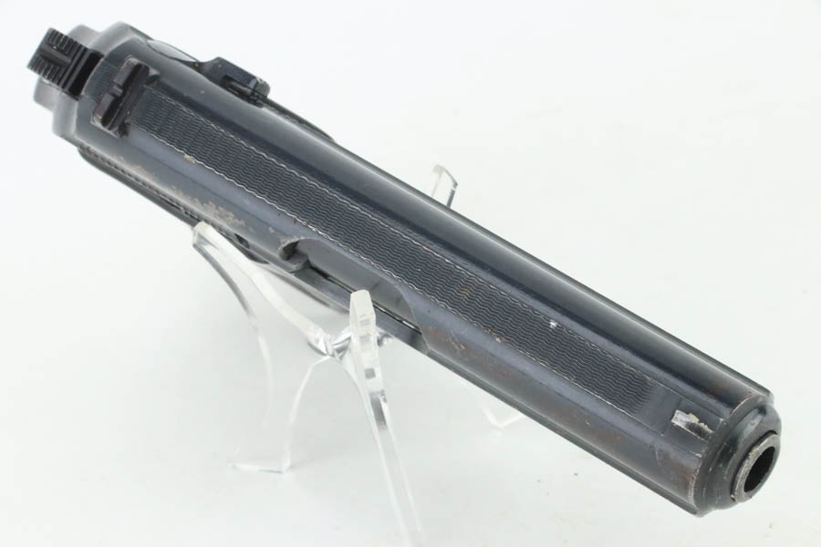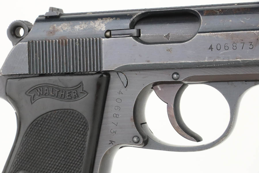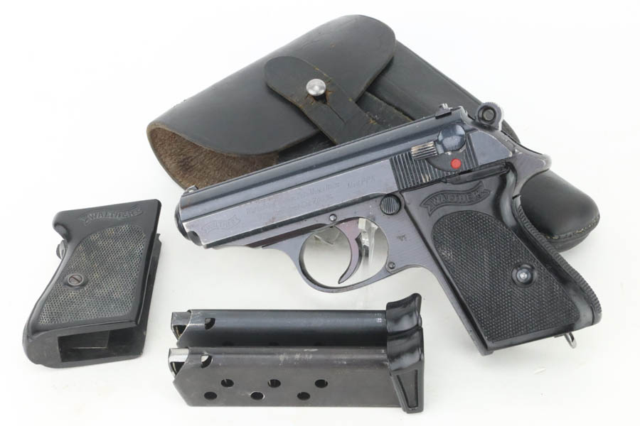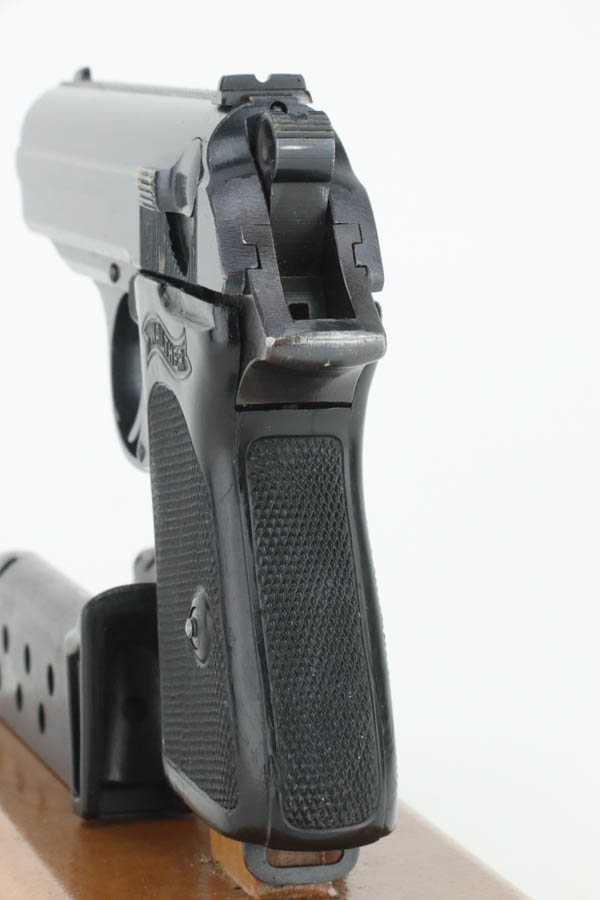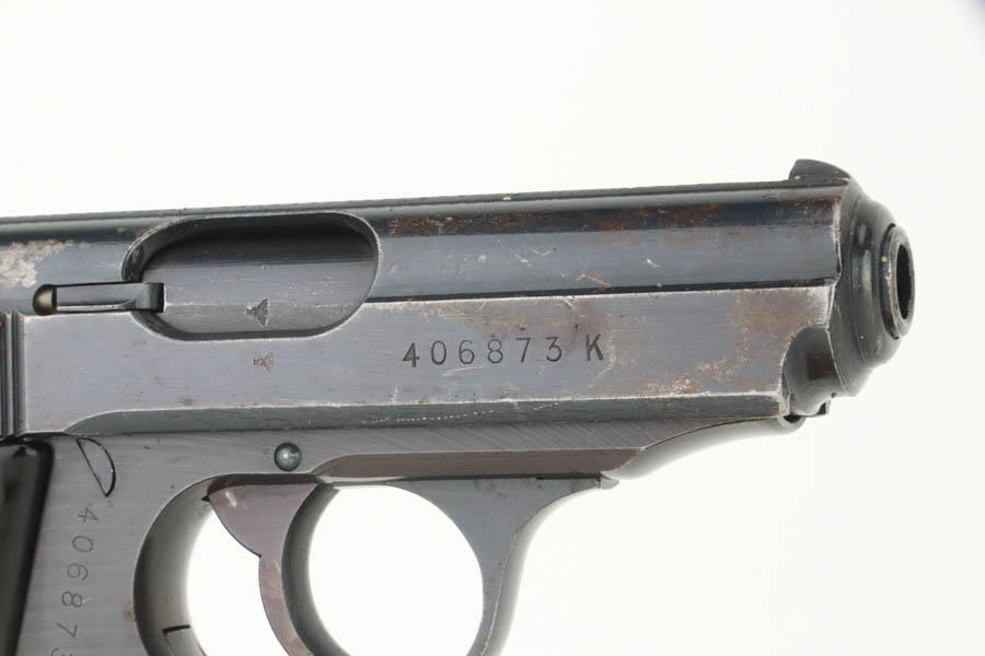 8/9/24 – This is a very nice example of a Walther PPK issued to the Nazi police force in 1943. It is all matching with the proper police “Eagle C” marking on the left side of the frame. This one comes fitted with an excellent black bakelite grip (includes a spare black grip as well). It comes as a rig with a very nice black leather Akah-marked holster and two period-correct black finger extension magazines. The gun itself has retained about 90% of its original wartime finish. The most obvious sign of wear is the spotty discoloration on the right side of the slide. Excellent, shiny bore.