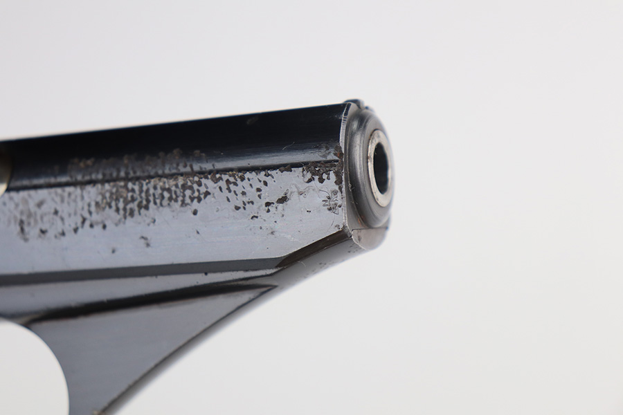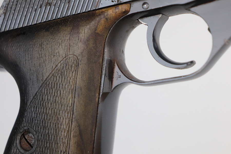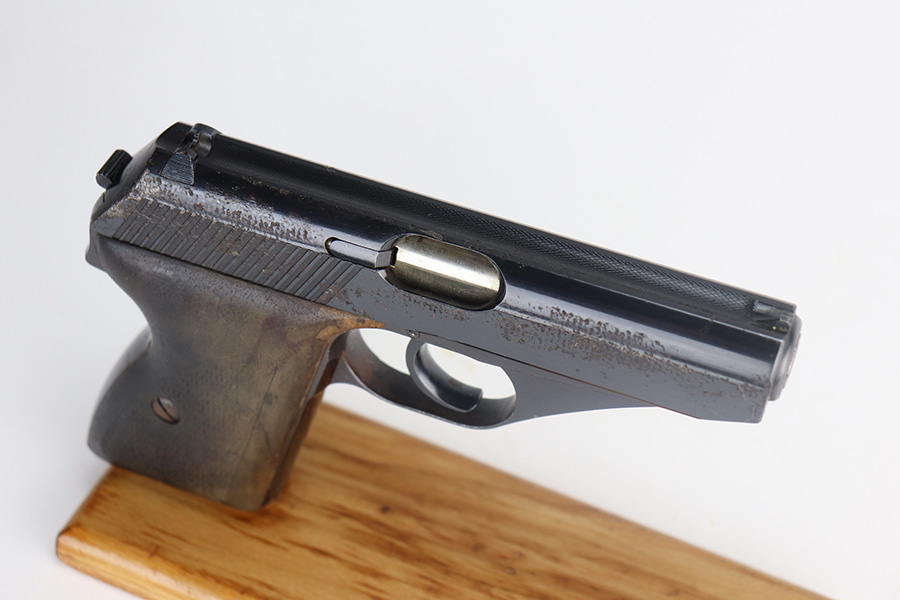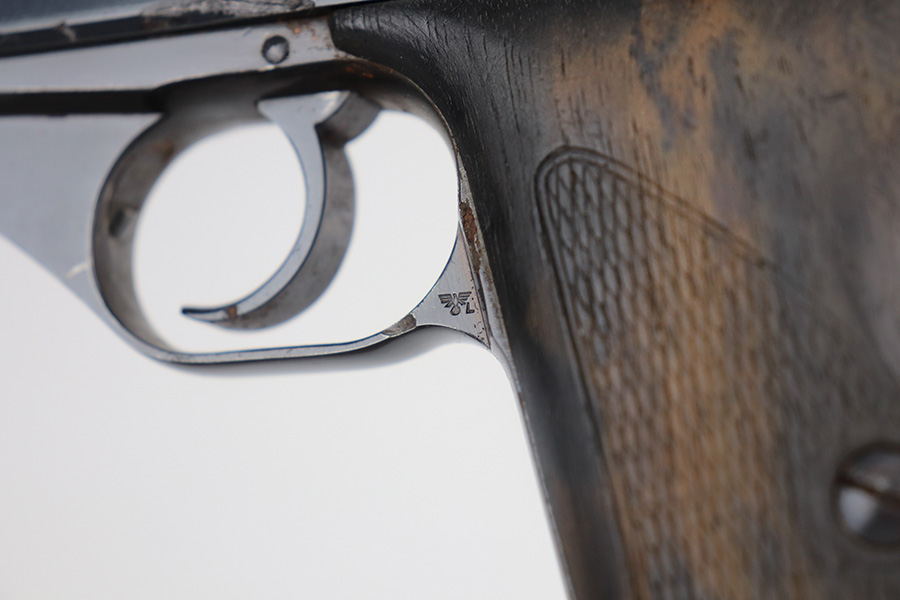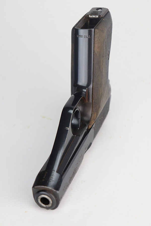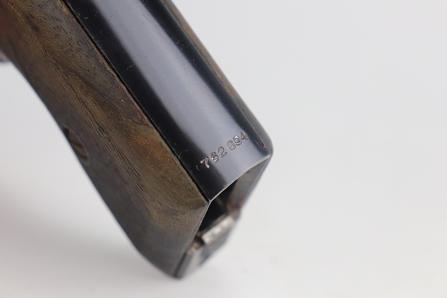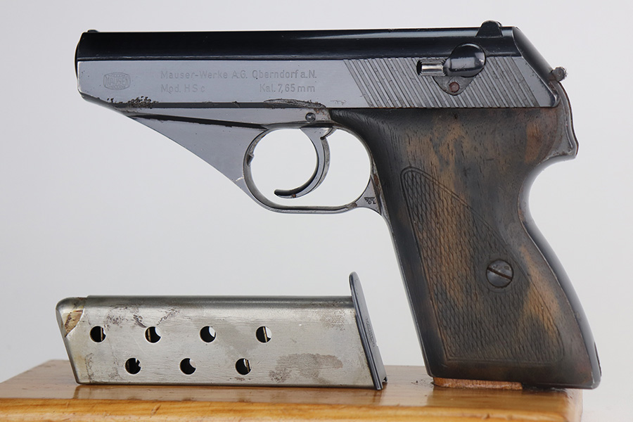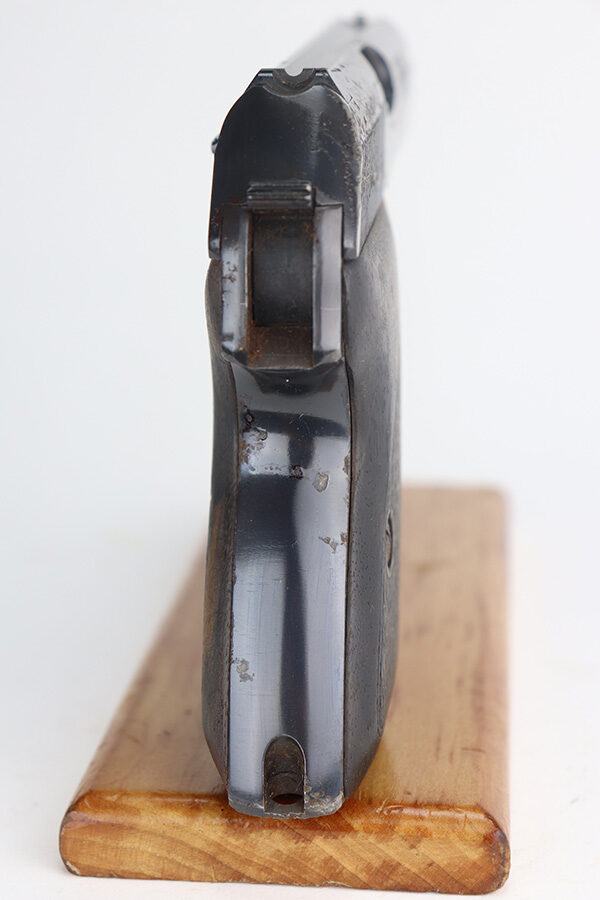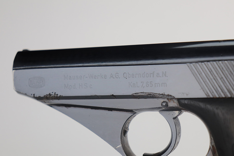 5/24/21 – This is a nice example of a Mauser HSC issued to the Nazi police force in 1942. The gun is matching and has the proper police “Eagle L” marking. The gun has retained more than 98% of its original high polish finish. While there is next-to-no finish loss, there are areas of significant pitting on the whole right side of the slide, bottom edge of the left side of the slide, and back strap. If it weren’t for the pitting, the gun would be mint. Comes with nice grips and a period-correct grips and a proper magazine. The bore is excellent – shiny with strong rifling.