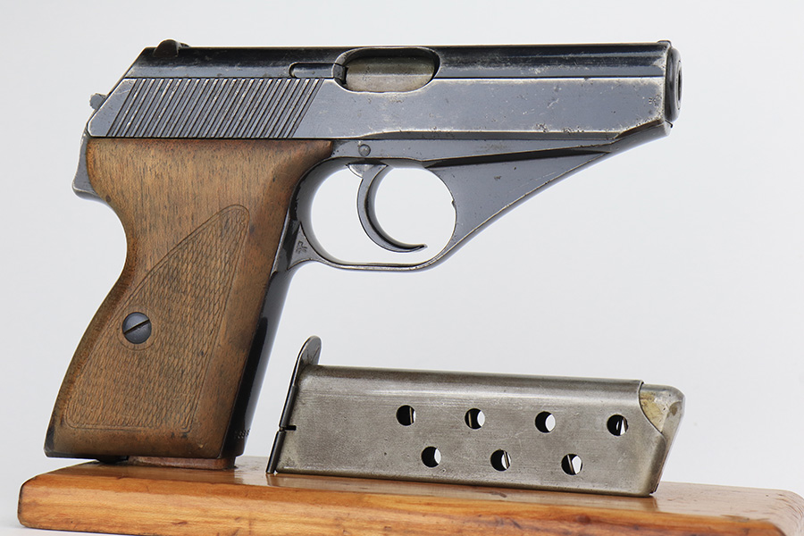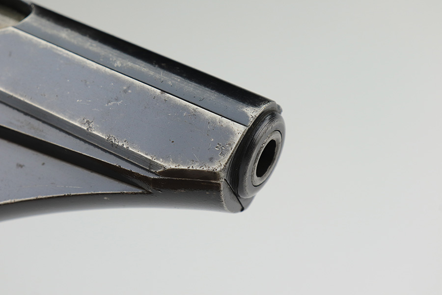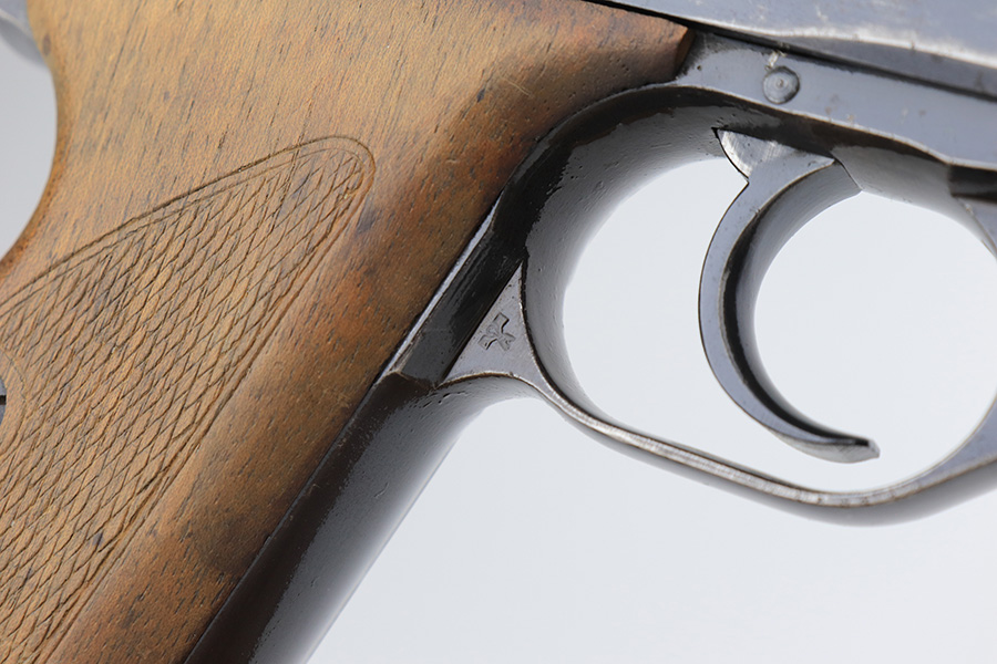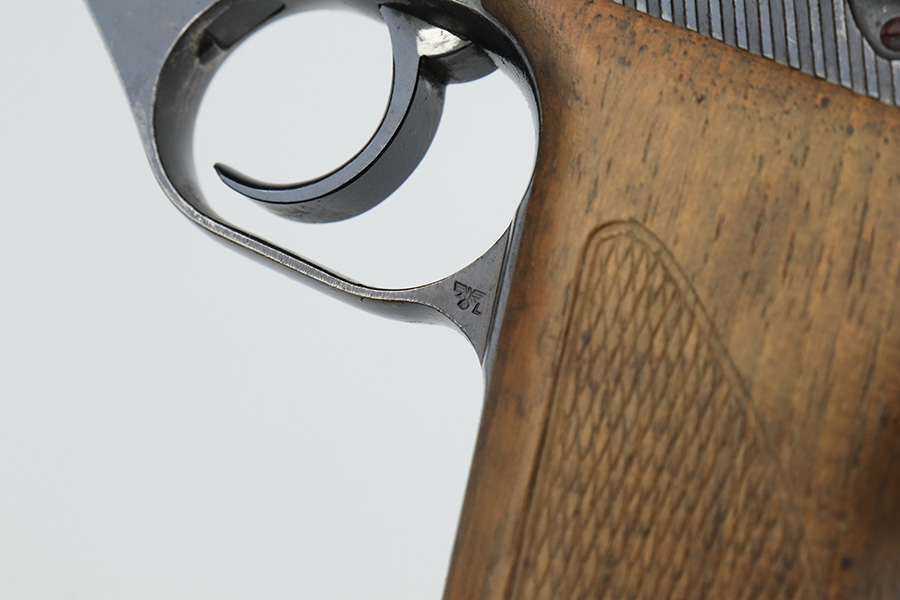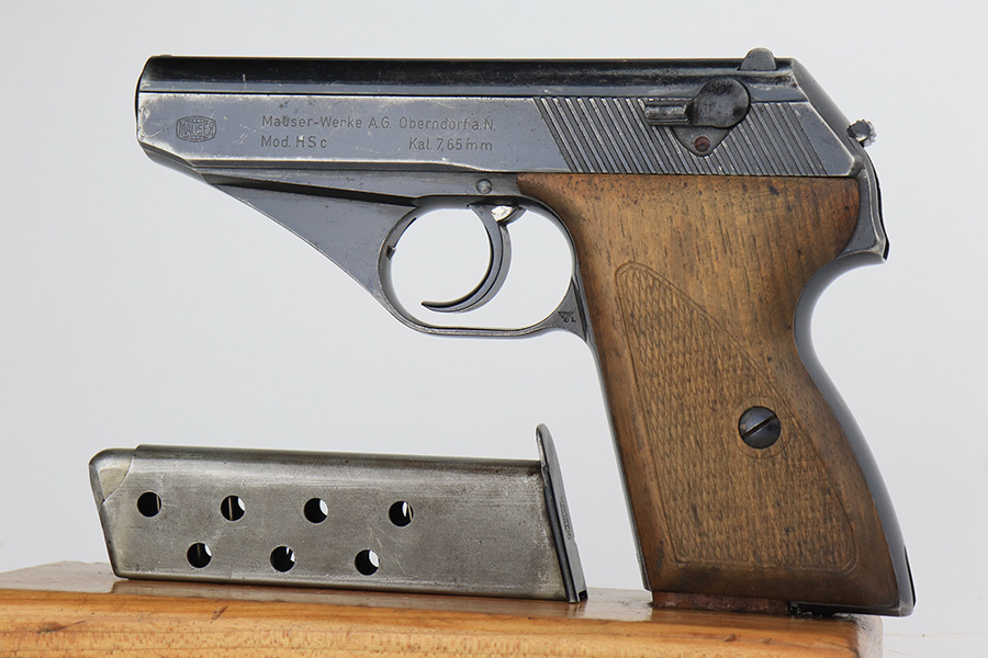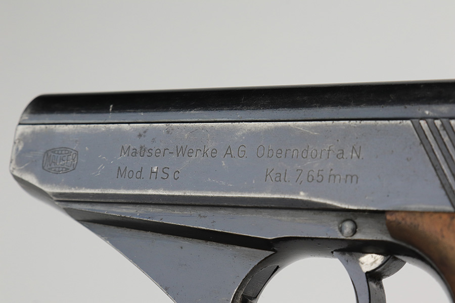 2/1/23 – This is a nice example of a Mauser HSC issued to the Nazi police force in 1942. The gun is matching and has the proper police “Eagle L” marking. The gun has retained about 85% of its original high polish finish. There is light spotty wear along both sides of the slide and some tiny handling marks on the grip straps. Fitted with nice period-correct wood grips and comes with one proper magazine. The bore has strong rifling and is shiny for the most part with some very light pin-pricking here and there.