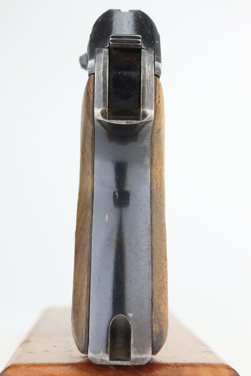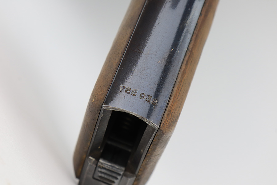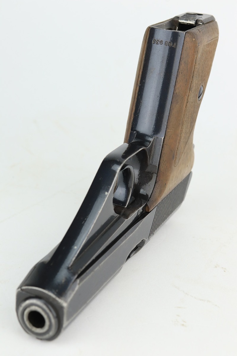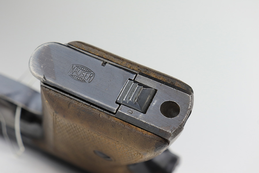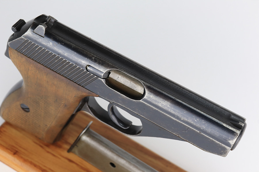 2/1/23 – This is a nice example of a Mauser HSC issued to the Nazi police force in 1942. The gun is matching and has the proper police “Eagle L” marking. The gun has retained about 85% of its original high polish finish. There is light spotty wear along both sides of the slide and some tiny handling marks on the grip straps. Fitted with nice period-correct wood grips and comes with one proper magazine. The bore has strong rifling and is shiny for the most part with some very light pin-pricking here and there.