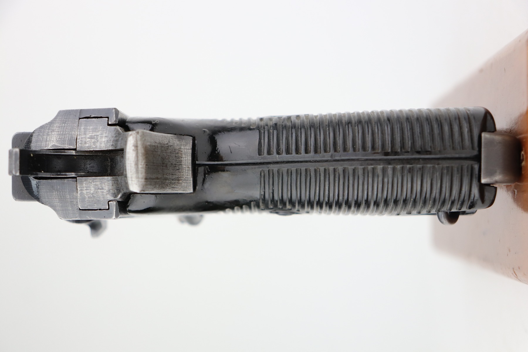 4/2/21 – This is a very nice example of a Walther P.38 issued to the Nazi police force in 1943. The gun is all matching and has the proper police “Eagle L” proof. It has retained roughly 85% of its original bluing. Most of the wear is on the straps. There are also areas of wear on both sides of the slide. Minor wear around the muzzle and high edges of the slide. Comes with excellent grips and a rare “U” marked magazine. The bore is near-mint. De-cocker is functional.