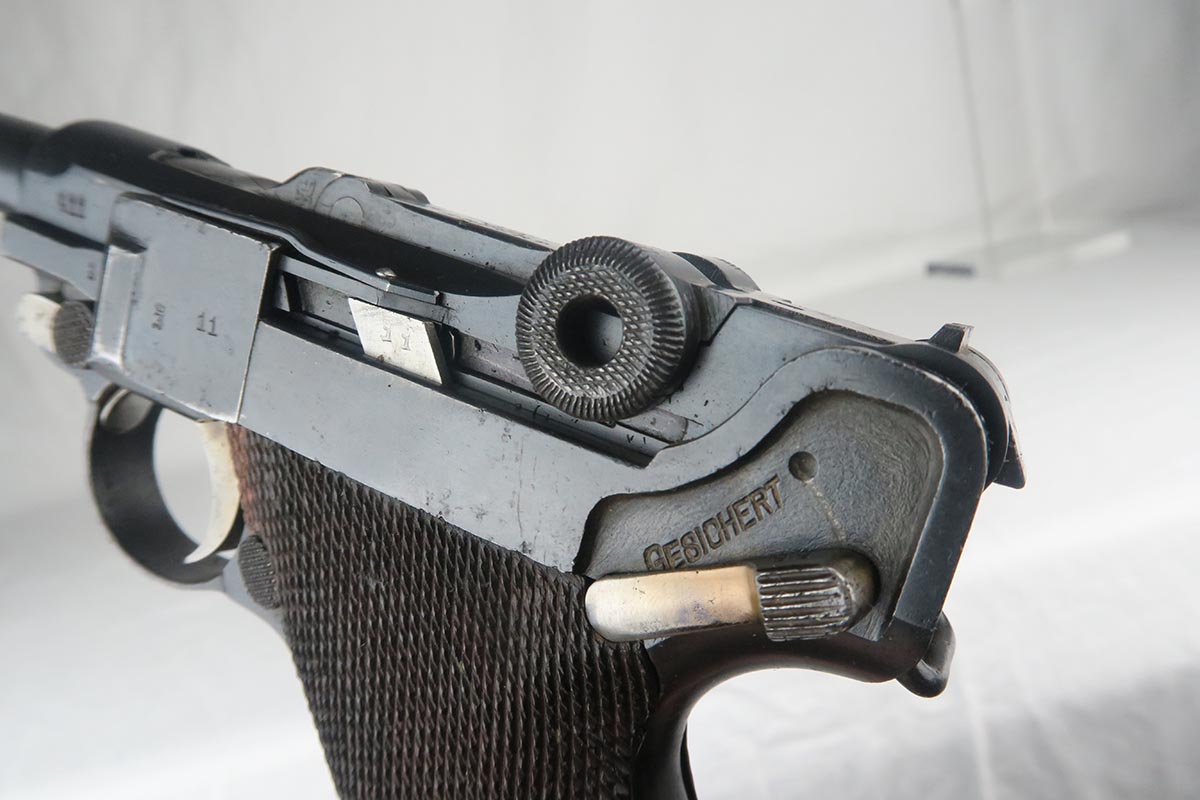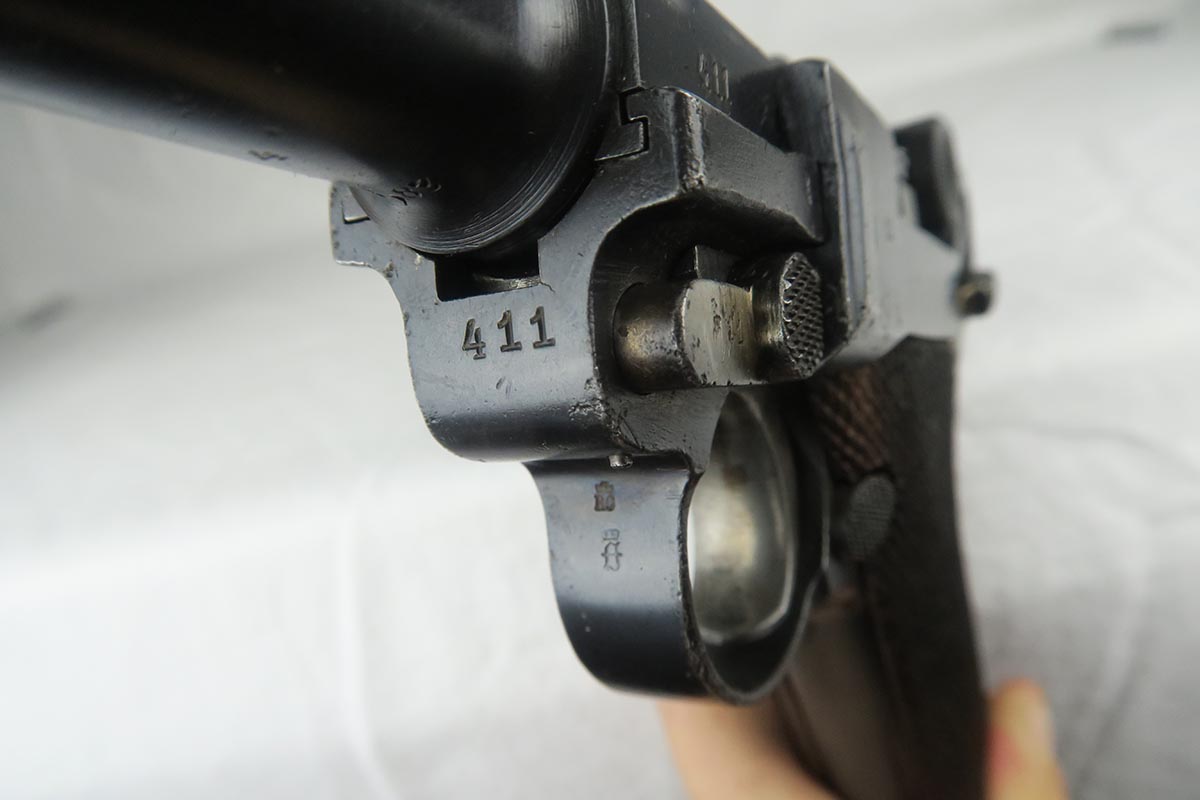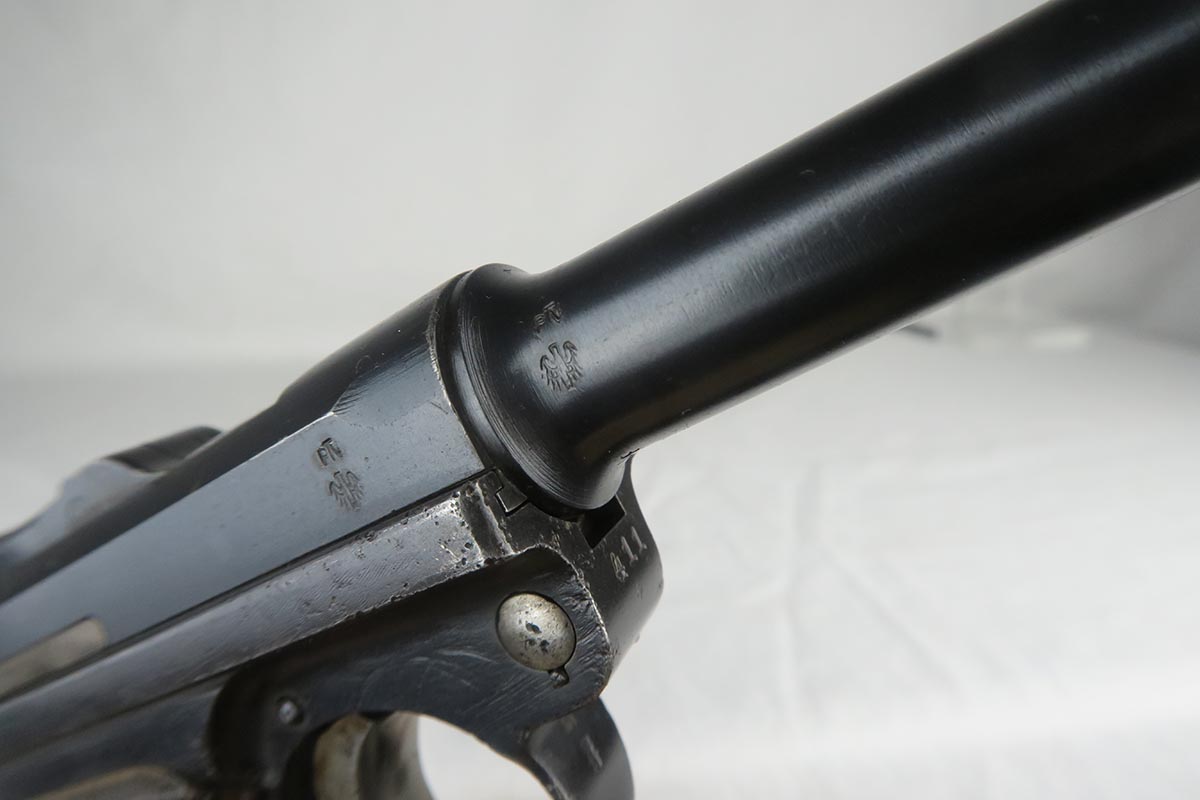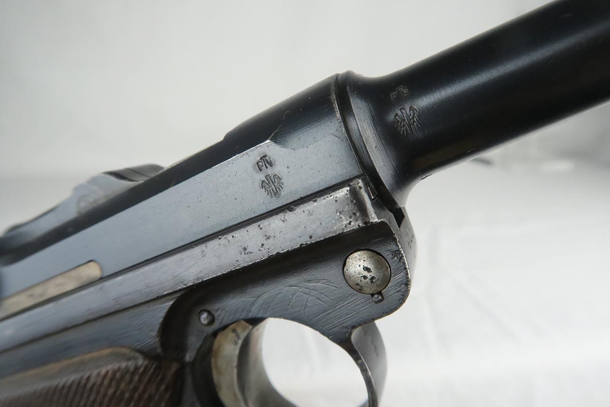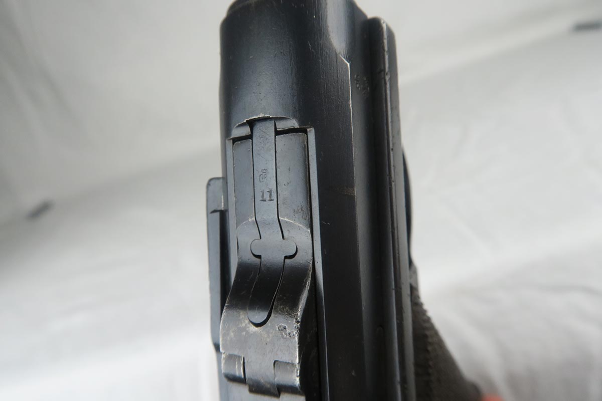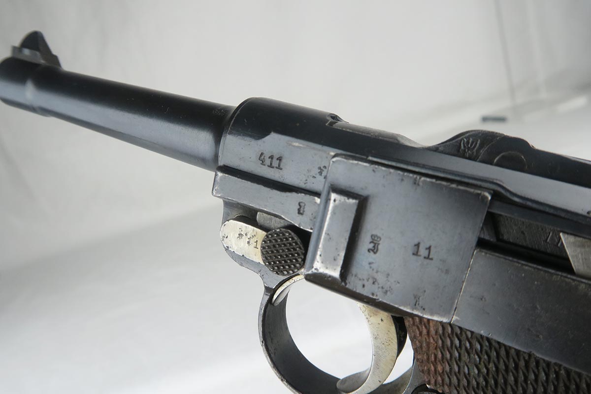7/3/18 – This is an interesting Police-issued Erfurt luger that may have seen use in both wars. The gun is all matching with mostly Erfurt parts, but the receiver was likely added at the police arsenal as it is not dated and the font on the serial is different. The right side of receiver also does not have the usual military acceptance proofs, as this gun was likely reworked between the wars to be reused. Both magazines are numbered to the gun in the police style, numbered 1 & 2. Police sear safety can be seen over the sideplate. There is very little finish loss but there is little surface freckling in a few areas. The grips are numbered and matching to the pistol. The bore is excellent.