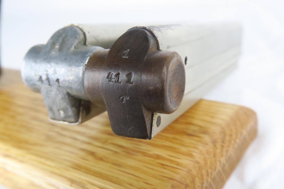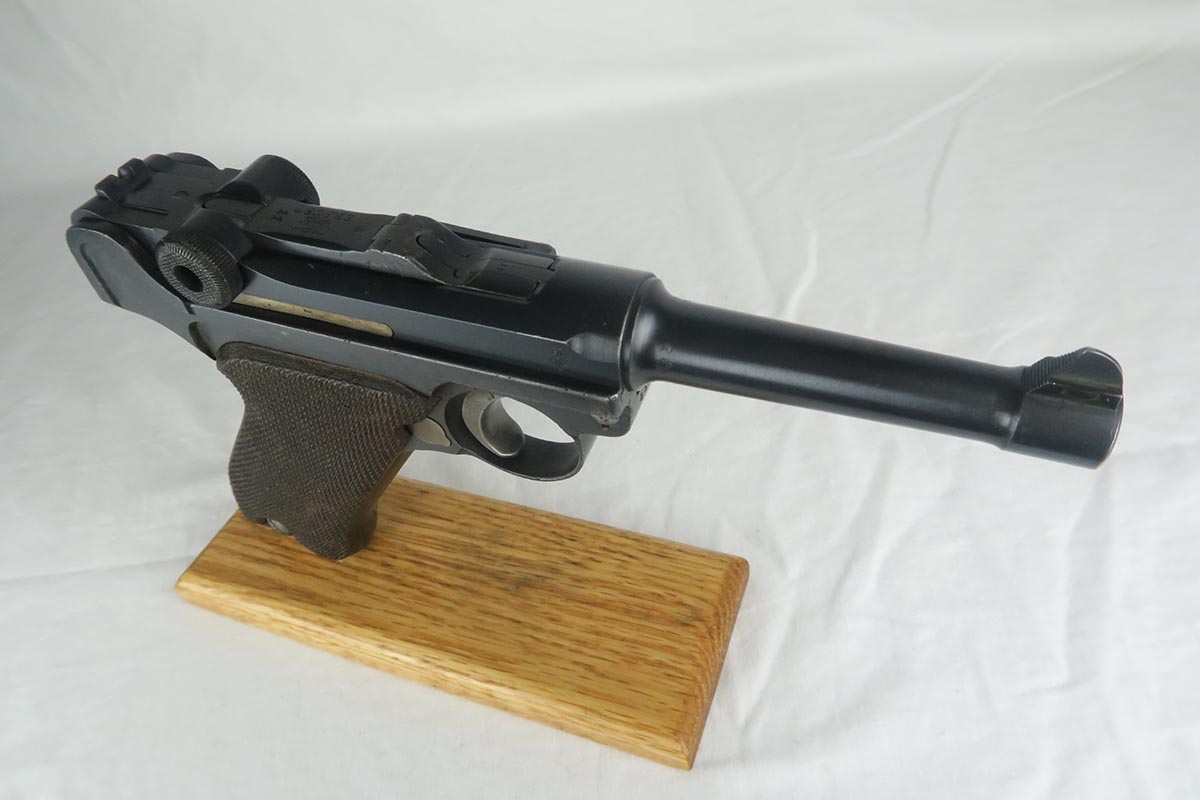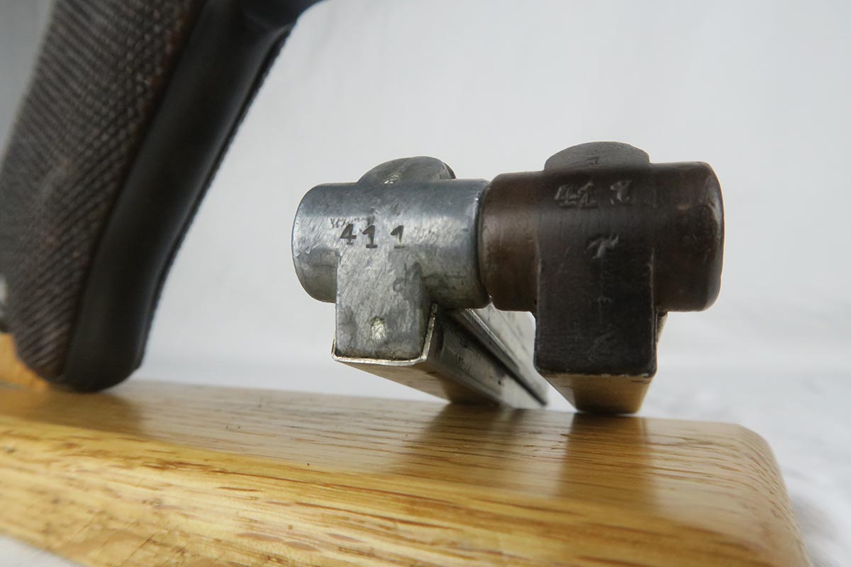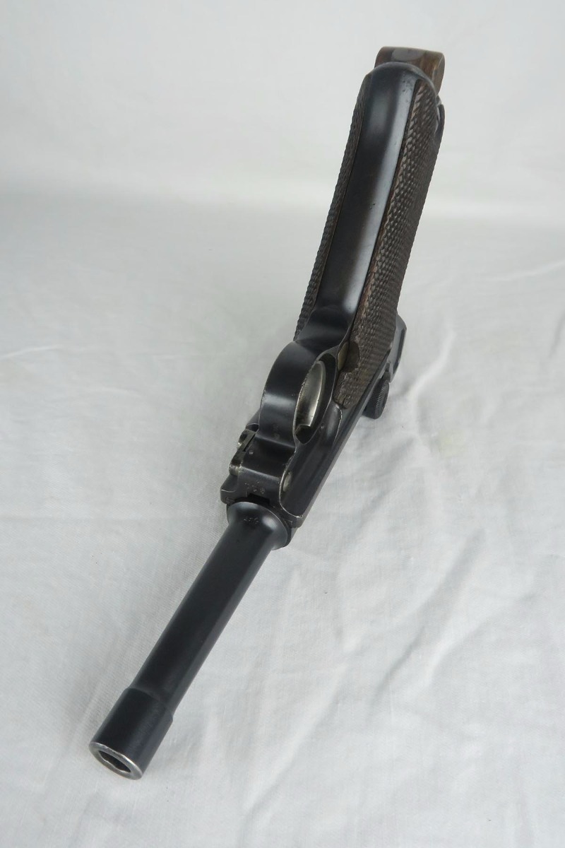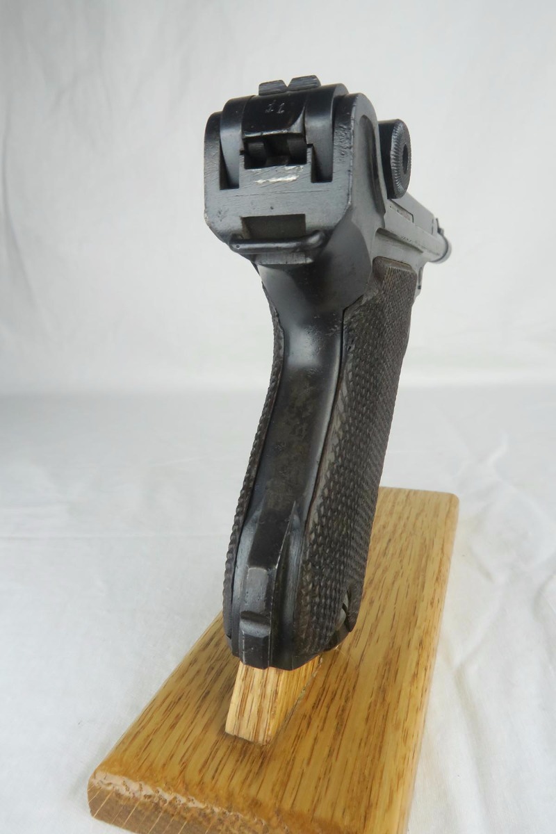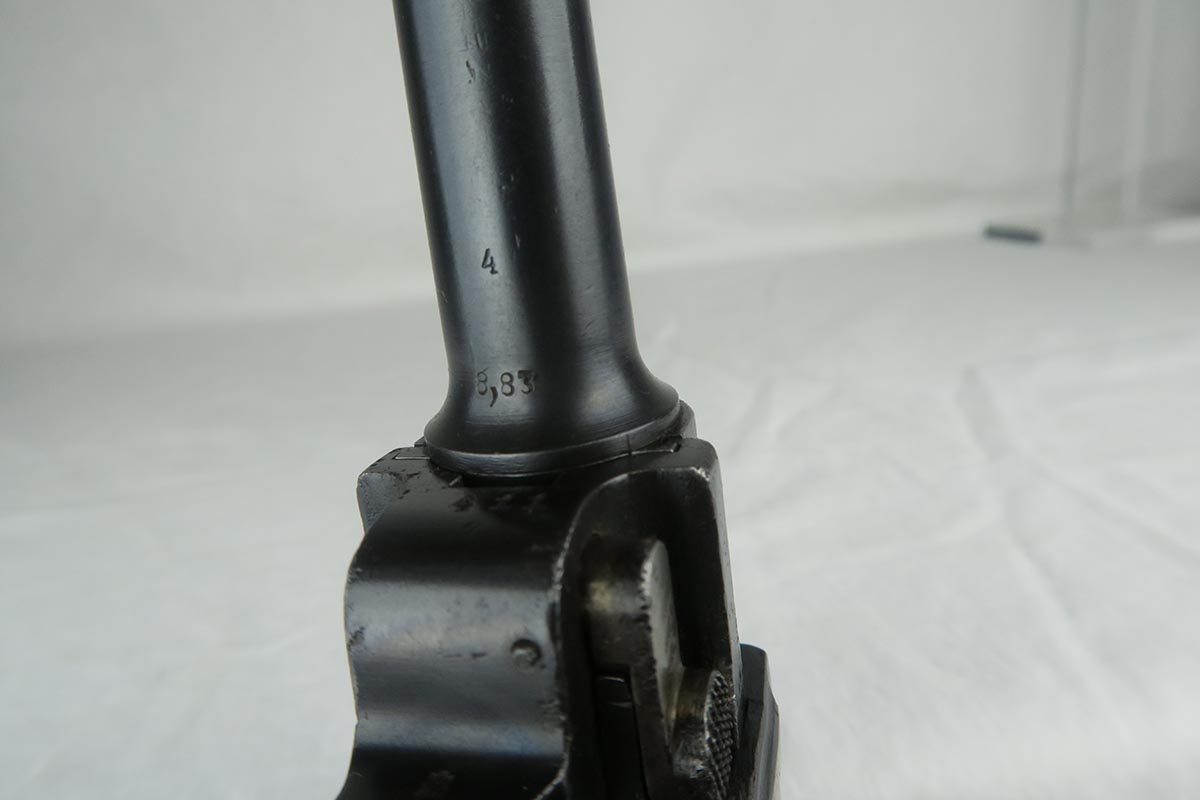 7/3/18 – This is an interesting Police-issued Erfurt luger that may have seen use in both wars. The gun is all matching with mostly Erfurt parts, but the receiver was likely added at the police arsenal as it is not dated and the font on the serial is different. The right side of receiver also does not have the usual military acceptance proofs, as this gun was likely reworked between the wars to be reused. Both magazines are numbered to the gun in the police style, numbered 1 & 2. Police sear safety can be seen over the sideplate. There is very little finish loss but there is little surface freckling in a few areas. The grips are numbered and matching to the pistol. The bore is excellent.