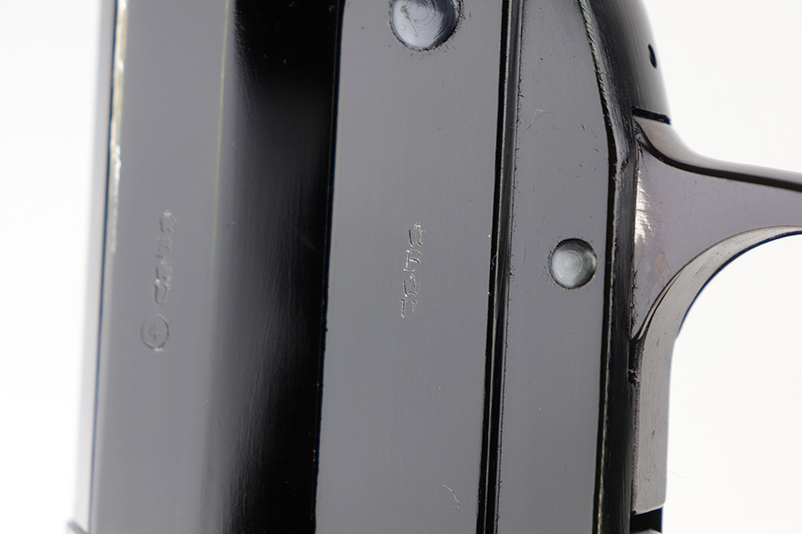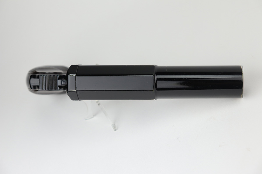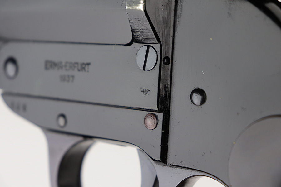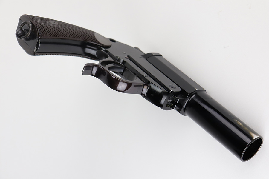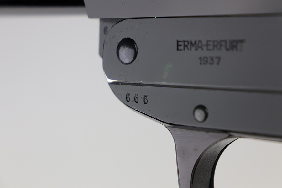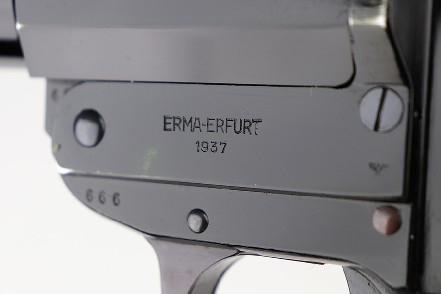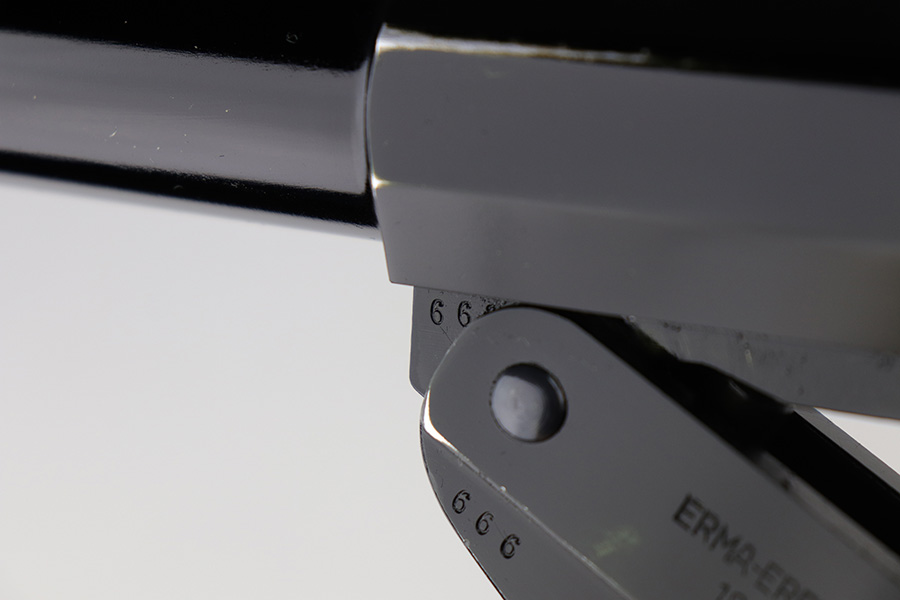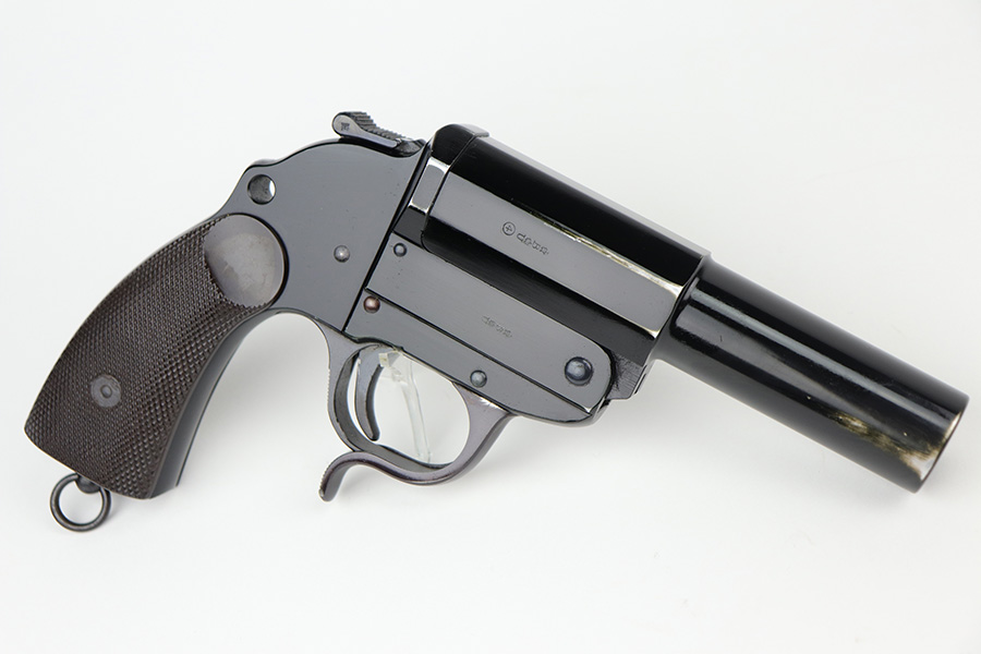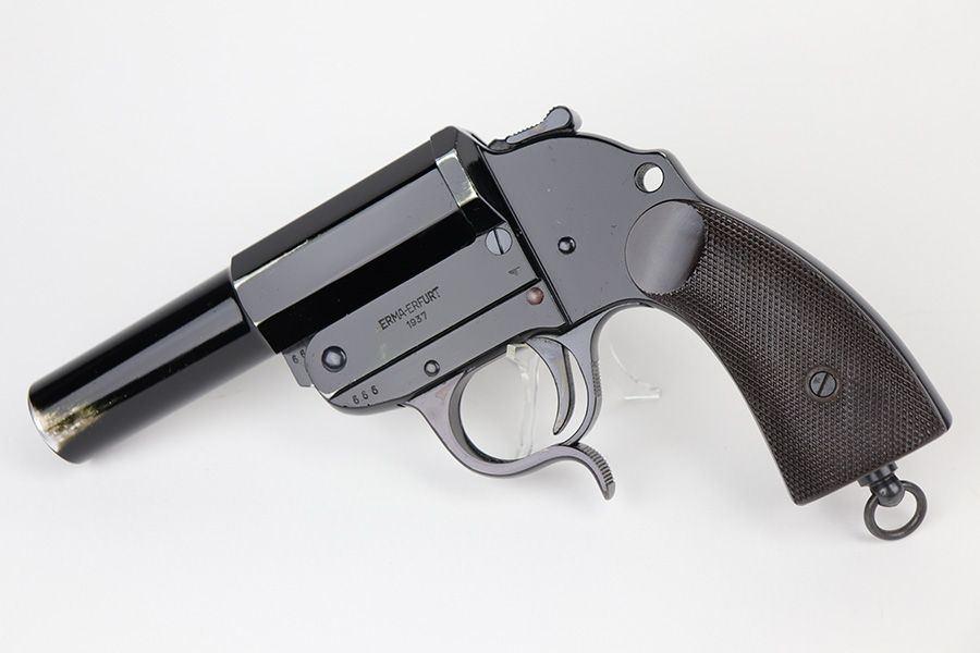 3/4/22 – This is a rare Erma-Erfurt flare gun that was made in 1937 and is in excellent condition. Interestingly, the serial (666) is also the ‘Number of the Beast’, so this is probably the right flare gun for any Iron Maiden fans. Nearly all of the finish loss is on the barrel, either side of the muzzle. The gun has Eagle/L proof on left side, and Crown/BU proofs on the right. Excellent bore. Smooth action.