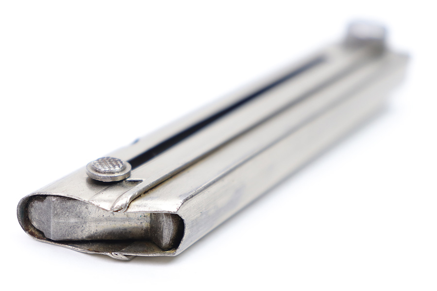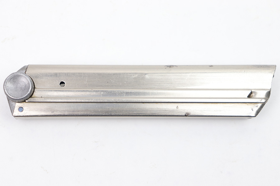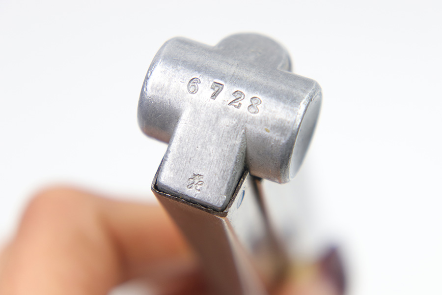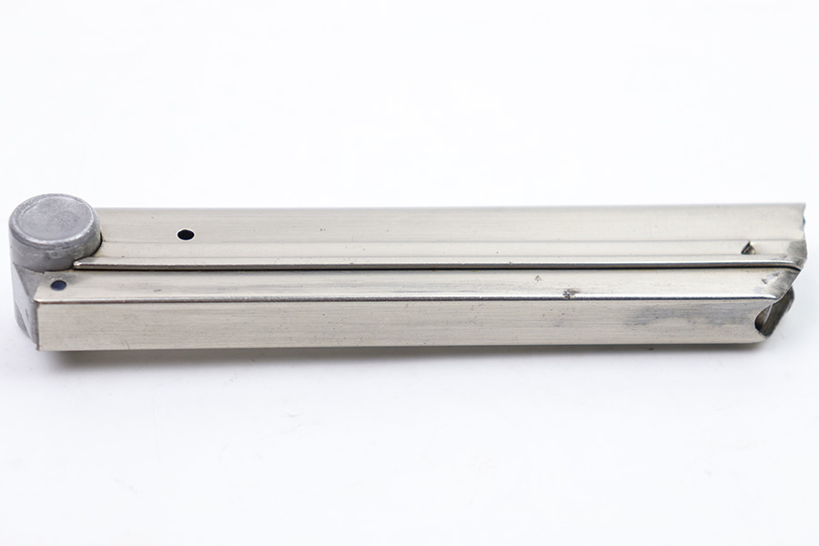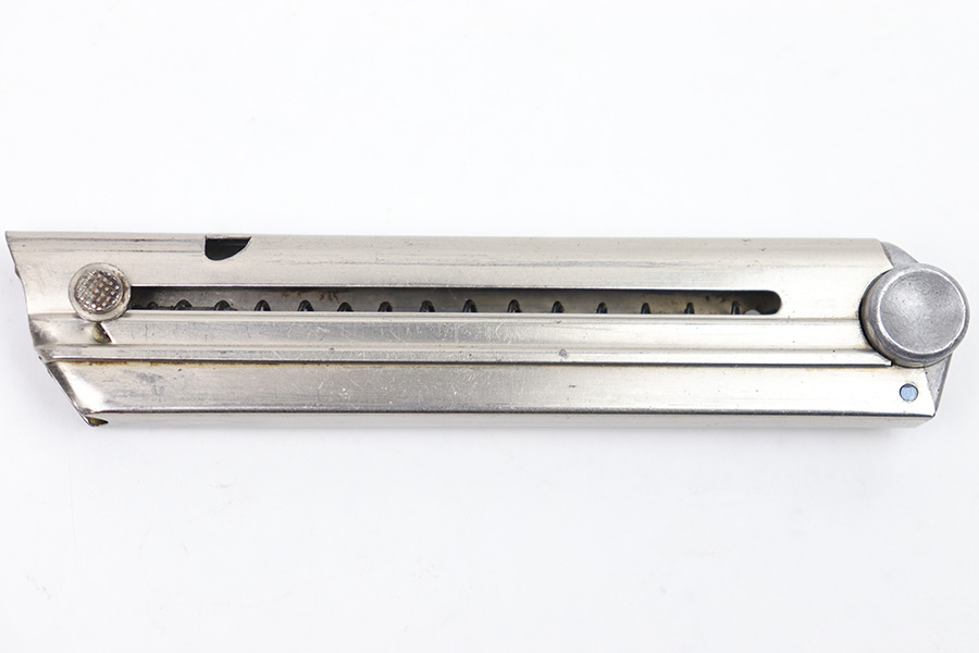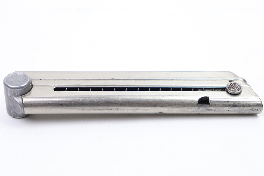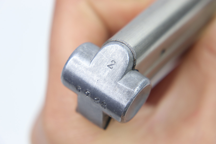 1/11/23 – This is an original WW2 era production Police Luger magazine made by Haenel. The magazine has a nickel tube and aluminum base. The base is serial numbered with a Police number “2” above the serial, and a crown/H Haenel proof stamp underneath the serial number. The tube is excellent with no rust or pitting, but there are a few small spots of surface discoloration. The spring is strong and fully functional.