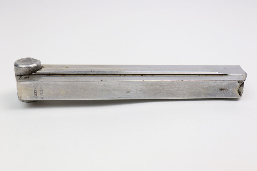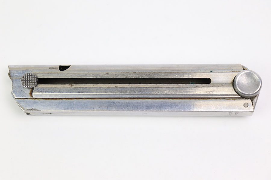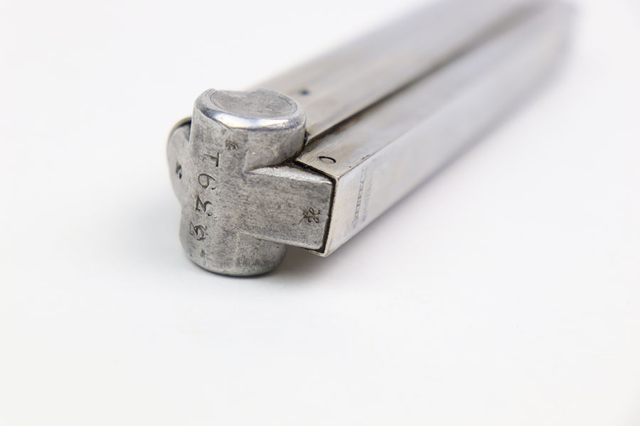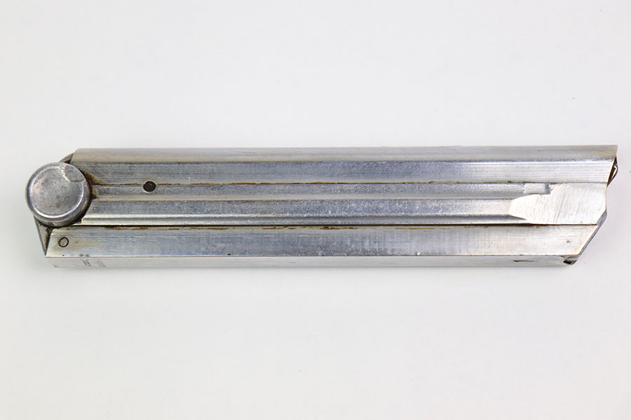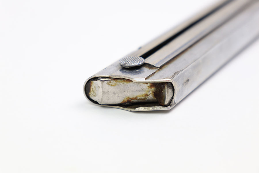 1/22/21 – This is an original WW2 Haenel Luger magazine for a Police Luger. The magazine is in great overall condition with no rust or pitting. The only flaw is a small chip in the left ear of the base. See photos. The base is stamped with a number “3” and serial number “3391” underneath. Also has a Haenel proof stamp, and a stamp on the spine. Strong, functional spring.