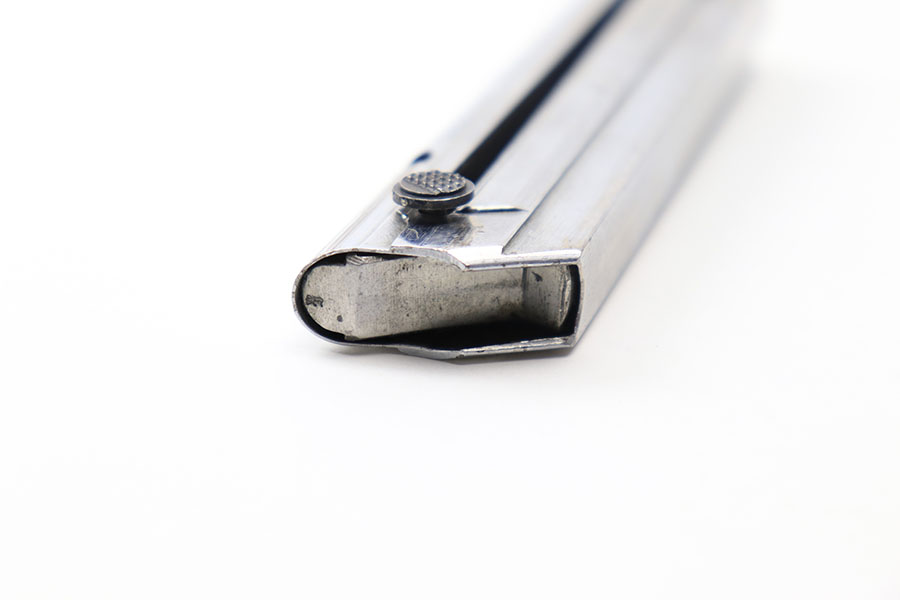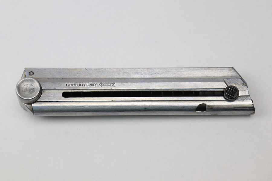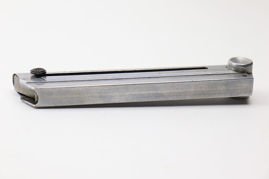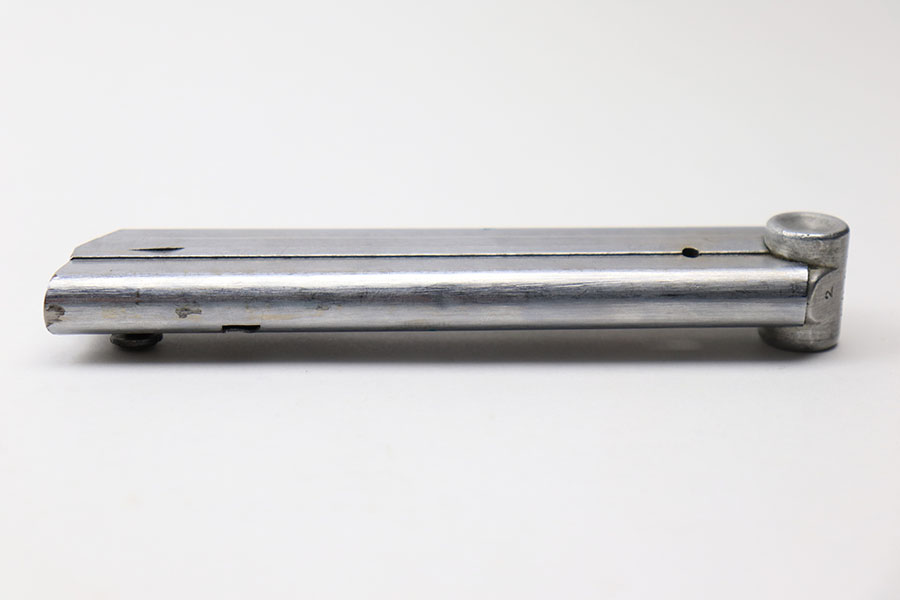 5/14/21 – This is an excellent condition Haenel Police Luger magazine. The magazine is maker stamped on the side of the tube. There’s barely any wear on the tube nor on the base. The base is serial numbered and police numbered “2”. Excellent, fully functional spring.