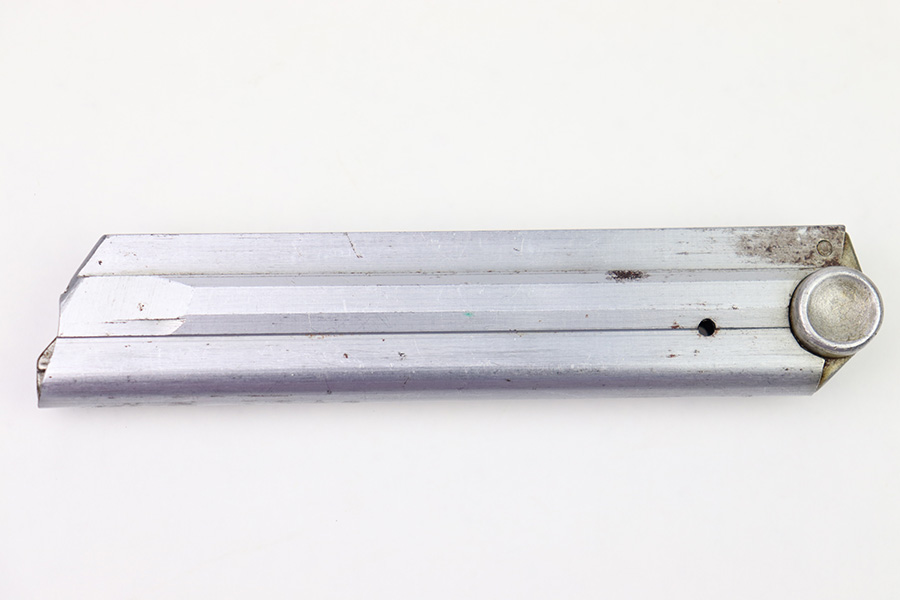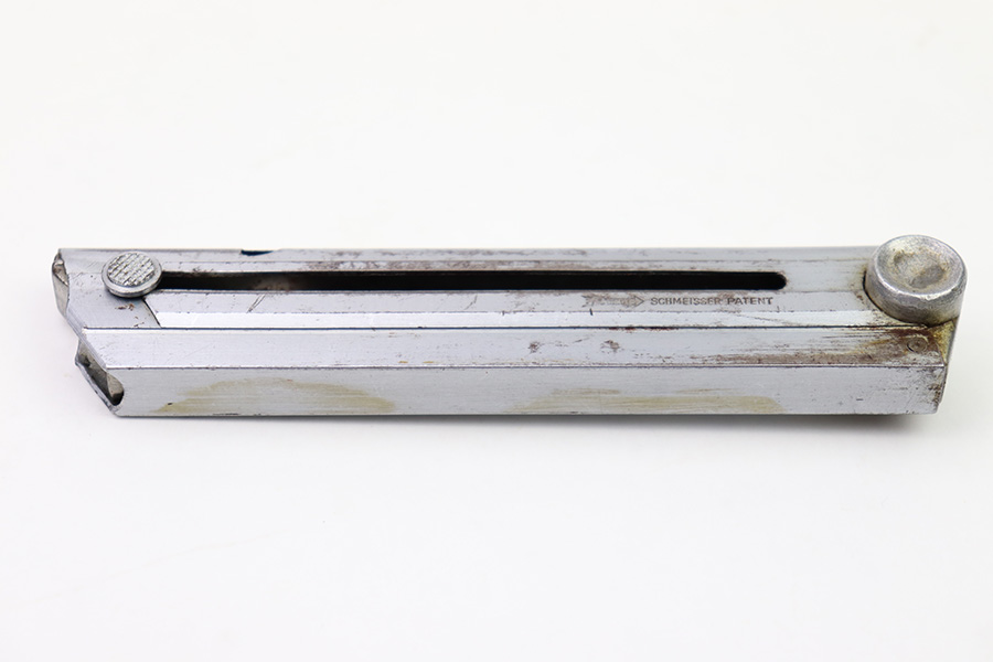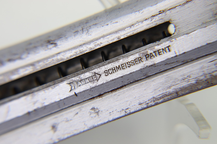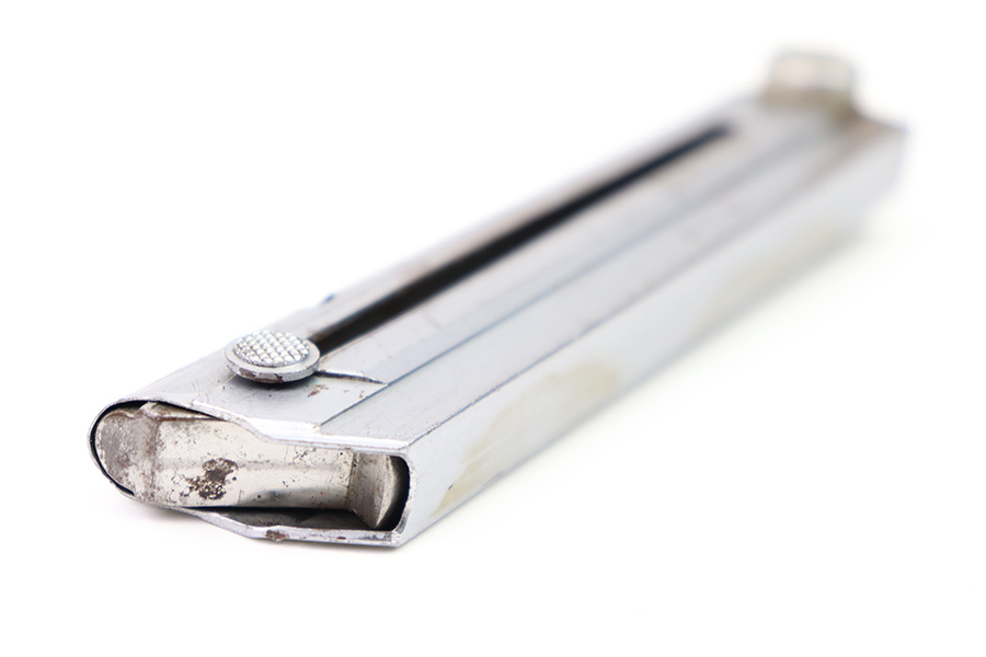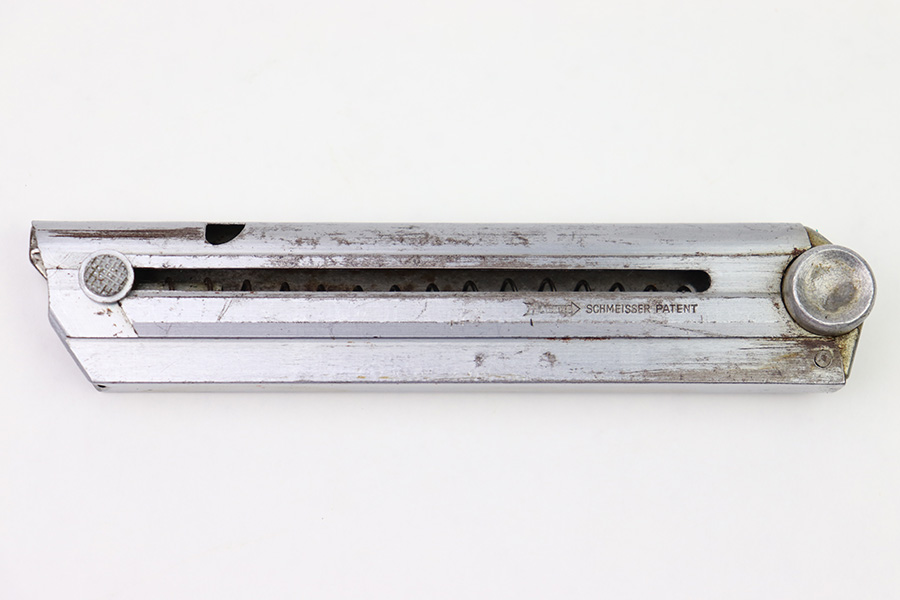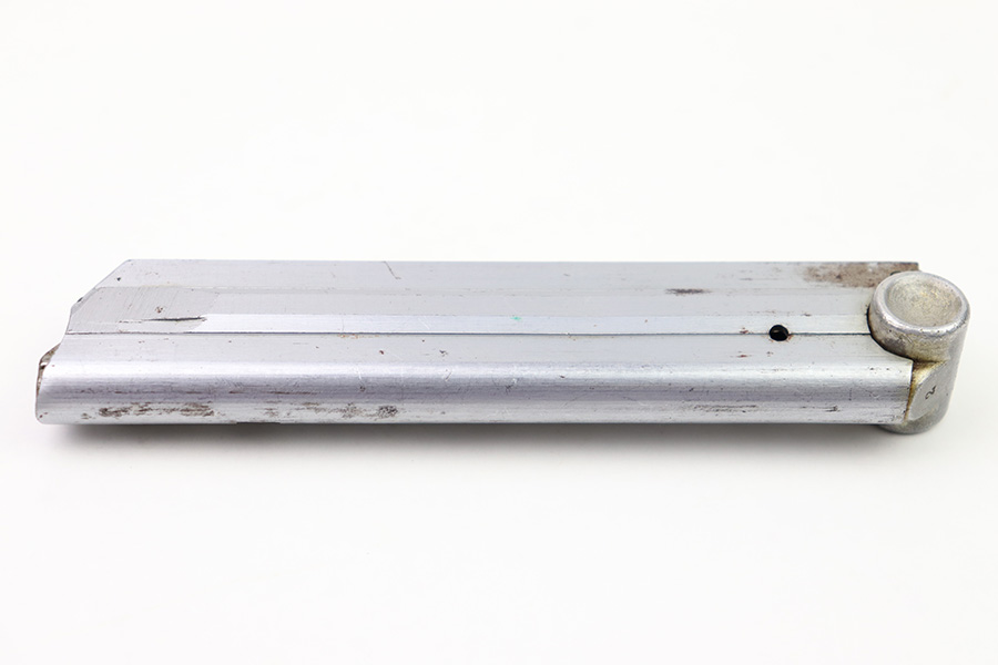 8/3/22 – This is an original WW2 era production Luger magazine. The magazine has a police numbered aluminum base and a police proof stamp. The magazine tube is maker stamped by Haenel. There’s some spotty dark discoloration and surface patina on the tube, but no rust or pitting. Fully functional spring.