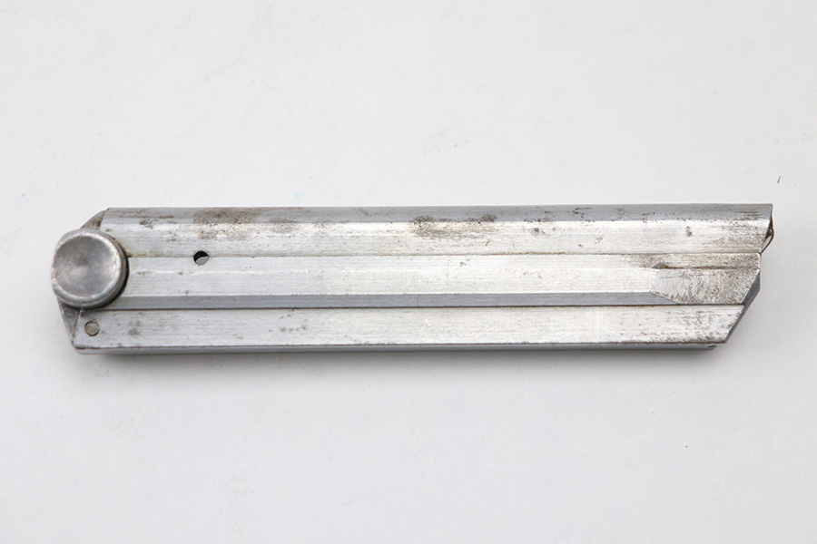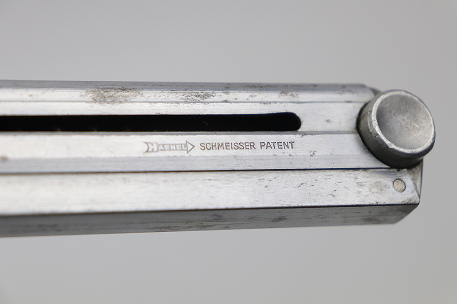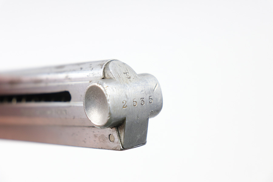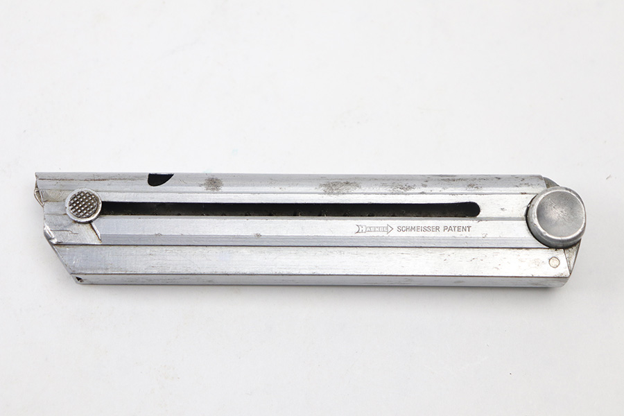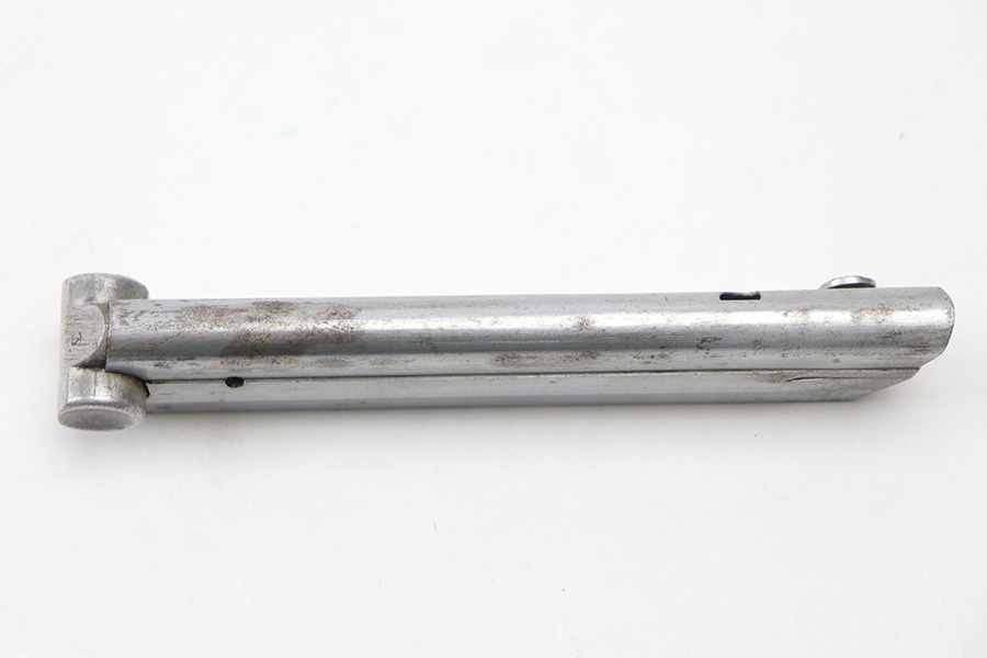 10/27/21 – This is an original Police Haenel Luger magazine from WW2. The magazine has been altered and renumbered on the base, as evidenced by the flattened bottom any shininess around the serial number. The tube has a Haenel maker marking and some mild patina / spotty discoloration. The spring is strong and fully functional.