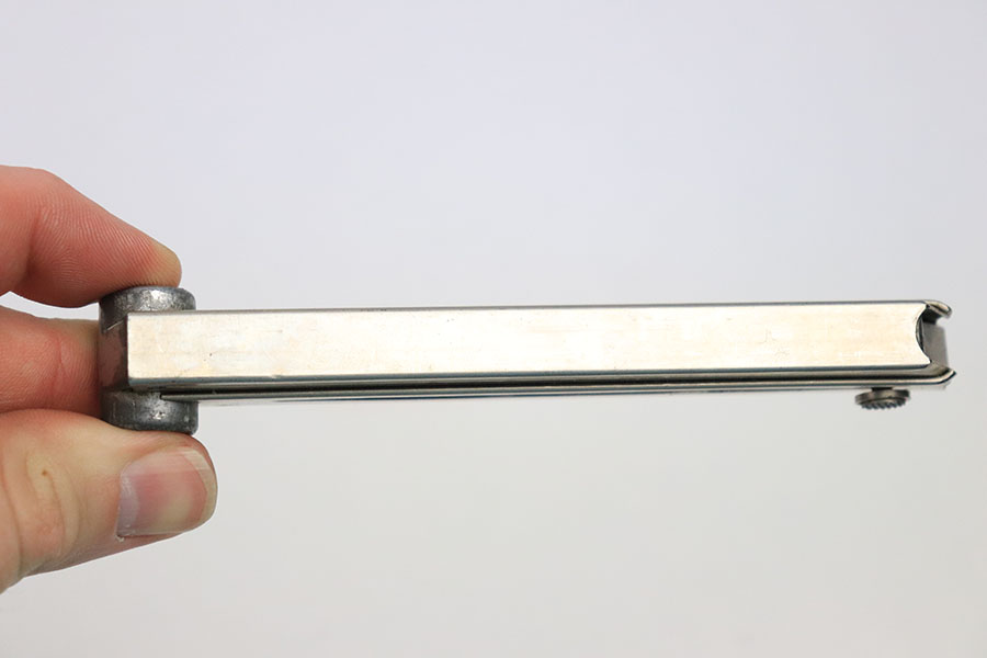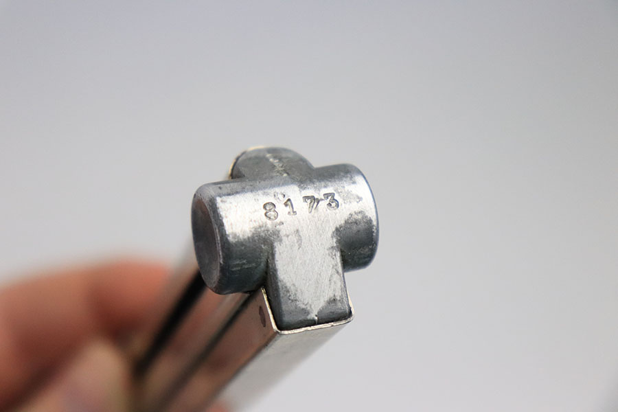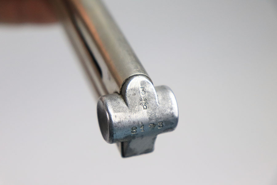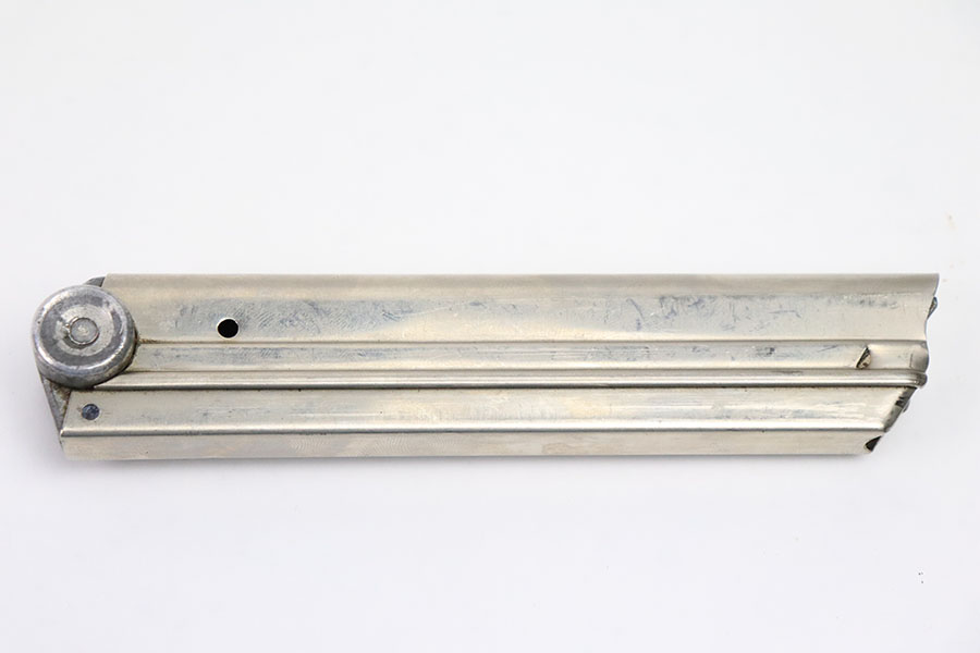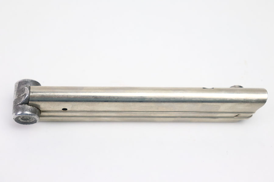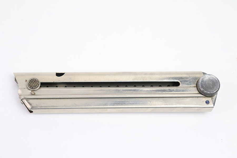 10/10/22 – This is an original WW2 / Weimar era Police luger magazine. The magazine has a nickel tube and aluminum base. The base is “3” numbered and sunburst star over “D” police proof stamped. Below that is a serial number stamp. The tube has no markings or stamps and is in great overall condition with no rust or pitting. The spring is strong and functional.