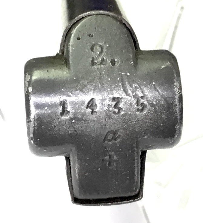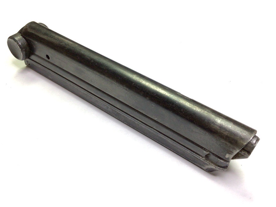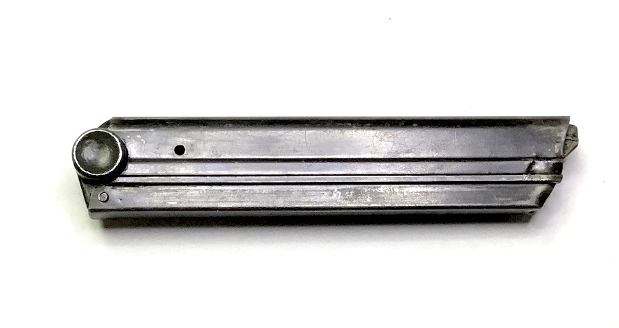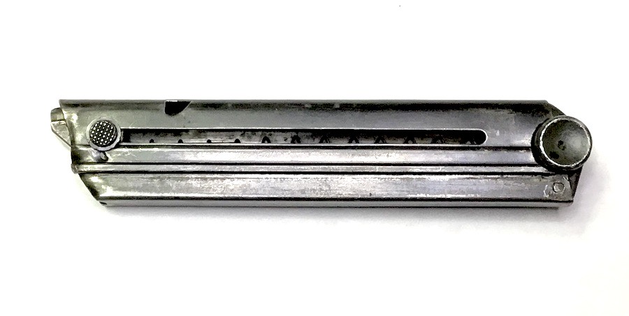 10/19/23 – This is an original WW2 era Police issued Luger magazine. The bottom of the magazine is stamped with a number “2”, meaning this is the spare magazine, and serial numbered 1435. There are no other markings on the magazine. The later style, blued frame has minimal wear with no rust or pitting. The spring is strong and fully functional.