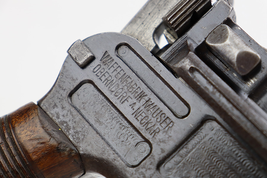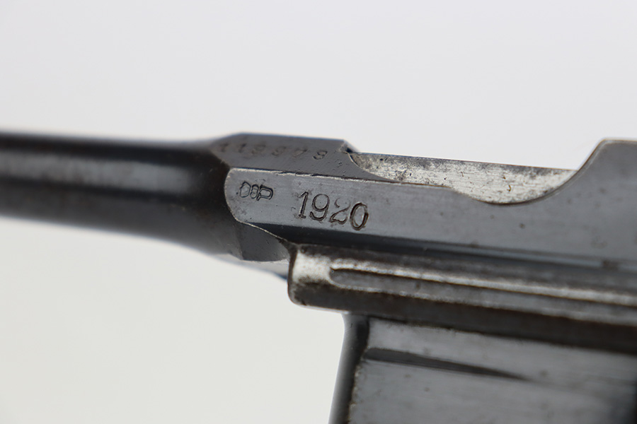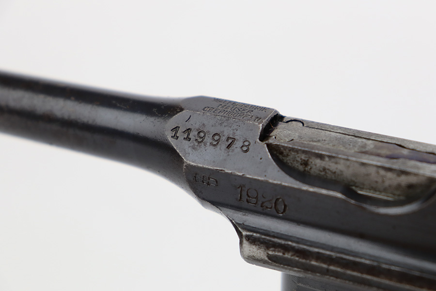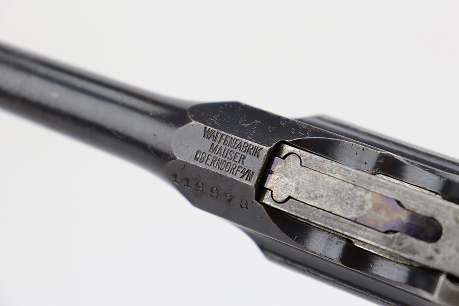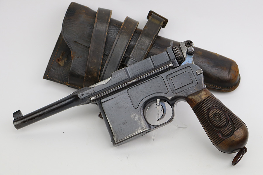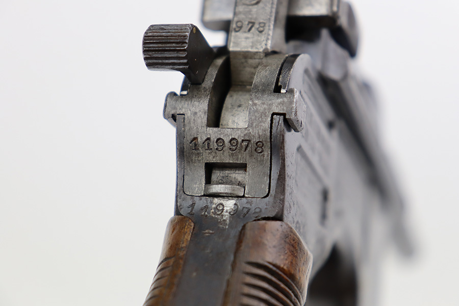 7/7/23 – This is a Mauser C96 “Red 9” pistol that was produced for the German military during WWI and subsequently reworked for the Weimar Police in accordance with the Treaty of Versailles. Blade front and notch rear sights, with a rough milled section in the area where the tangent sight would have been located. Numbers match throughout, including the original grips. 1920 property stamp on left side of receiver. Original finish throughout but some notable wear on the barrel and magazine housing, and some surface rust on the bottom of the frame. Grip frame is unit marked (S.G.I. 2.27). Bore is generally clean but shows some frost and the rifling is a little bit worn. Comes with a modified period original holster.