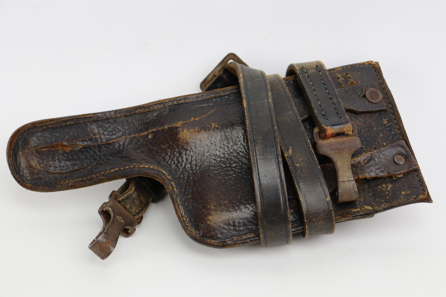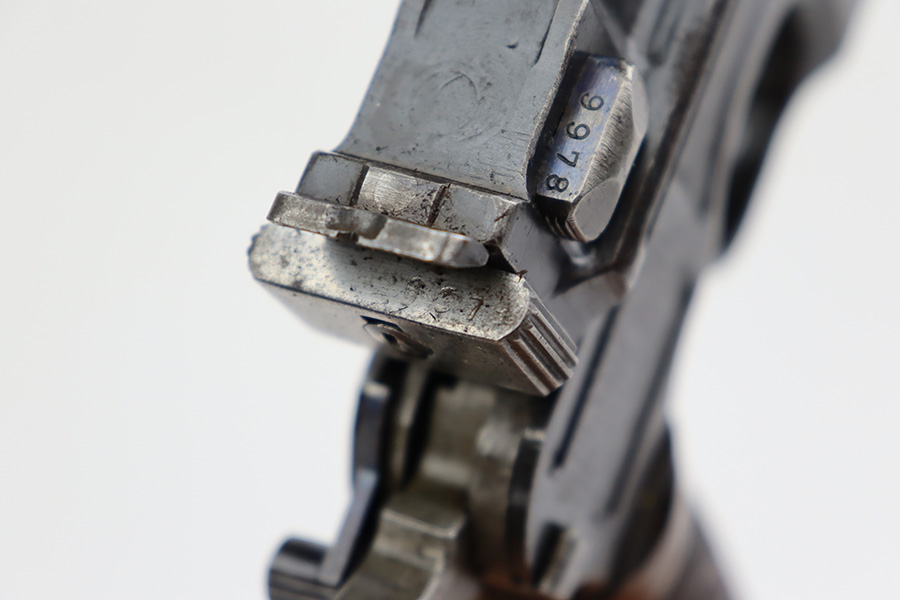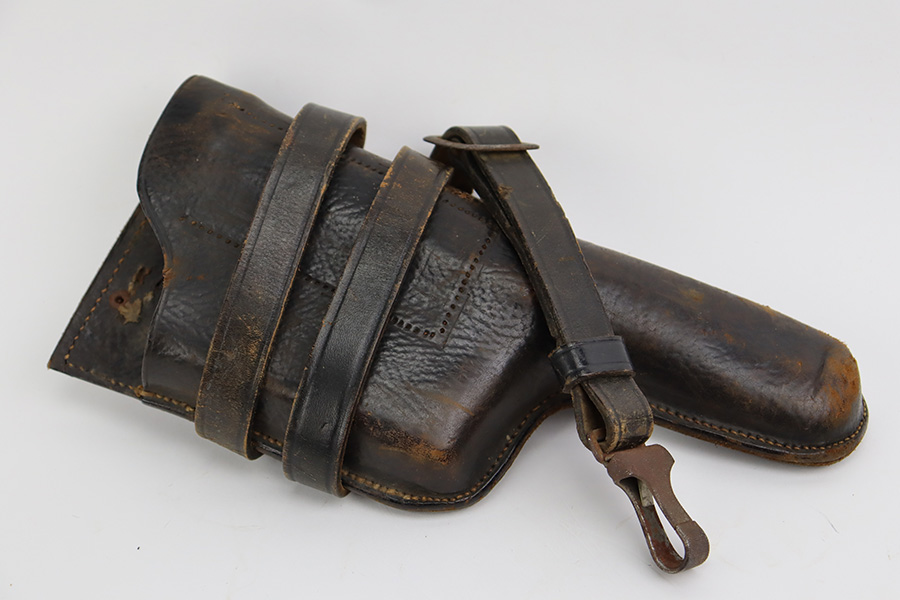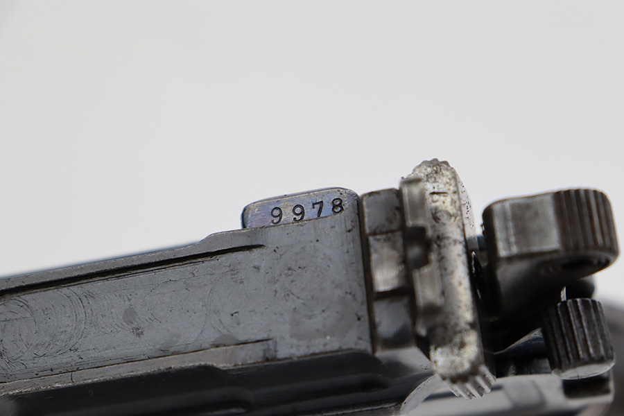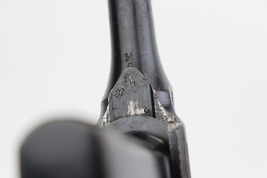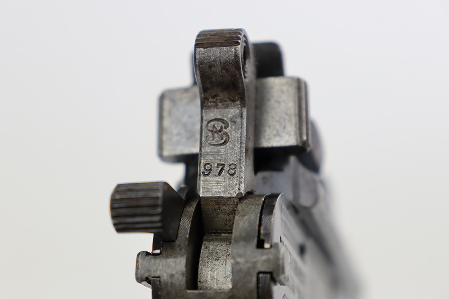 7/7/23 – This is a Mauser C96 “Red 9” pistol that was produced for the German military during WWI and subsequently reworked for the Weimar Police in accordance with the Treaty of Versailles. Blade front and notch rear sights, with a rough milled section in the area where the tangent sight would have been located. Numbers match throughout, including the original grips. 1920 property stamp on left side of receiver. Original finish throughout but some notable wear on the barrel and magazine housing, and some surface rust on the bottom of the frame. Grip frame is unit marked (S.G.I. 2.27). Bore is generally clean but shows some frost and the rifling is a little bit worn. Comes with a modified period original holster.